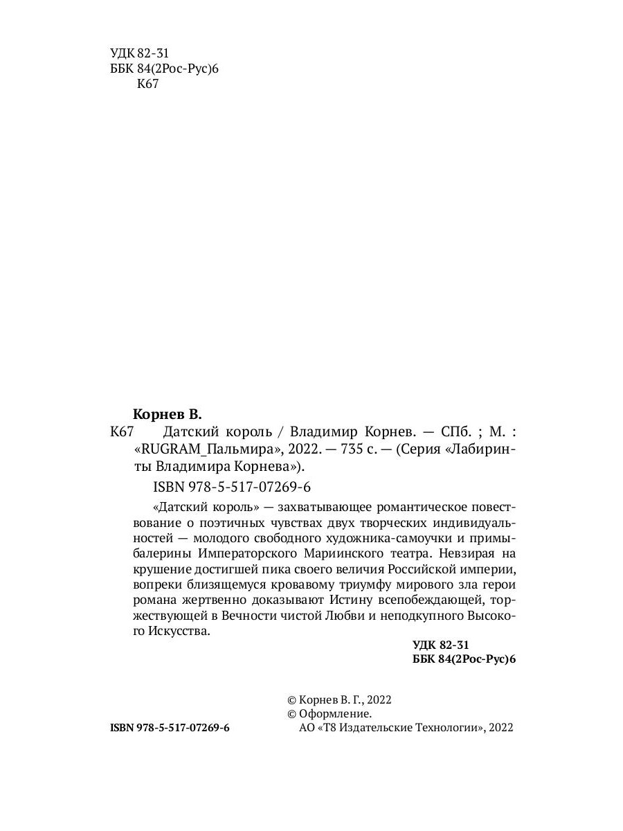 «Датский король» - захватывающее романтическое повествование о поэтичных чувствах двух творческих индивидуальностей - молодого свободного художника-самоучки и примы-балерины Императорского Мариинского театра. Невзирая на крушение достигшей пика своего величия Российской империи, вопреки близящемуся кровавому триумфу мирового зла герои романа жертвенно доказывают Истину всепобеждающей, торжествующей в Вечности чистой Любви и неподкупного Высокого Искусства.| Издательство | Т8 RUGRAM |