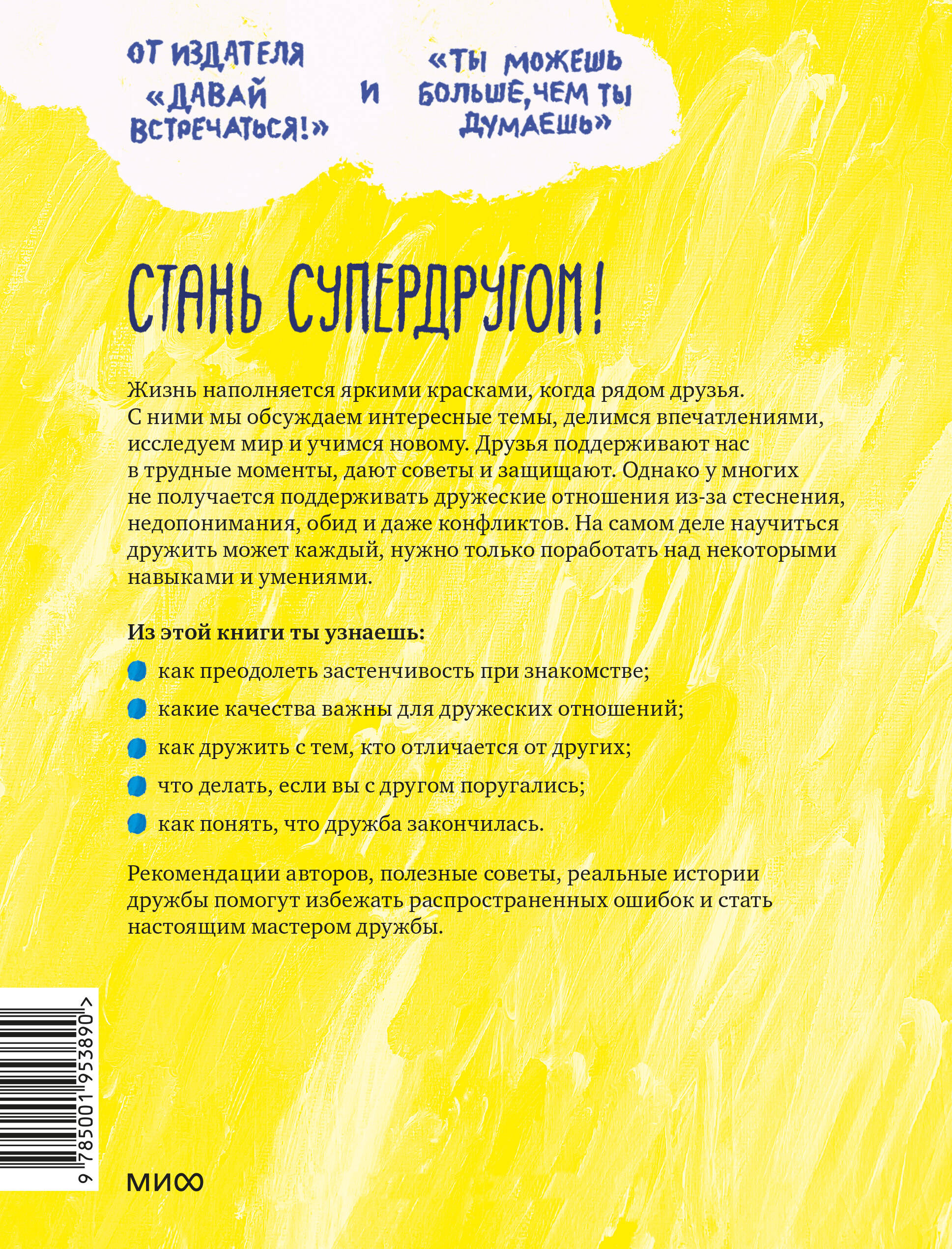 Продолжение серии книг по личному развитию и психологии подростков. Школьники узнают о том, как знакомиться, общаться, находить друзей, выстраивать с ними гармоничные отношения, а также о том, что делать в случае конфликтов, ссор и недопониманий. Отдельная глава книги посвящена общению и дружбе с теми, кто страдает от различных психических и поведенческих расстройств. Доступные примеры, советы и тесты помогут развить социальные навыки, почувствовать себя увереннее в школе и не только. От автора: Я психолог и часто работаю с подростками, помогаю им разобраться, как сделать жизнь более счастливой. Многие из них хотят научиться общаться. Поэтому я решил написать эту книгу: хочу помочь тебе стать счастливее. Я знаю, как важна дружба, и понимаю, какими сложными оказываются иногда отношения друзей. Я расскажу о тех приемах, которым учу своих пациентов. Есть и еще одна причина, по которой я взялся за эту книгу. В детстве я был стеснительным и упустил массу возможностей найти друзей просто потому, что мне было страшно присоединиться к компании ровесников - или я не понимал, как это сделать. А что, если я им не понравлюсь? Или они начнут смеяться? Вдруг мы не найдем общий язык? Еще я не знал, что делать, когда друзья ссорятся. С возрастом я стал понимать, как себя вести, и выработал систему приемов, помогающих знакомиться, поддерживать дружбу и не упускать ни одной интересной возможности. Сейчас у меня много друзей, хотя мне все еще иногда сложно общаться с незнакомыми людьми. Для кого эта книга: Для подростков, которые хотят легко находить друзей. Для родителей, которые хотят помочь своим детям найти единомышленников и построить крепкие дружеские отношения.| Издательство | Манн, Иванов и Фербер |
