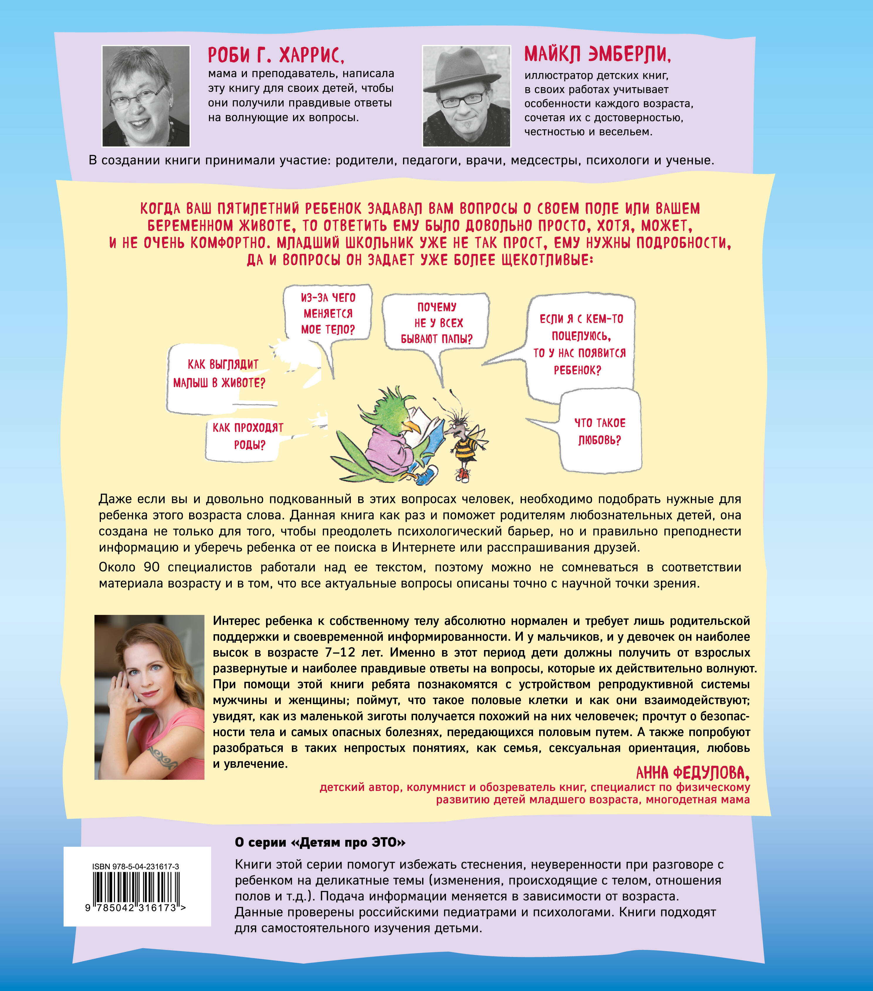 О чем книга: Книга «Давай поговорим о том, откуда берутся дети. О зачатии, рождении, младенцах и семьях» ответит на большинство вопросов ребенка, связанных с яйцеклетками, сперматозоидами, девочками, мальчиками, телами, любовью, дружбе, беременностью, рождением, усыновлением и семьями. Польза книги: Книга «Давай поговорим о том, откуда берутся дети. О зачатии, рождении, младенцах и семьях» сведет к минимуму смущение родителей при разговоре с детьми на щепетильные темы, а последние смогут получить ответы на все вопросы, которые стеснялись задать. Издание даст ребенку знания, сохраняя при этом их физическое и эмоциональное здоровье, при этом он не утратит ощущение чуда при зарождении новой жизни. Об авторах: Роби Г. Харрис - мама и преподаватель, написала эту книгу для своих детей, чтобы они получили правдивые ответы на волнующие их вопросы. Майкл Эмберли - иллюстратор детских книг, в своих работах учитывает особенности каждого возраста, сочетая их с достоверностью, честностью и весельем. Над книгой работало более 90 специалистов: педагоги, врачи, медсестры, акушеры, психологи, ученые. Как пользоваться: Книга подойдет для совместного времяпрепровождением с ребенком, а также для его самостоятельного изучения. НА ОБЛОЖКЕ СТОИТ МАРКИРОВКА 18+ СОГЛАСНО ТРЕБОВАНИЮ ЗАКОНОДАТЕЛЬСТВА. ЭТА КНИГА ОБ АНАТОМИЧЕСКИХ РАЗЛИЧИЯХ МАЛЬЧИКОВ И ДЕВОЧЕК, ПОЛОВОМ РАЗВИТИИ, ВЛЕЧЕНИИ, СЕКСЕ, ЗАЩИТЕ ЛИЧНЫХ ГРАНИЦ. ОНА НЕ БУДЕТ ПРОДАНА ДЕТЯМ В МАГАЗИНЕ. РЕШЕНИЕ О ПОКУПКЕ КНИГИ ПРИНИМАЮТ ТОЛЬКО РОДИТЕЛИ.| Издательство | ООО "Издательство "Эксмо" |