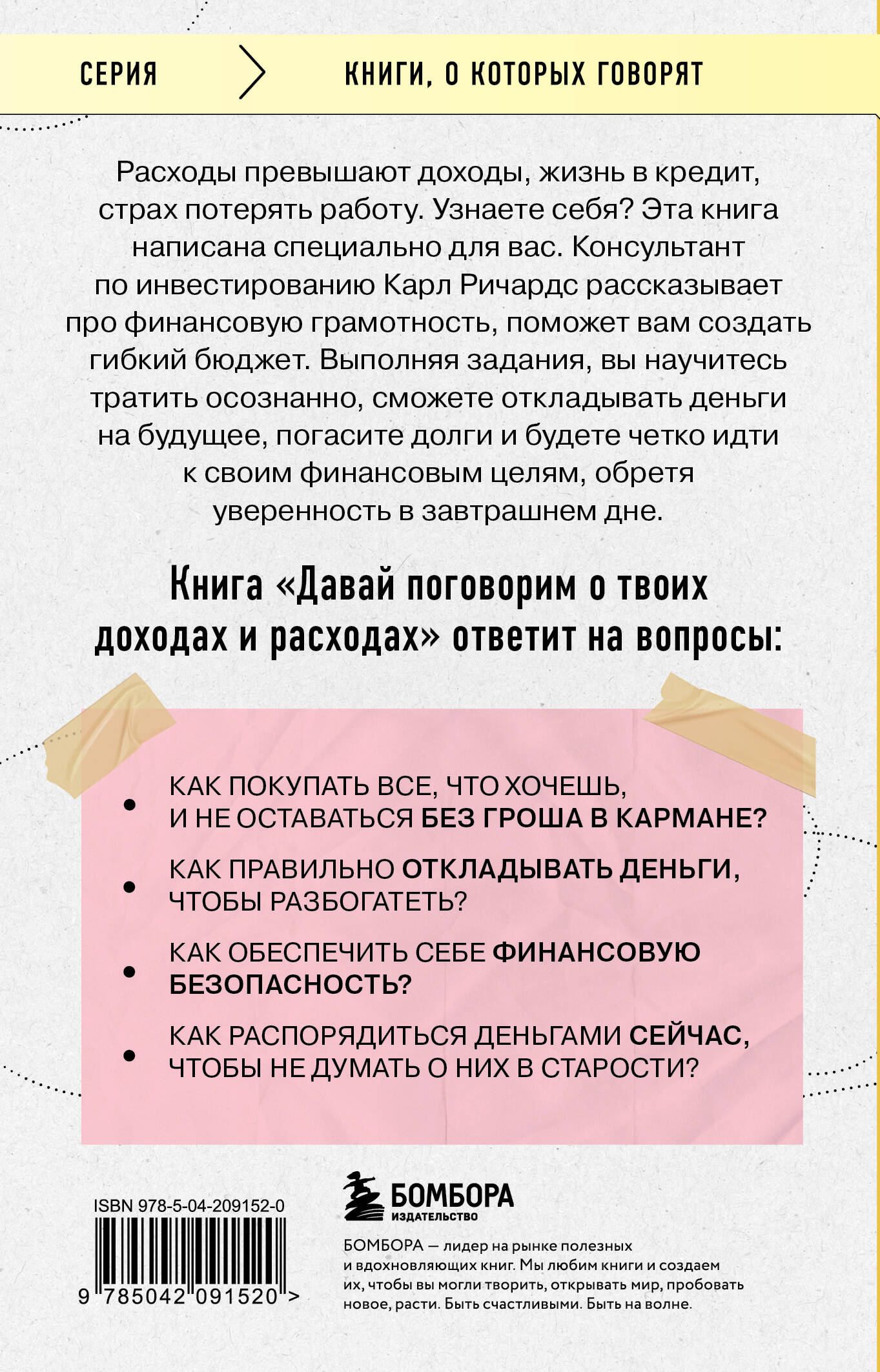Расходы превышают доходы, жизнь в кредит, страх потерять работу. Узнаете себя? Эта книга написана специально для вас. Консультант по инвестированию Карл Ричардс рассказывает про финансовую грамотность, поможет вам создать гибкий бюджет. Выполняя задания, вы научитесь тратить осознанно, сможете откладывать деньги на будущее, погасите долги и будете четко идти к своим финансовым целям, обретя уверенность в завтрашнем дне. Книга «Давай поговорим о твоих доходах и расходах» ответит на вопросы: - как покупать все, что хочешь, и не оставаться без гроша в кармане? - как правильно откладывать деньги, чтобы разбогатеть? - как обеспечить себе финансовую безопасность? - как распорядиться деньгами сейчас, чтобы не думать о них в старости?