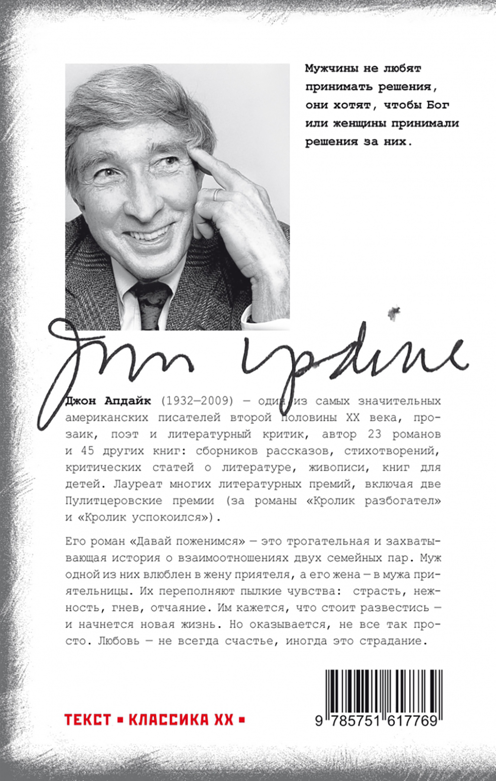 Выдающийся писатель Джон Апдайк (1932-2009) - один из самых талантливых американских литераторов. Его роман «Давай поженимся» стал бестселлером. Это трогательная и захватывающая история о взаимоотношениях двух семейных пар. Муж одной из них влюблен в жену приятеля, а его жена - в приятеля мужа. Их переполняют пылкие чувства: страсть, нежность, гнев, отчаяние. Им кажется, что стоит развестись - и начнется новая жизнь. Но оказывается, они не готовы быть вместе. Любовь - не всегда счастье, иногда это страдание.