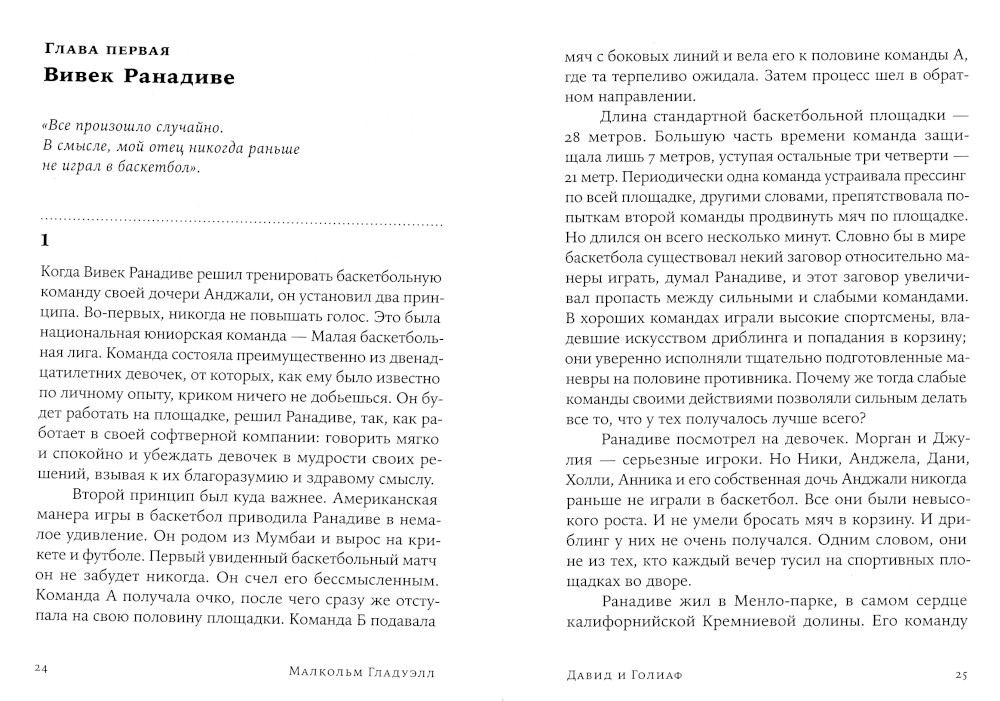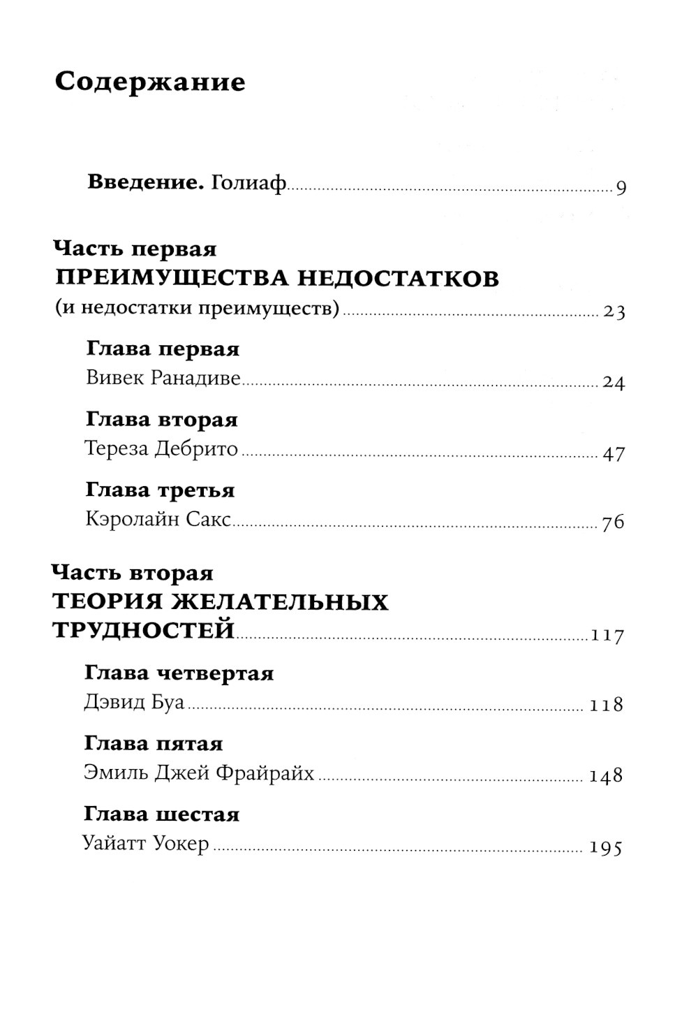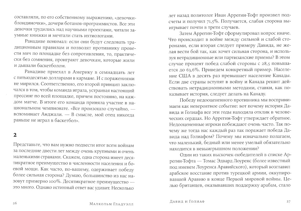 Автор мировых бестселлеров журналист The New Yorker Малкольм Гладуэлл, вдохновленный библейской историей противостояния Давида и Голиафа, анализирует феномен победы слабого над сильным. На примерах реальных людей - голливудского миллионера, заработавшего первые доллары в 10 лет на уборке улиц; тренера, использовавшего для победы слабой баскетбольной команды особую стратегию игры; врача, упорно искавшего способы борьбы с детской лейкемией; бесстрашного борца за гражданские права в эпицентре расовой дискриминации и других отважных людей, сумевших справиться с непреодолимыми на первый взгляд проблемами, - Гладуэлл показывает, что слабый человек, наделенный волей, находчивостью и обостренным чувством справедливости, способен победить даже самого сильного противника.| Издательство | Альпина Паблишер |