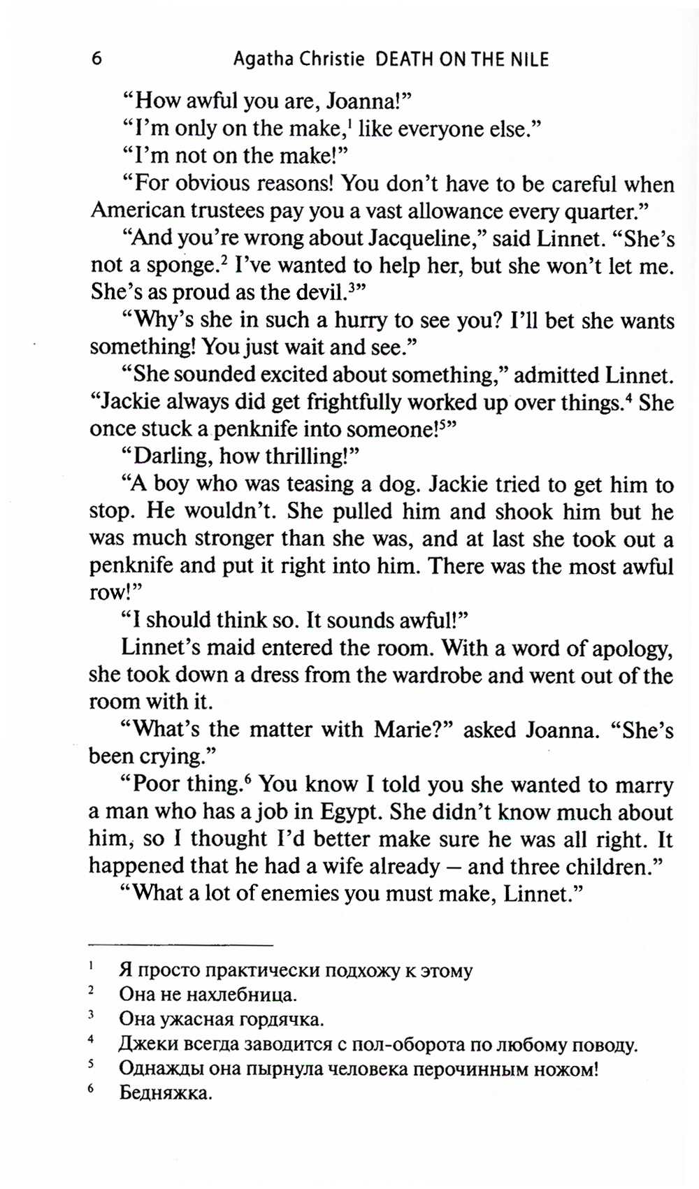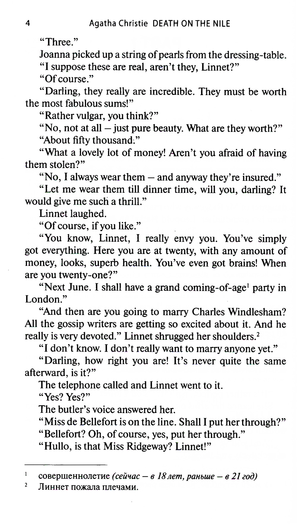 Очень состоятельная девушка знакомится с женихом своей лучшей подруги. Через несколько месяцев после знакомства она выходит за него замуж, а подруга остаётся ни с чем. Супружеская пара отправляется в Египет, чтобы провести медовый месяц, но там они сталкиваются с преследующей их брошенной невестой. И вот на роскошном пароходе «Карнак» убита молодая миллионерша, которая недавно вышла замуж и, как выясняет в ходе расследования Эркюль Пуаро, имела много врагов среди пассажиров. Любой мог убить самоуверенную девушку, укравшую жениха у своей подруги. Интригующий сюжет держит в напряжении до самого конца. Трое пассажиров путешествуют при оружии. Автор подбрасывает улики то против одного героя, то против другого. Но ни один из вероятных подозреваемых не совершал этого преступления. Это сделал человек, чьё участие в убийстве поначалу кажется невозможным… Текст сокращён и адаптирован. Уровень B1.| Издательство | Антология |