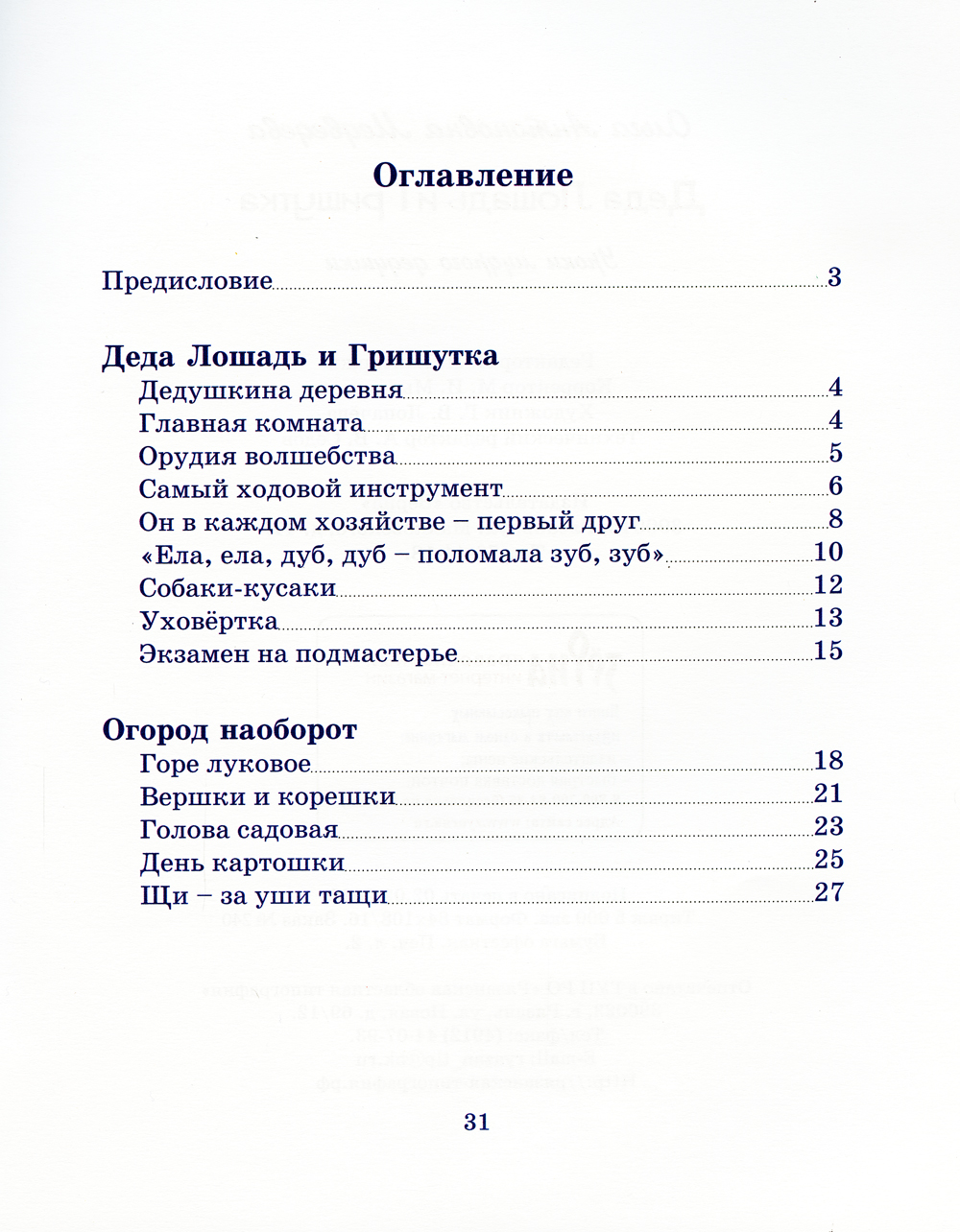Книга рассказывает о маленьком Гришутке, который провёл в деревне у дедушки целое лето. Знакомство с деревенской жизнью обернулось для мальчика множеством интересных и увлекательных открытий. В первой части книги дед знакомит внука со столярными инструментами. Во второй части Гришутка с дедушкой помогают приехавшей в отпуск маме-горожанке освоиться в огороде.| Издательство | Зёрна |