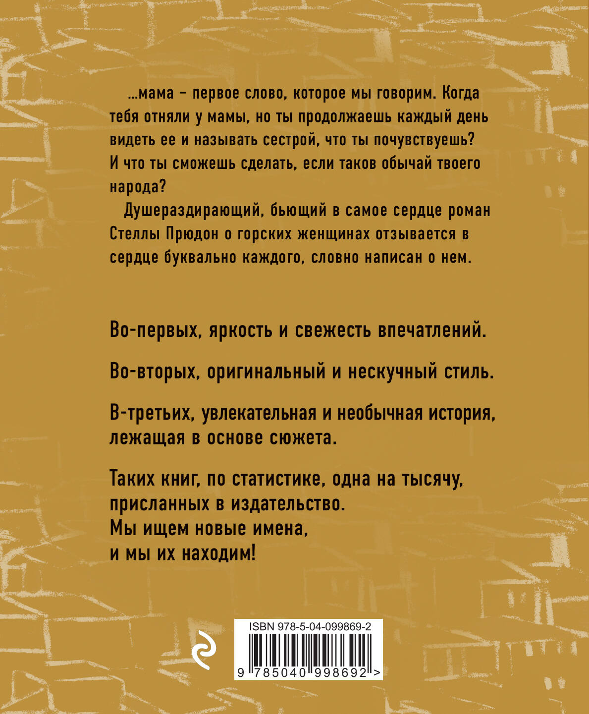 ...мама - первое слово, которое мы говорим. Когда тебя отняли у мамы, но ты продолжаешь каждый день видеть ее и называть сестрой, что ты почувствуешь? И что ты сможешь сделать, если таков обычай твоего народа? Душераздирающий, бьющий в самое сердце роман Стеллы Прюдон о горских женщинах отзывается в сердце буквально каждого, словно написан о нем.