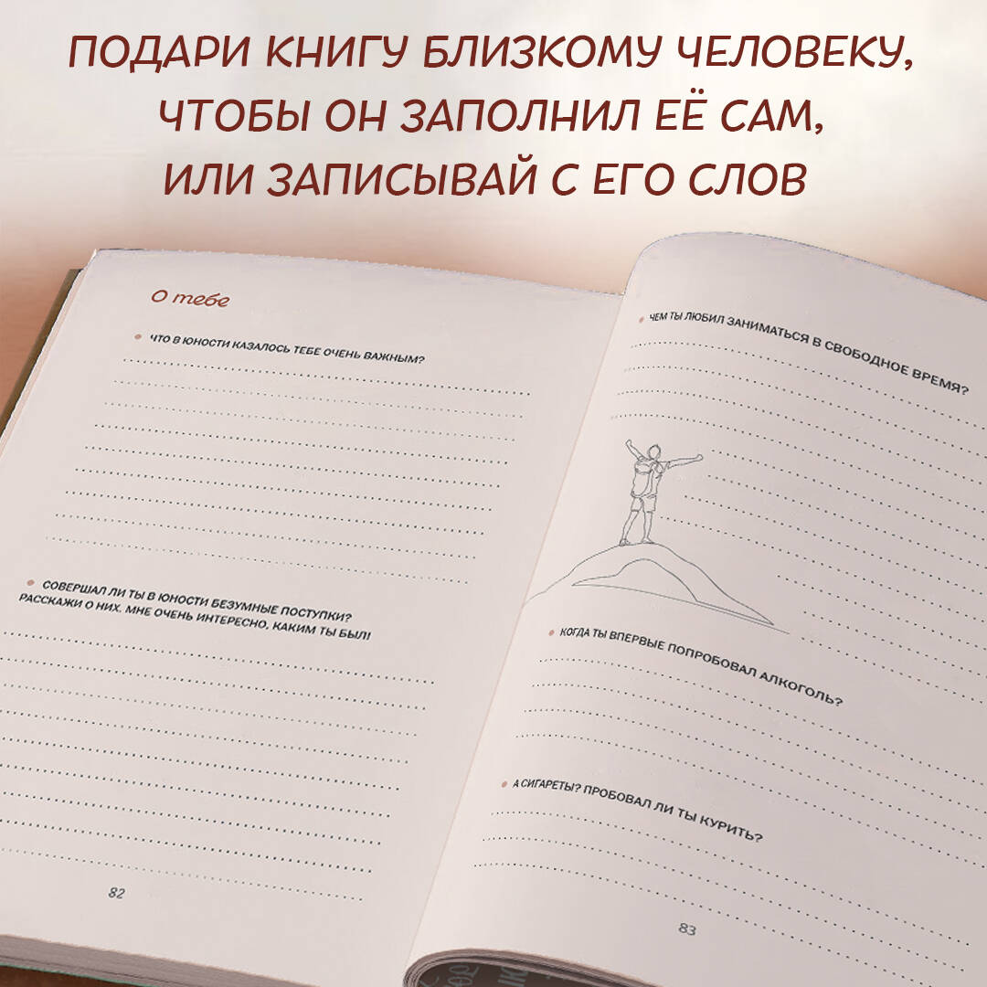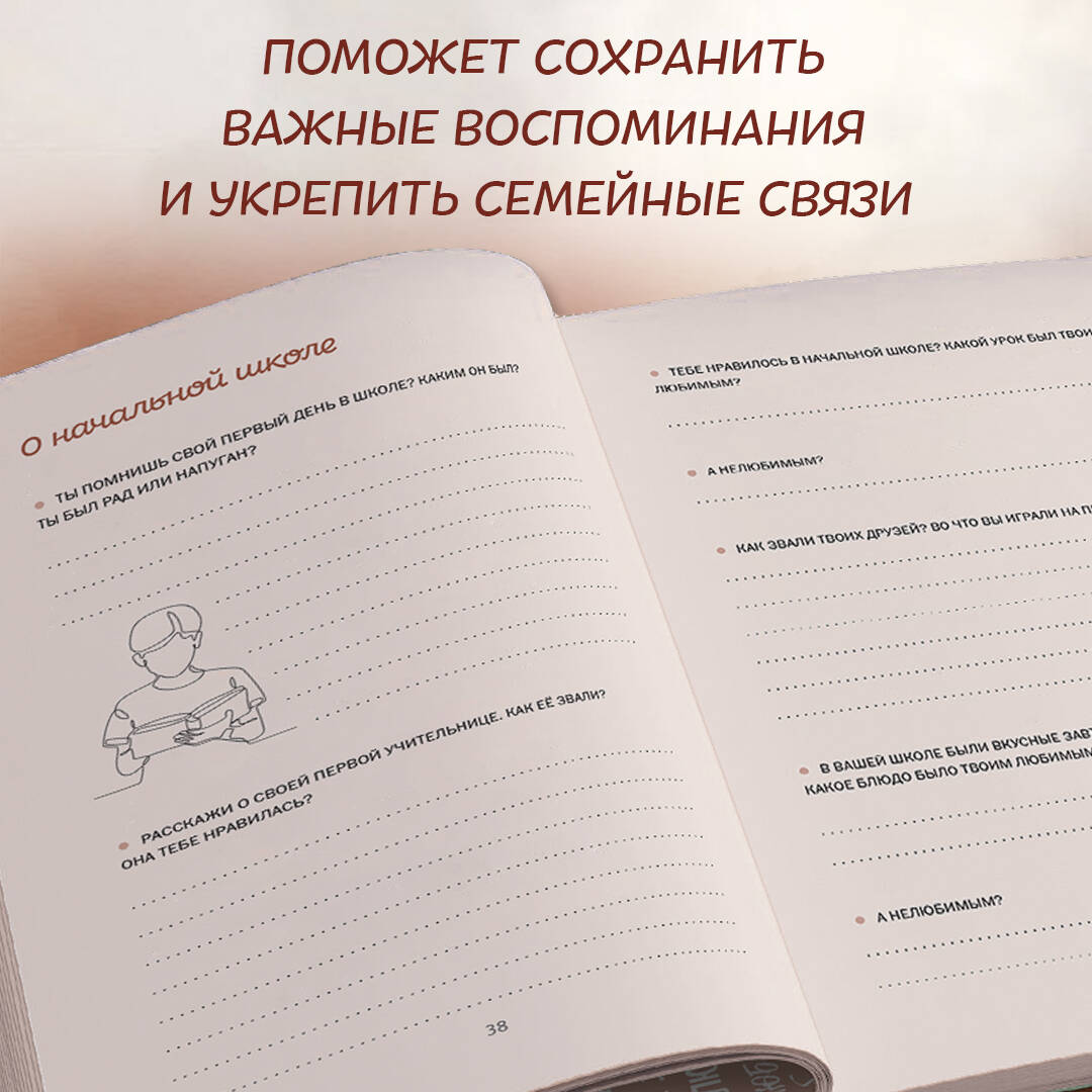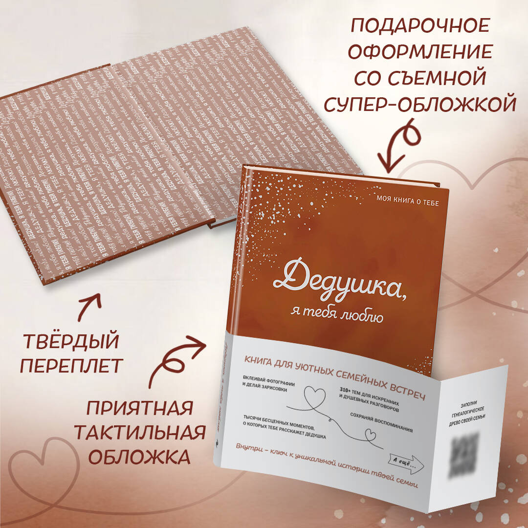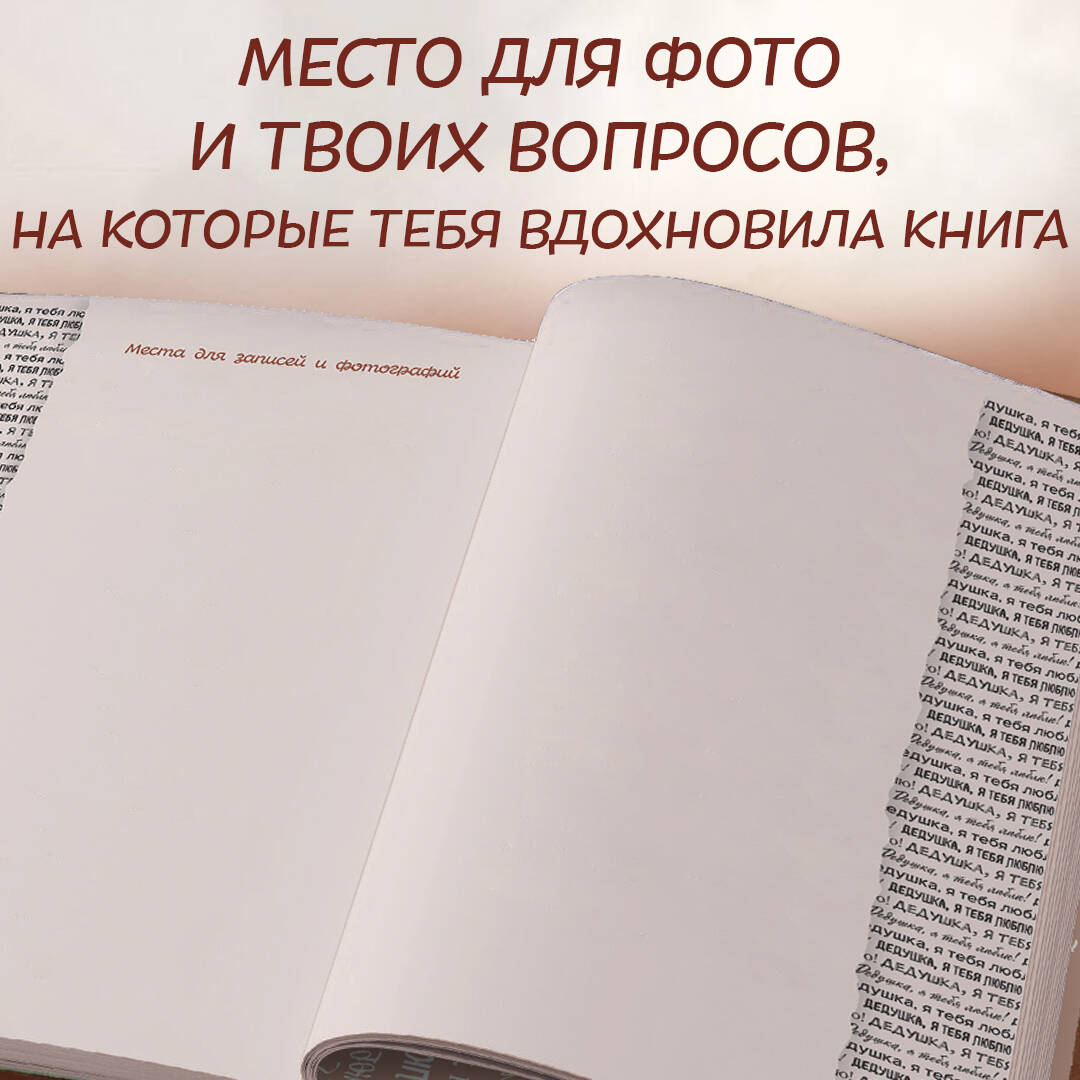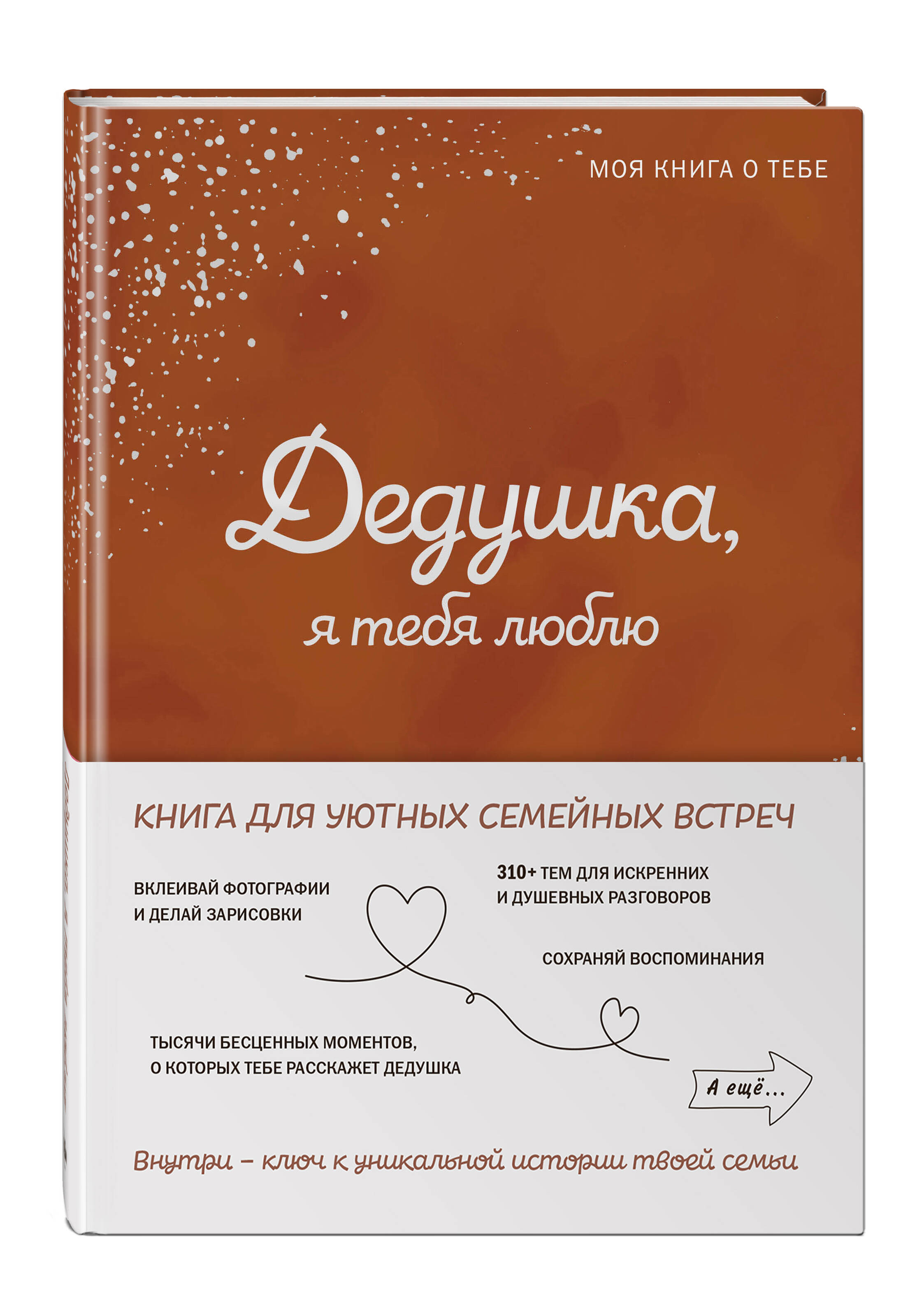 КНИГА ДЛЯ УЮТНЫХ СЕМЕЙНЫХ ВСТРЕЧ - КЛЮЧ К УНИКАЛЬНОЙ ИСТОРИИ ТВОЕЙ СЕМЬИ Наполните сердце вашего дедушки радостью, сказав: «Я люблю тебя! Расскажи мне, пожалуйста, о себе!» Узнайте лучше своего дедушку: какой он был в детстве, о чем мечтал, чему научился за свою жизнь и как стал таким, какой есть. Сохраните важные воспоминания и даже спустя много лет вы сможете возвращаться к книге, перечитывать и дополнять, а однажды прочитать своим детям и внукам, чтобы и они тоже узнали, каким необычным и интересным человеком был их прадедушка и прапрадедушка. • Как в его семье отмечали праздники, и какие традиции ему нравились больше всего? • В какие игры он играл с родителями? • Какое лето стало его самым любимым? • Как проходили тихие часы в его детском садике, и был ли ваш дедушка озорником? • Нравились ли ему полдники и обеды? • О чем он мечтал и как представлял себе мир взрослых, когда был ребенком? • Как ваш дедушка узнал страшную тайну о Деде Морозе? • Какой была его школа? Какие уроки были самыми любимыми? • За что он получил свою самую позорную двойку? • Как звали дедушкиных лучших друзей, и подшучивали ли они над учителями? • Как выглядела комната вашего дедушки? • Был ли он бунтарем в переходном возрасте? • Как проходили его выпускные экзамены? • Какой была его первая работа, и были ли у него хорошие отношения с руководством? • Как дедушка познакомился с вашей бабушкой и как сделал ей предложение? • Что он почувствовал, когда впервые взял вас на руки? Более 310 тем для искренних и душевных бесед с дедушкой! Эта книга - не просто семейный альбом или сборник вопросов. Эта книга - ваше признание в любви своему дедушке. Заполните ее вместе с ним или запишите ответы самостоятельно с его слов и создайте семейное древо. Если хотите, можете задавать вопросы последовательно, ведь все они расположены хронологически - от детства к нынешнему возрасту. Но на самом деле никаких правил нет! Можете начать диалог с любого места и дальше ориентироваться на ход беседы, переходя от раздела к разделу в зависимости от приходящих воспоминаний. Пусть эта новая традиция станет шагом к узнаванию уникальной истории вашей семьи. В книге вы найдете разделы: 1. Детские годы: семья и дом, детский сад, мировоззрение 2. Школьные годы: школа, семья и дом, друзья, мировоззрение в переходном возрасте 3. Студенческие годы: учёба, отношения, мировоззрение 4. Взрослая жизнь: работа, личная жизнь, мировоззрение 5. Наша семья Кроме того, в издании есть места для фото и заметок. Книга «Дедушка, я тебя люблю!» - это не только идеальный подарок для близкого человека на Новый год, день рождения, 23 февраля или день отца, но и ваш проводник в мир психологии и саморазвития, ведь узнавая свои корни, мы узнаем и настоящих себя, а значит, вы сможете разобраться и в вопросах к себе, которые у всех нас возникают в течение жизни. Издание подойдет и тем, кто ищет семейный фотоальбом необычного формата, и понравится вам, если вы обращали внимание на бестселлеры «С тобой я дома», «К себе нежно». Издание станет настоящим украшением книжной полки: у него отличное подарочное оформление, твердая обложка с приятным на ощупь покрытием софт тач, плотные страницы, цветная шелковая лента-закладка, съемный полусупер. Такие же книги мы сделали для мамы, папы и бабушки - «Мама, я тебя люблю! Моя книга о тебе», «Папа, я тебя люб