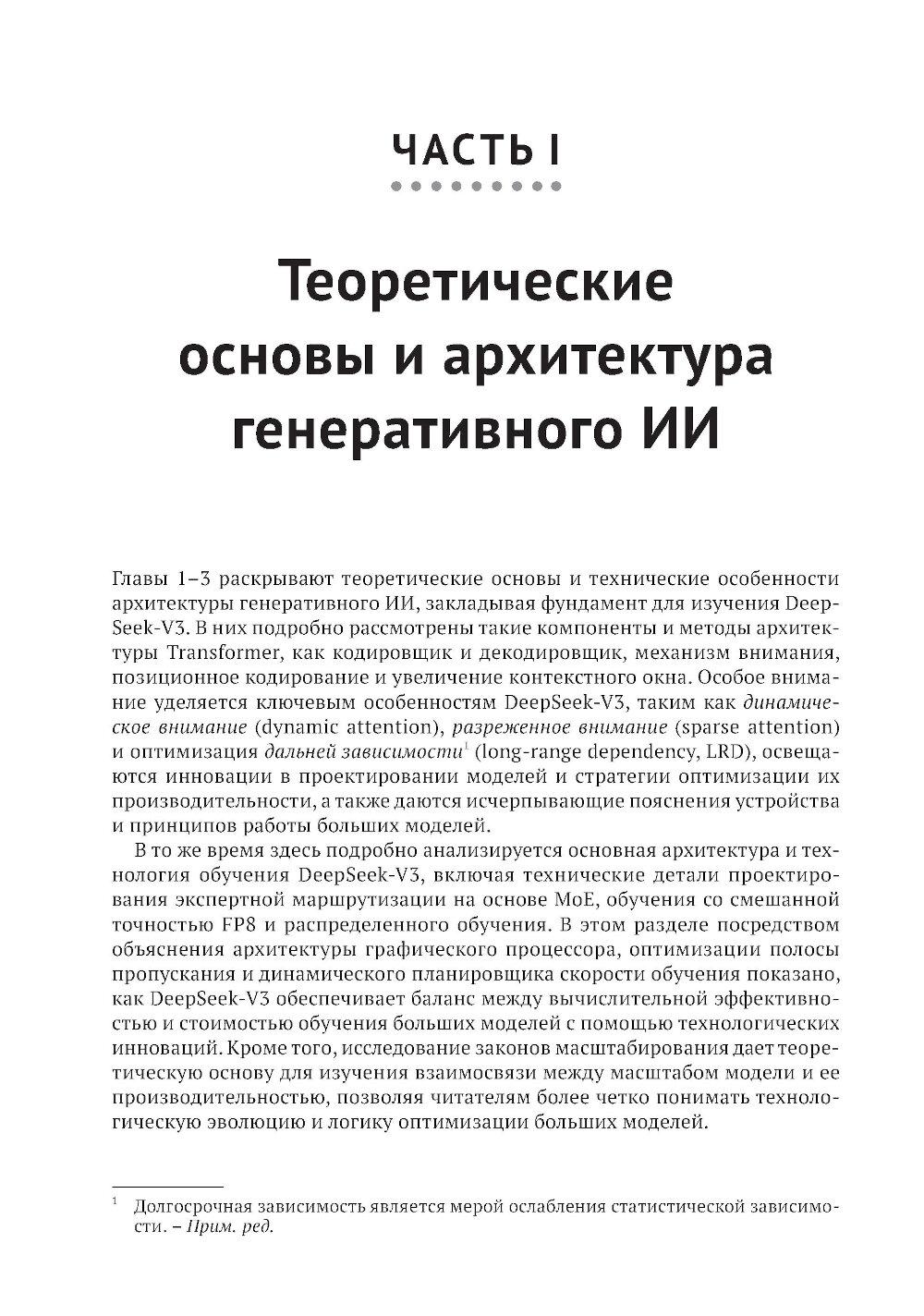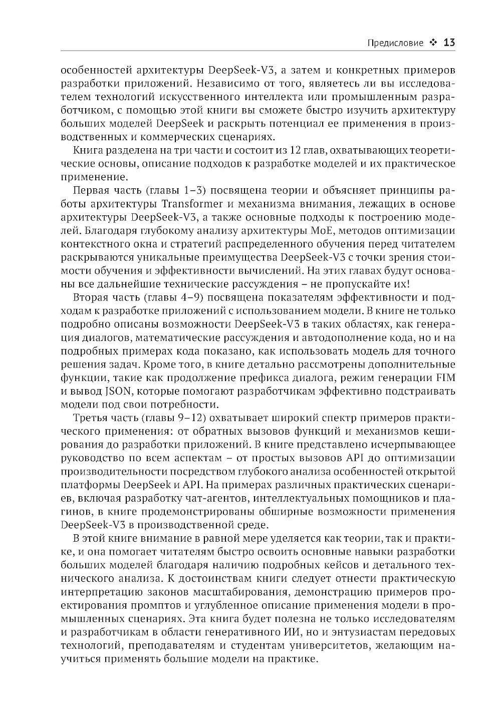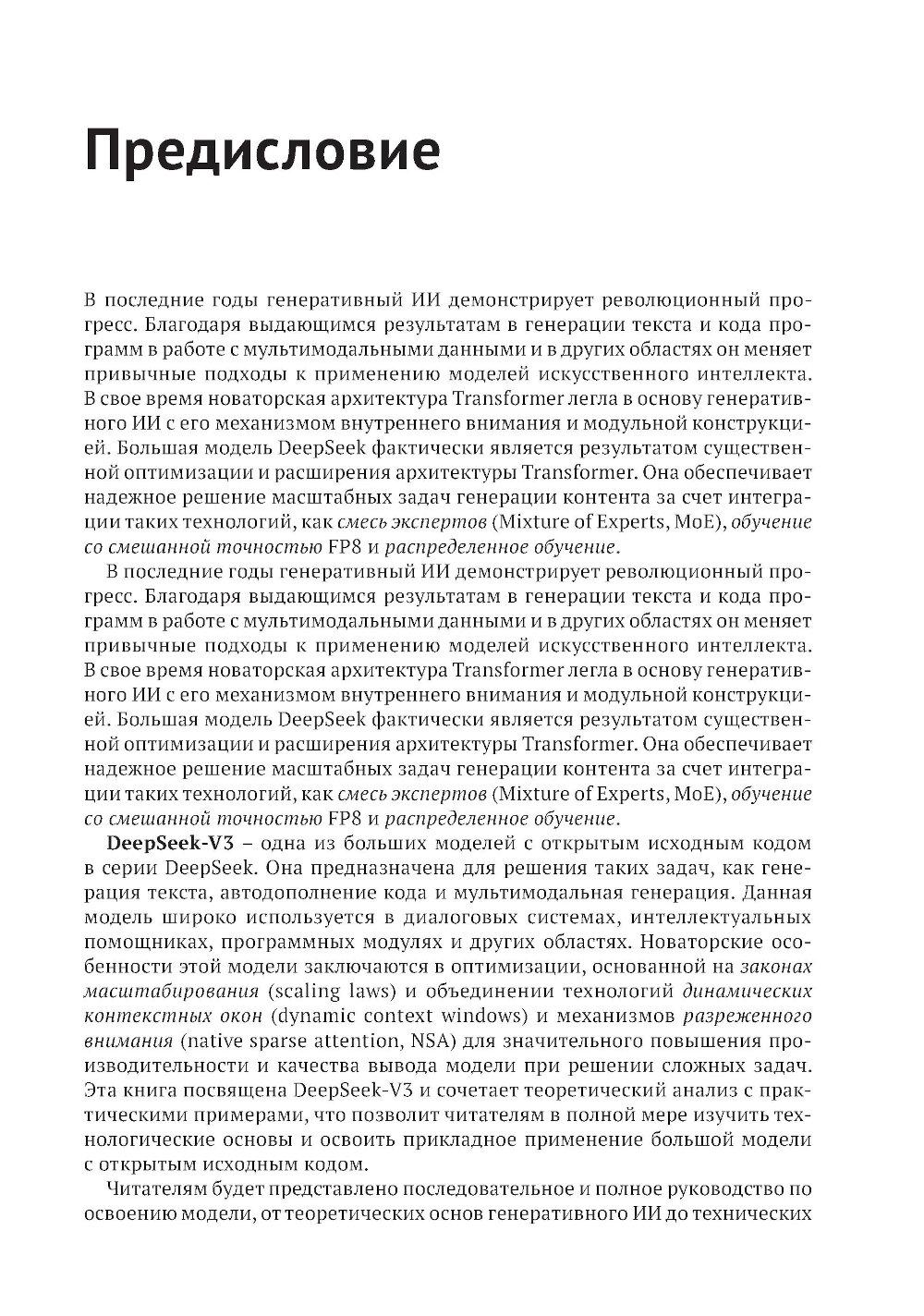DeepSeek - это генеративная модель искусственного интеллекта с открытым исходным кодом, основанная на архитектуре Transformer и объединяющая передовые технологии, такие как архитектура MoE, обучение с переменной разрядностью и распределенная оптимизация. Она хорошо зарекомендовала себя в области генерации текста, мультимодальной обработки и адаптации под конкретные прикладные задачи. В книге описаны особенности глубоко оптимизированной архитектуры DeepSeek-V3 и способы применения модели на практике. Рассматриваемые темы: Теоретические основы - базовая архитектура и технологии обучения моделей типа Transformer, механизм внимания DeepSeek, законы масштабирования и их применение в оптимизации моделей. Основные приемы работы - начало работы с моделью, знакомство с API, реализация диалога, функции обратного вывода, кеширование на диске и оптимизация кеша. Расширенное применение - реализация чат-клиентов, интеллектуальных помощников, плагинов VS Code и т. д. Книга будет полезна исследователям технологий генеративного ИИ, инженерам-разработчикам программного обеспечения, специалистам по обработке данных, а также всем желающим быстро освоить практическое применение больших языковых моделей. Издание подготовлено «Лабораторией искусственного интеллекта будущего» (Китай). Коллектив лаборатории состоит из докторов и магистров ведущих китайских университетов, специализирующихся на разработке и инновациях в области обработки естественного языка, глубокого обучения, компьютерного зрения и мультимодальных моделей.| Издательство | ДМК Пресс |