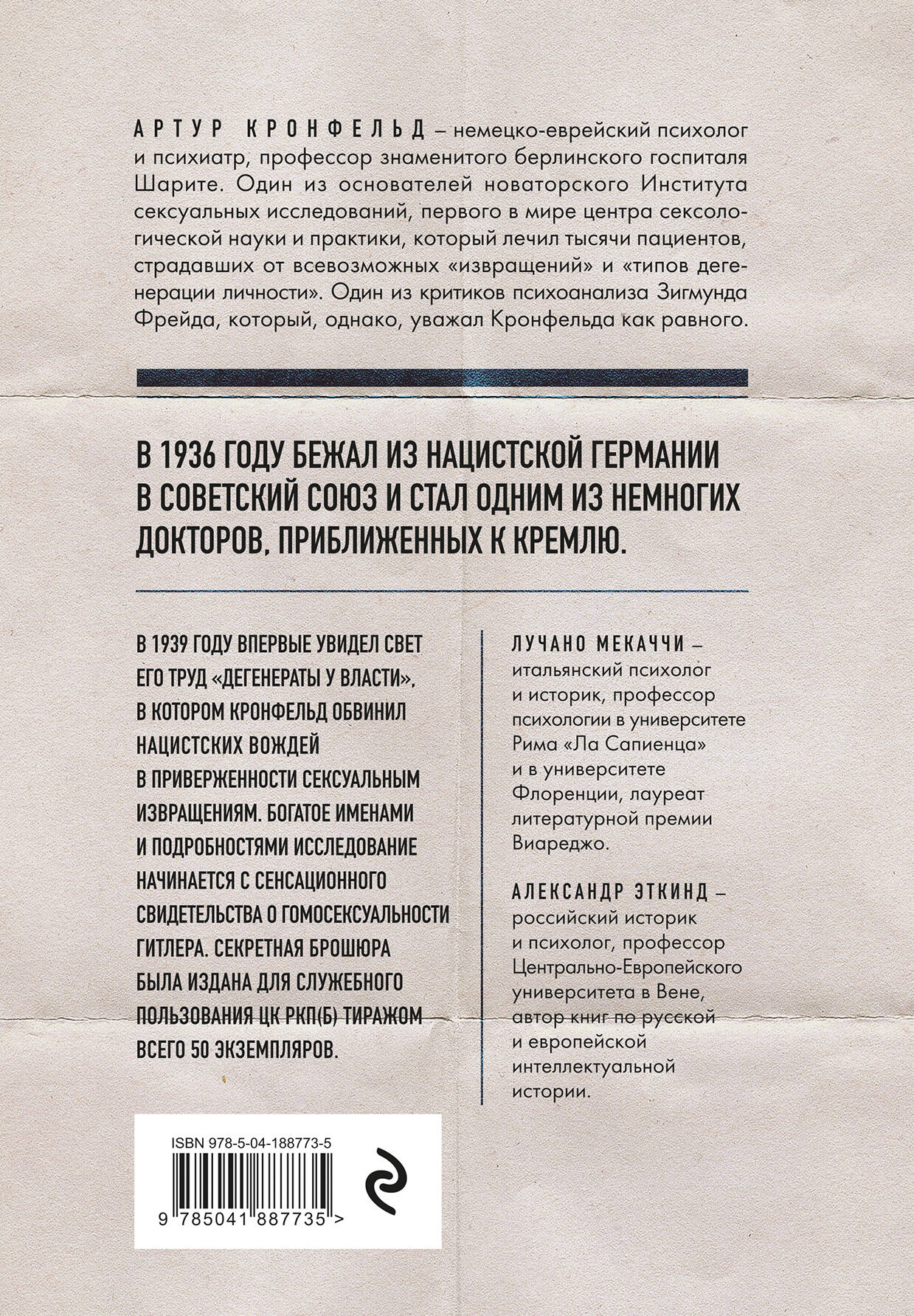 Книга Артура Кронфельда, основателя первого в мире Института сексуальных исследований, впервые была издана под грифом «Совершенно секретно» тиражом всего 50 экземпляров для пользования членами ЦК РКП(б) в 1939 году. Автор, возможно нарушая врачебную тайну, обвинил нацистских вождей, в том числе Гитлера, в приверженности сексуальным извращениям. Новое издание сопровождается современными комментариями итальянского психолога и историка, профессора психологии в университете Рима «Ла Сапиенца» Лучано Мекаччи и обстоятельным предисловием историка, психолога, профессора Центрально-Европейского Университета в Вене Александра Эткинда.| Издательство | ООО "Издательство "Эксмо" |