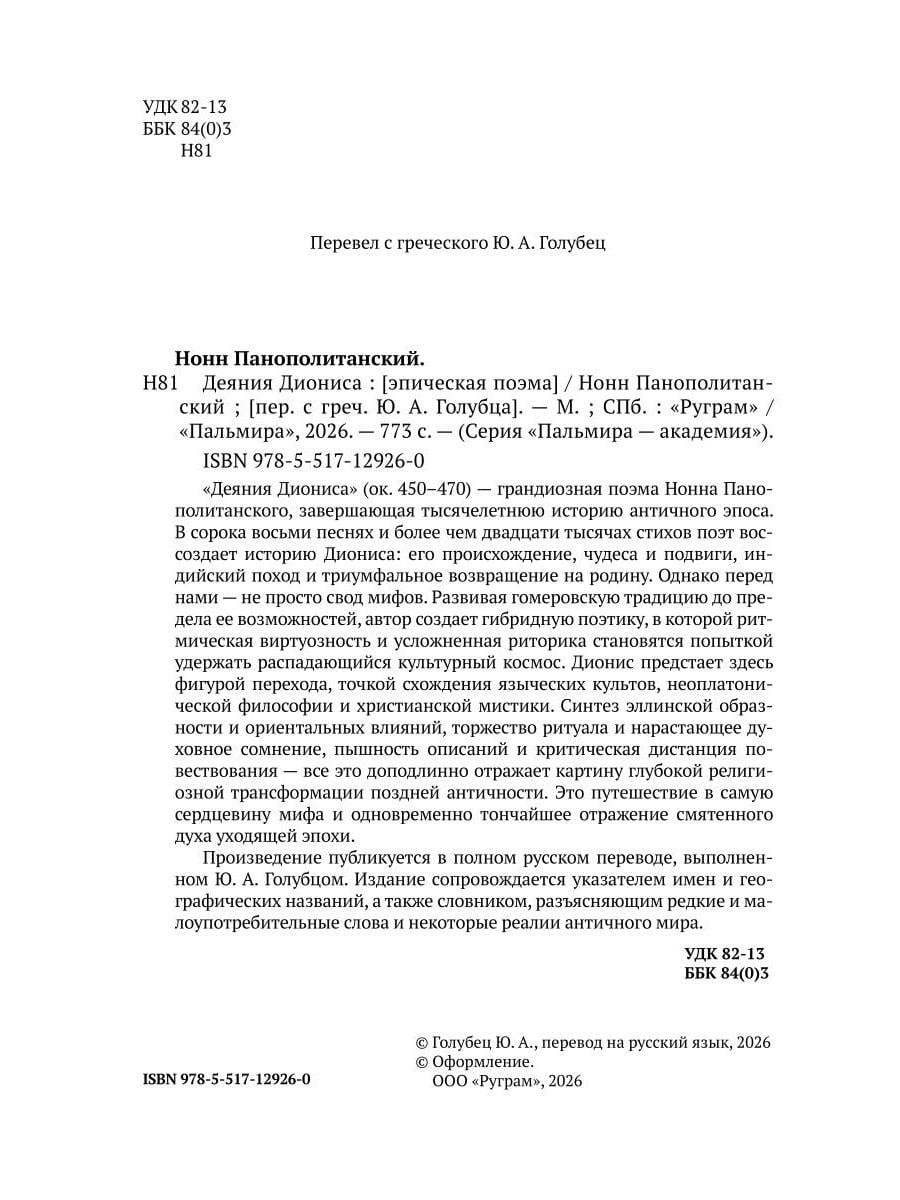 «Деяния Диониса» (ок. 450-470) - грандиозная поэма Нонна Панополитанского, завершающая тысячелетнюю историю античного эпоса. В сорока восьми песнях и более чем двадцати тысячах стихов поэт воссоздает историю Диониса: его происхождение, чудеса и подвиги, индийский поход и триумфальное возвращение на родину. Однако перед нами - не просто свод мифов. Развивая гомеровскую традицию до предела ее возможностей, автор создает гибридную поэтику, в которой ритмическая виртуозность и усложненная риторика становятся попыткой удержать распадающийся культурный космос. Дионис предстает здесь фигурой перехода, точкой схождения языческих культов, неоплатонической философии и христианской мистики. Синтез эллинской образности и ориентальных влияний, торжество ритуала и нарастающее духовное сомнение, пышность описаний и критическая дистанция повествования - все это доподлинно отражает картину глубокой религиозной трансформации поздней античности. Это путешествие в самую сердцевину мифа и одновременно тончайшее отражение смятенного духа уходящей эпохи. Произведение впервые публикуется в полном русском переводе, выполненном Ю. А. Голубцом. Издание сопровождается указателем имен и географических названий, а также словником, разъясняющим редкие и малоупотребительные слова и некоторые реалии античного мира.| Издательство | Т8 RUGRAM |
