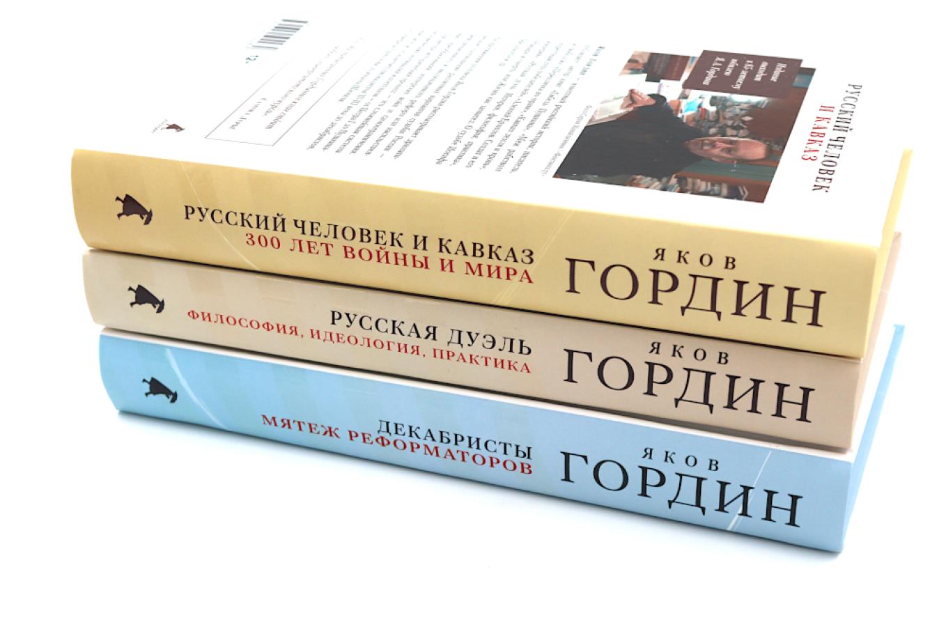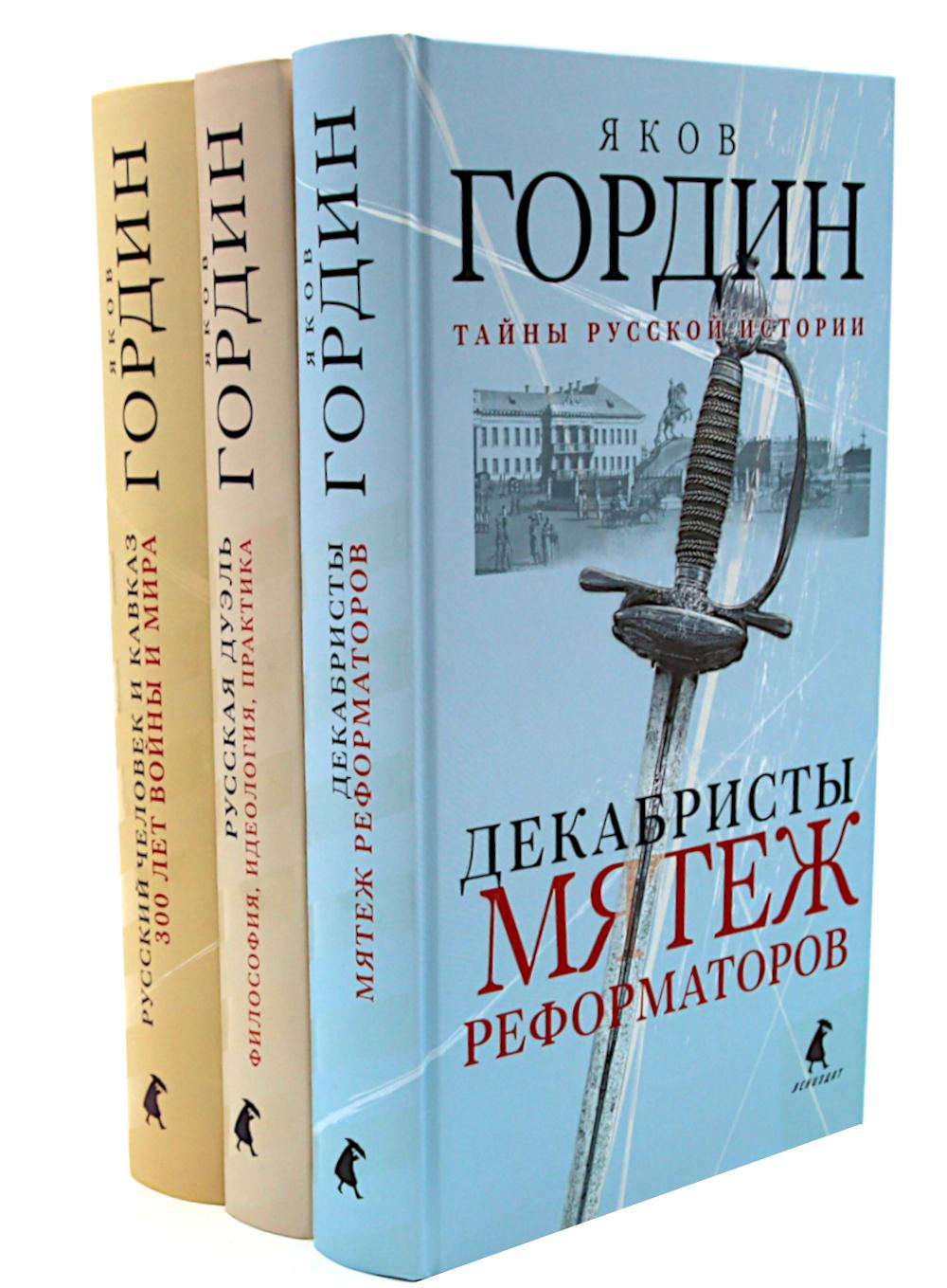 Комплект состоит из трех книг Якова Гордина: «Декабристы. Мятеж реформаторов»: Декабрьские события 1825 года - ключевые, поворотные события русской истории. Споры о фактической стороне и смысле этих событий начались немедленно после подавления мятежа 14 декабря и продолжаются с неослабевающей силой и страстью без малого два столетия, что доказывает их актуальность. За долгое время вокруг этой темы образовалась многообразная мифология - как апологетическая, так и резко негативная, основанная на слабом знании исторической реальности и на конспирологических фантазиях. Автор в своей работе опирался на мощный пласт научных исследований, проделанных отечественными историками. Фундамент книги - обширный документальный материал: воспоминания участников и современников, комплекс следственных дел членов тайных обществ, официальные документы, в частности донесения гвардейского генералитета. Путем сопоставления и критического анализа различных источников автору удалось по дням, часам, а иногда минутам воссоздать возможно близкую к реальности картину происходящего. «Русская дуэль: Философия, идеология, практика»: «Я ненавижу дуэли - это варварство, на мой взгляд, в них нет ничего рыцарского», - сказал некогда император Николай I. «Нельзя не уважать дуэли. Это дело благородное и трагическое», - писал русский философ Константин Леонтьев. Между двумя этими полюсами лежит смертельно опасное пространство дуэли - дуэли как способа, которым русское дворянство многие десятилетия отстаивало и оттачивало свое чувство личного достоинства. Книга Я. Гордина посвящена историческим, культурным и, наконец, философско-экзистенциальным аспектам русской дуэльной практики XVIII-XIX веков - от эпохи Екатерины II, времени первых поединков в России, до царствования Александра III, когда умирала дуэльная традиция. Русская дуэль - целеустремленно беспощадная по сравнению с европейской - играла решающую роль в воспитании дворянина как человека чести. Книга построена на обширном и разнообразном материале - мемуарных и эпистолярных свидетельствах, архивных документах (военно-судных делах о поединках). «Русский человек и Кавказ. 300 лет войны и мира»: Книга известного писателя и историка Якова Гордина «Русский человек и Кавказ»- это размышления о роли Кавказа в судьбе России и роли России в судьбе Кавказа. Эта книга о действующих лицах великой драмы, названной Кавказской войной. Это яркая череда героев - Ермолов и Шамиль, безжалостный генерал-каратель Засс и генерал-гуманист Николай Раевский-младший, русские военачальники, для которых расширение границ империи было непреложной целью, и горские вожди, не мыслившие другой жизни, кроме полной независимости и героики набегов.| Издательство | Лениздат |