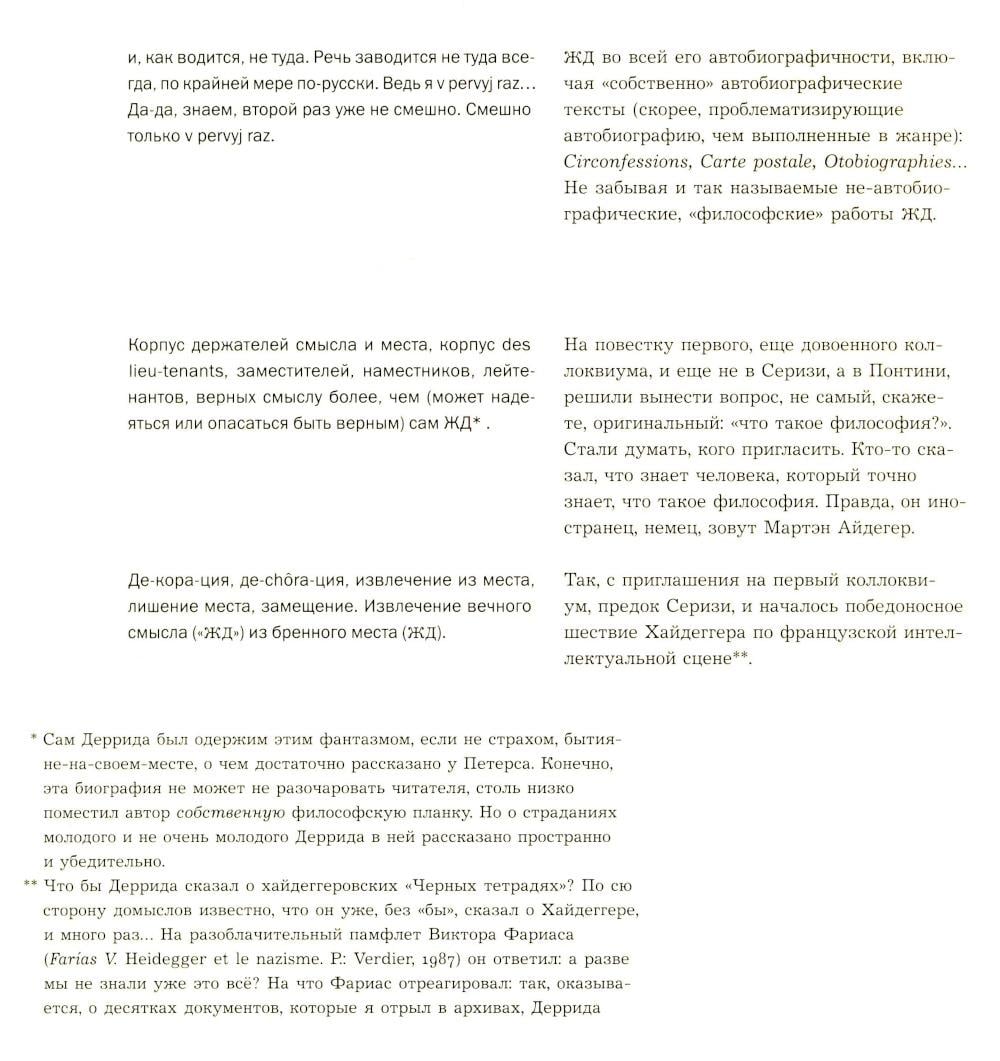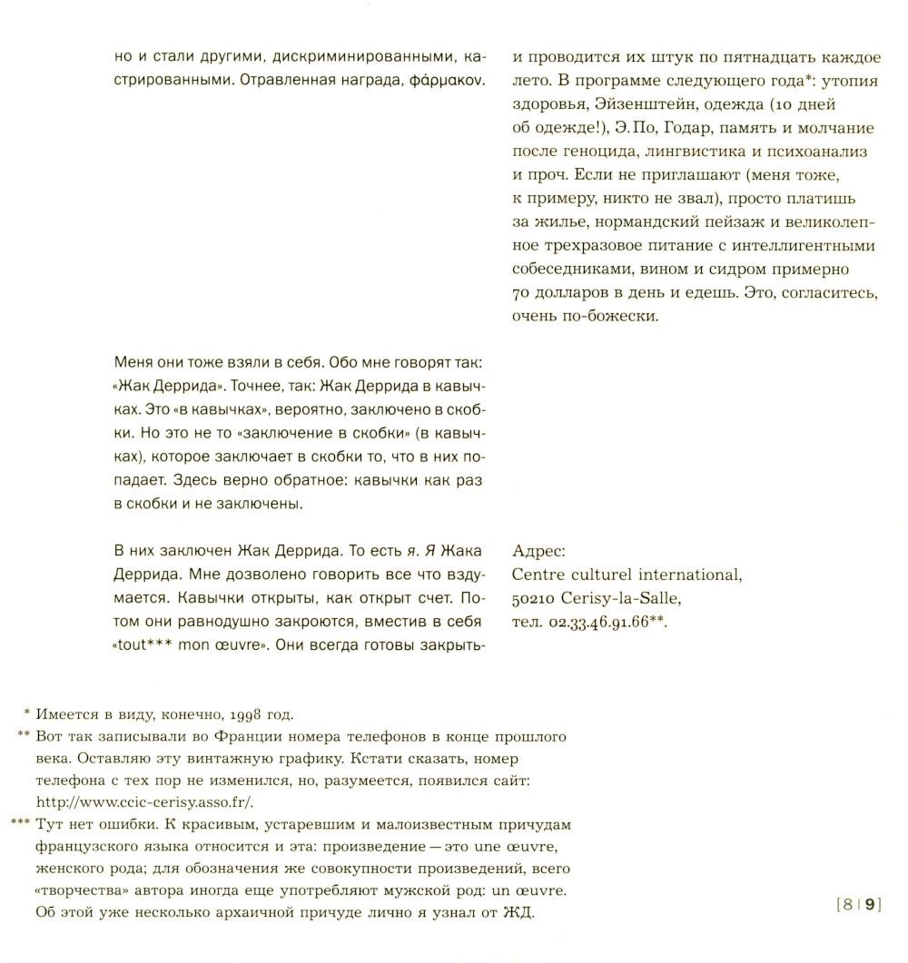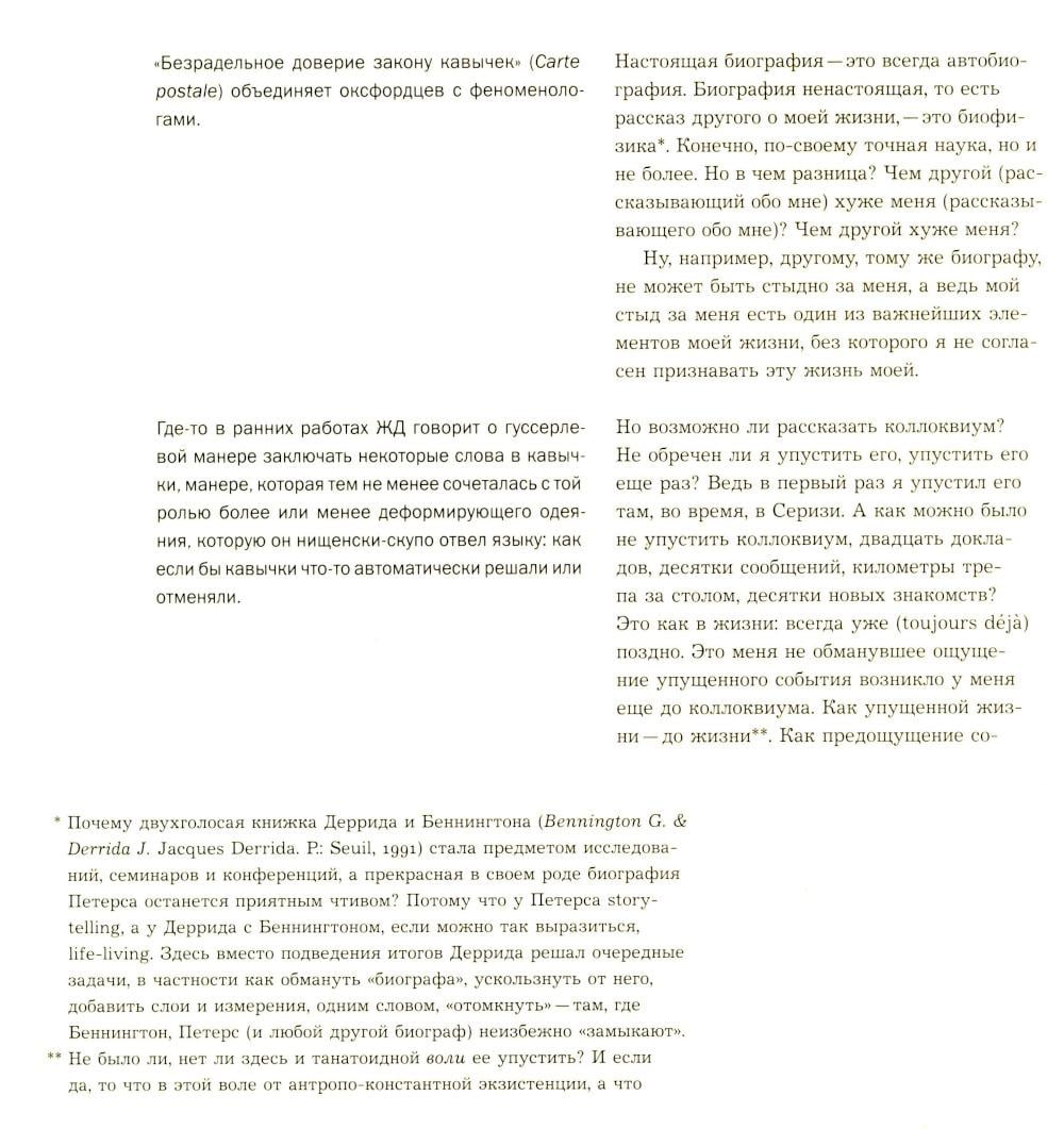 Субъективный репортаж-воспоминание об одном из легендарных философских событий конца ХХ века: 10-дневном коллоквиуме с участием Жака Деррида, посвященном двум темам - животного и автобиографии. Через 20 с лишним лет после коллоквиума, через 15 лет после смерти Жака Деррида автор перечитывает и комментирует сделанный тогда «отчет». За сугубо индивидуальным опытом проступают черты автопортрета целого «философского поколения».| Издательство | Изд. Института Гайдара |