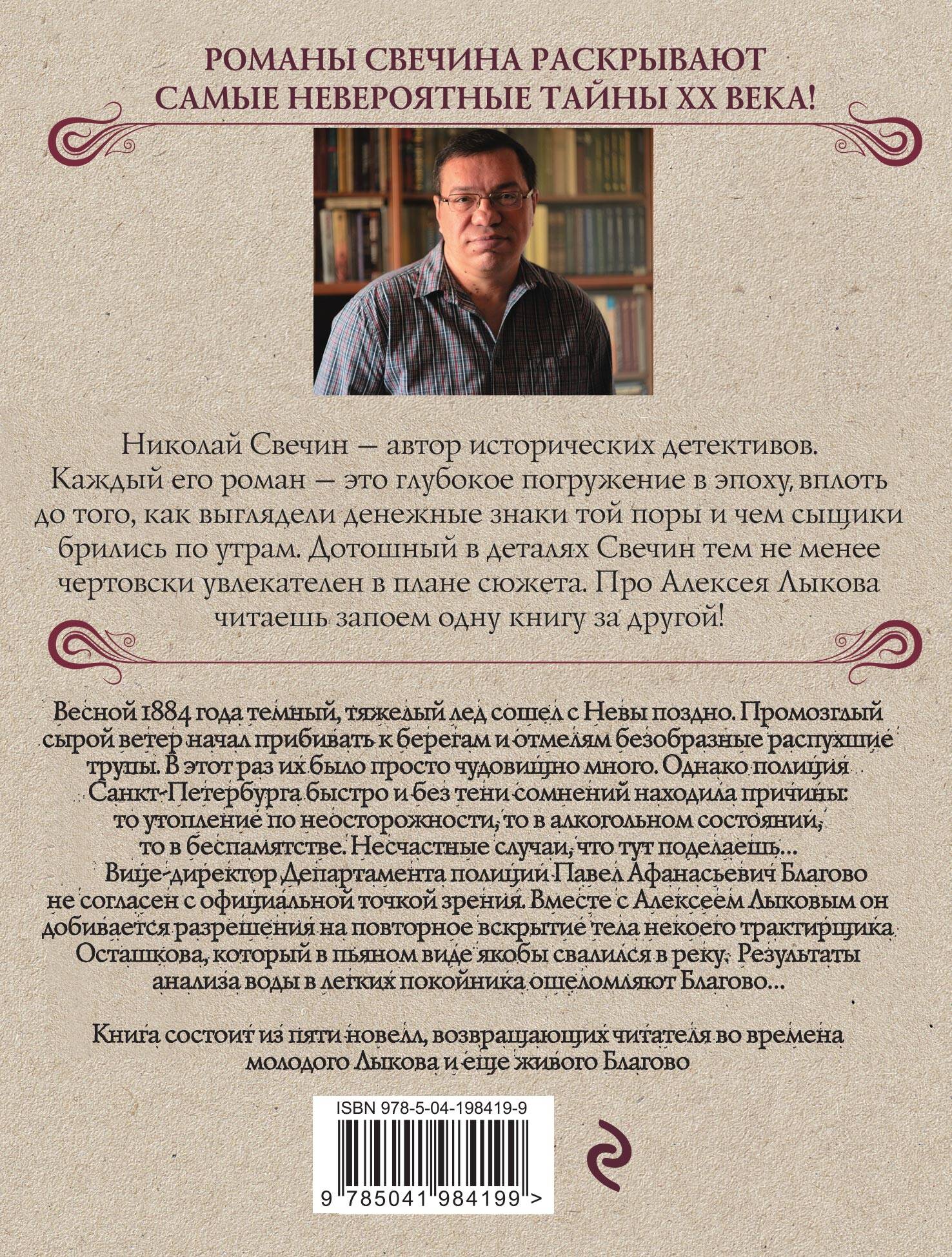 Новая книга самого модного автора ретро-детективов Николая Свечина, самого популярного в жанре! Книга входит в цикл произведений о сыщике Алексее Лыкове и является 34-й по счету, но ее можно читать и как самостоятельное произведение. Книга состоит из пяти новелл, возвращающих читателя во времена молодого Лыкова и еще живого Благово. Совершенно жуткие загадочные происшествия от одного из самых популярных авторов исторических детективов, победителя премии «Русский детектив» Николая Свечина. Весной 1884 года темный, тяжелый лед сошел с Невы поздно. Промозглый сырой ветер начал прибивать к берегам и отмелям безобразные распухшие трупы. В этот раз их было просто чудовищно много. Однако полиция Санкт-Петербурга быстро и без тени сомнений находила причины: то утопление по неосторожности, то в алкогольном состоянии, то в беспамятстве. Несчастные случаи, что тут поделаешь… Вице-директор Департамента полиции Павел Афанасьевич Благово не согласен с официальной точкой зрения. Вместе с Алексеем Лыковым он добивается разрешения на повторное вскрытие тела некоего трактирщика Осташкова, который в пьяном виде якобы свалился в реку. Результаты анализа воды в легких покойника ошеломляют Благово…| Издательство | ООО "Издательство "Эксмо" |