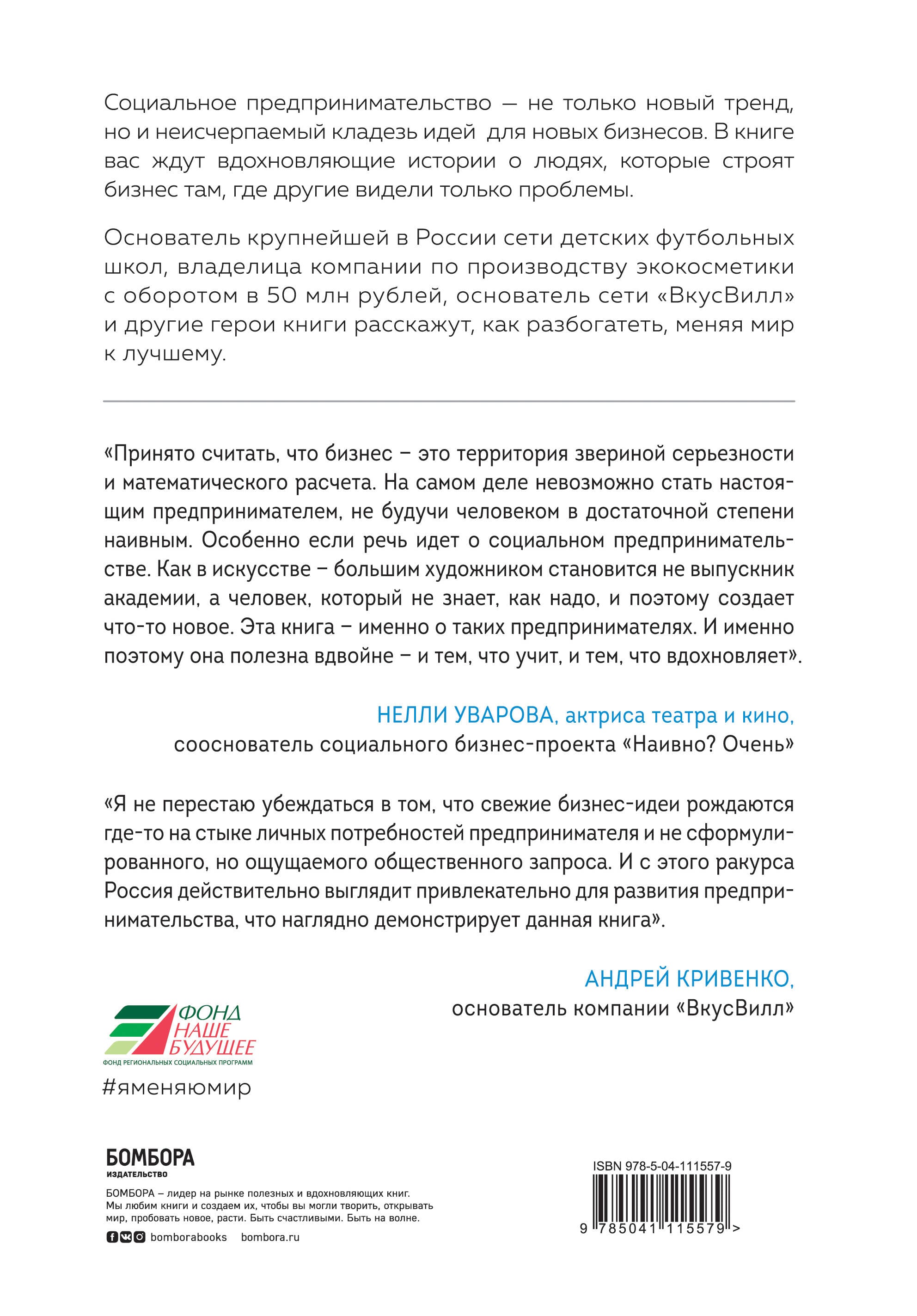 Вдохновляющие истории о людях, на собственном примере доказавших, что социальное предпринимательство - не только новый тренд, но и золотая жила. Основатель крупнейшей в России сети детских футбольных школ, владелица компании по производству эко-косметики с оборотом в 50 млн рублей, основатель сети "ВкусВилл", и другие герои книги расскажут, как разбогатеть, меняя мир к лучшему.| Издательство | ООО "Издательство "Эксмо" |