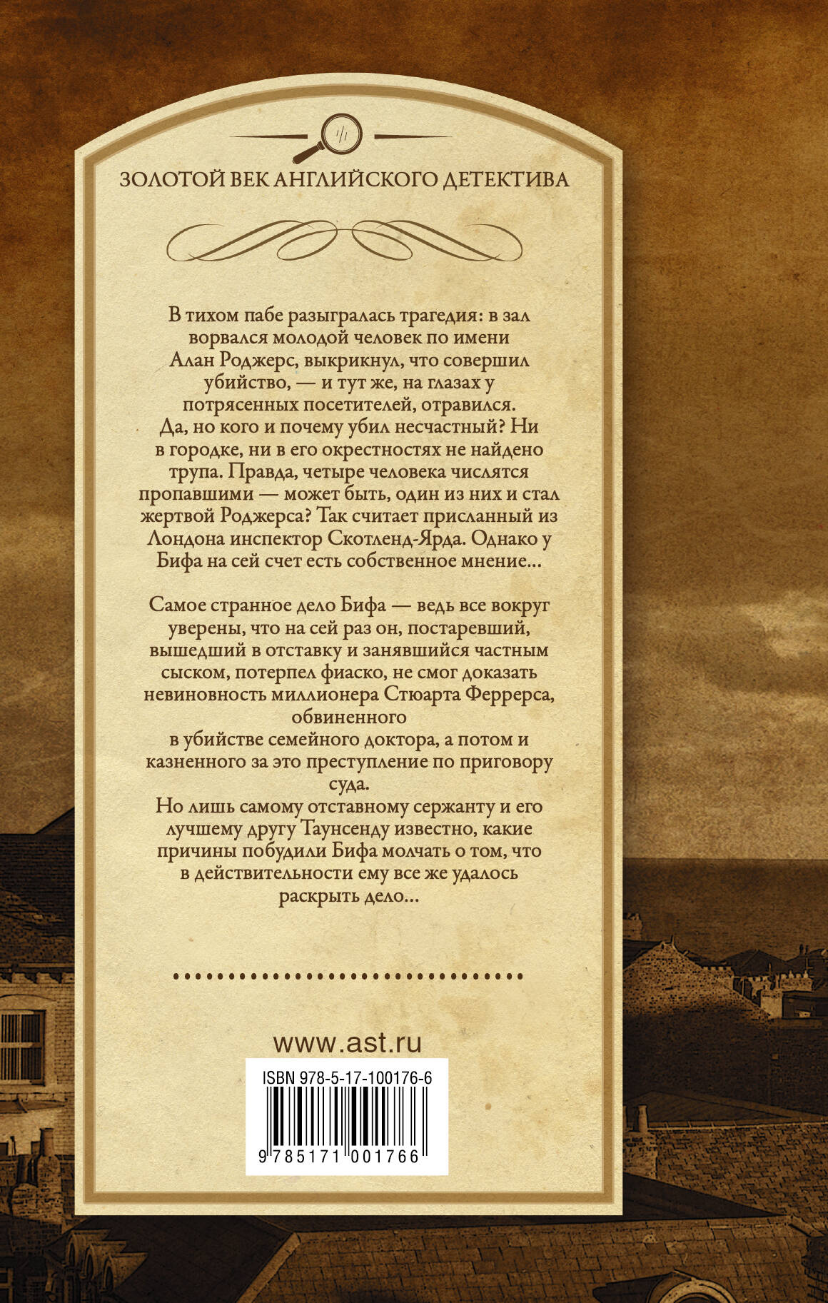 В тихом пабе разыгралась трагедия: в зал ворвался молодой человек по имени Алан Роджерс, выкрикнул, что совершил убийство, - и тут же, на глазах у потрясенных посетителей, отравился. Да, но кого и почему убил несчастный? Ни в городке, ни в его окрестностях не найдено трупа. Правда, четыре человека числятся пропавшими - может быть, один из них и стал жертвой Роджерса? Так считает присланный из Лондона инспектор Скотленд-Ярда. Однако у Бифа на сей счет есть собственное мнение… Самое странное дело Бифа: ведь все вокруг уверены, что на сей раз он, постаревший, вышедший в отставку и занявшийся частным сыском, потерпел фиаско - не смог доказать невиновность миллионера Стюарта Феррерса, обвиненного в убийстве семейного доктора, а потом и казненного за это преступление по приговору суда. Но лишь самому отставному сержанту и его лучшему другу Таунсенду известно, какие причины побудили Бифа молчать о том, что в действительности ему все же удалось раскрыть дело…| Издательство | Издательство "АСТ" |