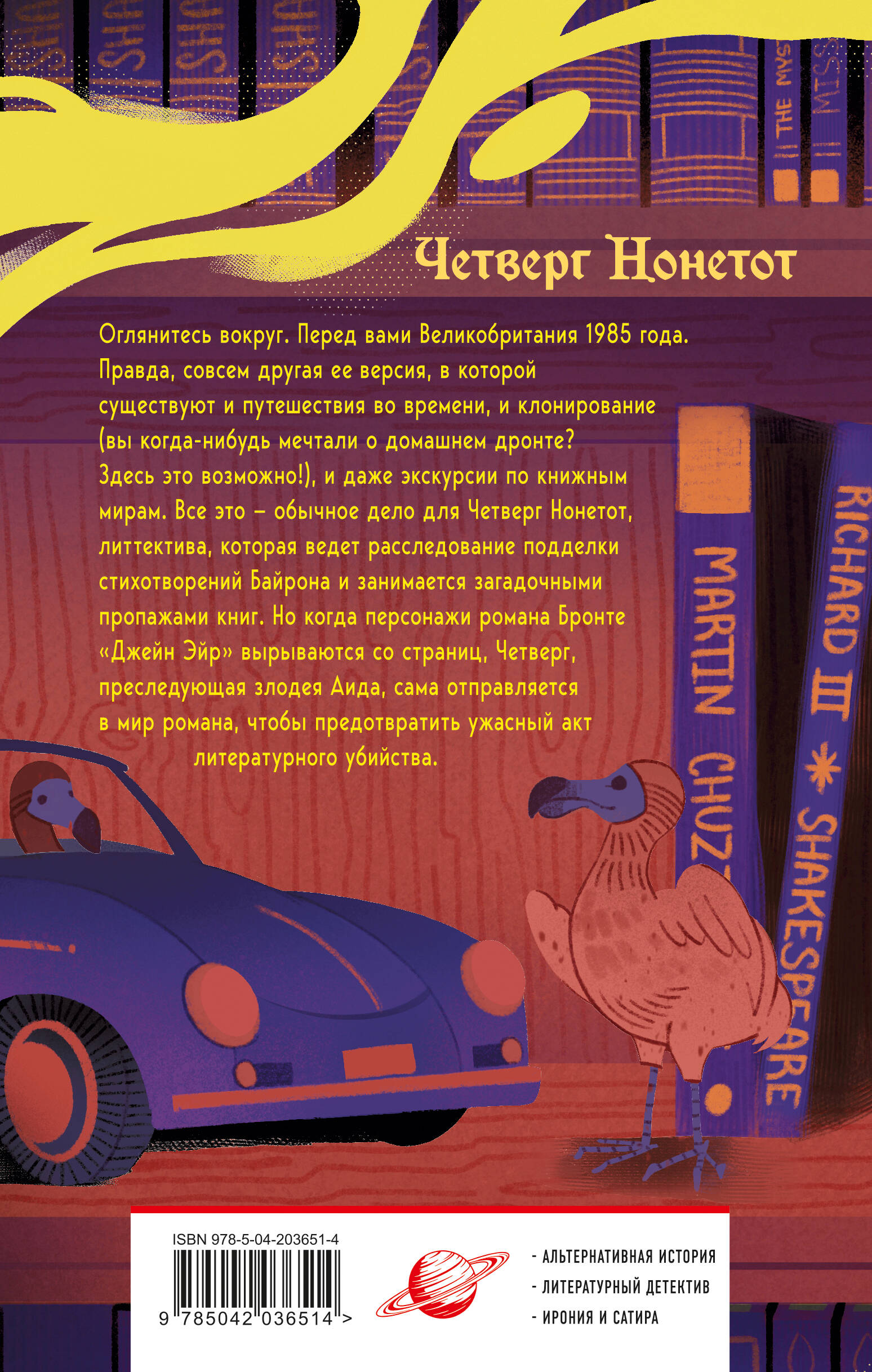 Бестселлер New York Times. Премия им. Уильяма Кроуфорда. Премия «Алекс». Номинант: Премия Дилис, Пресия Геффена, Немецкая фантастическая премия, Большая премия Воображения Первый роман знаменитой серии «Четверг Нонетот». Встречайте Четверг Нонетот, литературного детектива, незаменимую, без страха и упрека. А также встречайте альтернативную версию Великобритании 1985 года, где путешествия во времени - обычное дело, клонирование - реальность (дронты стали самыми любимыми воскрешенными домашними питомцами), а к литературе относятся очень, очень серьезно. Англия - государство, где тетя может заблудиться (в буквальном смысле) в стихах Уодсворта, воинствующие бэконианцы хулиганят на спектаклях по «Гамлету», а подделка стихотворений Байрона является уголовно наказуемым делом. Все это - обычное дело для Четверг, знаменитого литтектива, пока кто-то не начинает похищать персонажей из литературных произведений. Когда Джейн Эйр вырывают со страниц романа Бронте, Четверг начинает поиски злодея и сама отправляется в роман, чтобы предотвратить чудовищный акт литературного убийства. «Литературная страна чудес, напоминающая серию "Автостопом по Галактике" Дугласа Адамса и произведения Льюиса Кэрролла». - USA Today «В этом романе отлично сочетаются альтернативная история, комедийные сценки в стиле "Монти Пайтона", суперзлодеи в а-ля Гран-Гиньоль, сорванные свадьбы, модерн и постмодерн, актуальный политический комментарий, путешествия во времени, вампиры, чудаковатые изобретатели, суровый рассказчик и многое, многое другое… Отбросьте неверие, найдите тихий уголок и просто присоединяйтесь к неудержимой и всегда находчивой Четверг Нонетот». - The Washington Post «Четверг Нонетот - это отчасти Бриджит Джонс, отчасти Нэнси Дрю и отчасти Грязный Гарри». - Митико Какутани, The New York Times «Наполненная ловкой игрой слов и литературными аллюзиями, этот роман сочетает в себе элементы "Монти Пайтона", "Гарри Поттера", Стивена Хокинга и "Баффи - истребительницы вампиров", но ее причудливый шарм - это собственное очарование». - The Wall Street Journal «Роман как энергичная переписка с жанровой фантастикой: отчасти крутой детектив, отчасти путешествия во времени, в которой действует дерзкая, начитанная Четверг Нонетот, специальный оперативник отдела литературных детективов, больше напоминающая Бриджит Джонс, а не мисс Марпл. Почти каждое предложение Ффорде сопровождается лукавым подмигиванием, а игра слов, мелочи и внутренние шутки дается ему с легкостью. Искрометность Ффорде всегда очень заразительна». - The New York Times Book Review «Буйный меланж из криминала, комедии и альтернативной истории». - Houston Chronicle «Нужно быть смелым авантюристом, чтобы играть с литературой с такой свободой и быстротой, и именно это мы наблюдаем в цикле "Четверг Нонетот" у Ффорде». - Newsday «Автор обеспечивает многочисленные сюжетные повороты, яркие литературные отсылки и потоки дикой метафикциональной выдумки в романе, который ставит литературу в центр поп-культурной вселенной. Все это складывается в умное и веселое приключение». - Time Out New York «Смесь саспенса и нелепости, две части фэнтези ("Алиса в стране чудес" и "Супермен"), две части абсурда (все, что написано Карлом Хайасеном) и часть тайны (Агата Кристи и Сью Графтон)». - St. Louis Post-Dispatch «Ее зовут Нонетот. Четверг Нонетот. И ее история столь же забавна и интригует, как и кратк