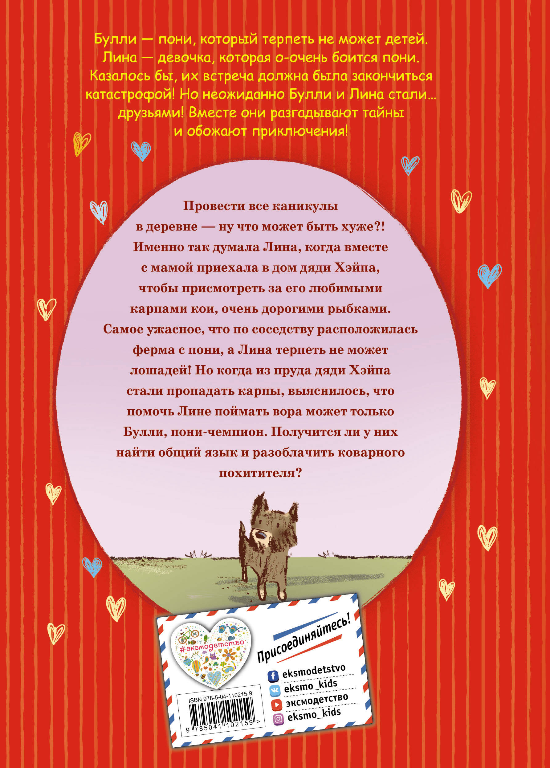 Отправиться в деревню на целое лето - для Лины это настоящая катастрофа! Она и её мама должны присмотреть за домом дяди Хэйпа и, конечно, за его драгоценными карпами кои. Эти рыбы стоят целое состояние! Вот только Лина терпеть не может деревню, а ещё лошадей, - как назло, по соседству расположилась целая ферма с пони! Но когда из пруда стали пропадать карпы, выяснилось, что помочь девочке разоблачить вора может пони по имени Булли. Получится ли у них найти общий язык и поймать наглого воришку? Первая книга серии. Рекомендуется всем любителям «Приключений кота-детектива»! Вас ждут новые увлекательные истории от автора бестселлеров Фрауке Шойнеманн! Её книги переведены на несколько языков (итальянский, польский, испанский и многие другие) и отмечены литературными наградами. Лёгкий слог, крупный удобный шрифт, интересный сюжет - читать будет в удовольствие. Книга отлично подойдёт для самостоятельного чтения. Внутри - забавные иллюстрации известной немецкой художницы Сюзанны Гёлих.| Издательство | ООО "Издательство "Эксмо" |