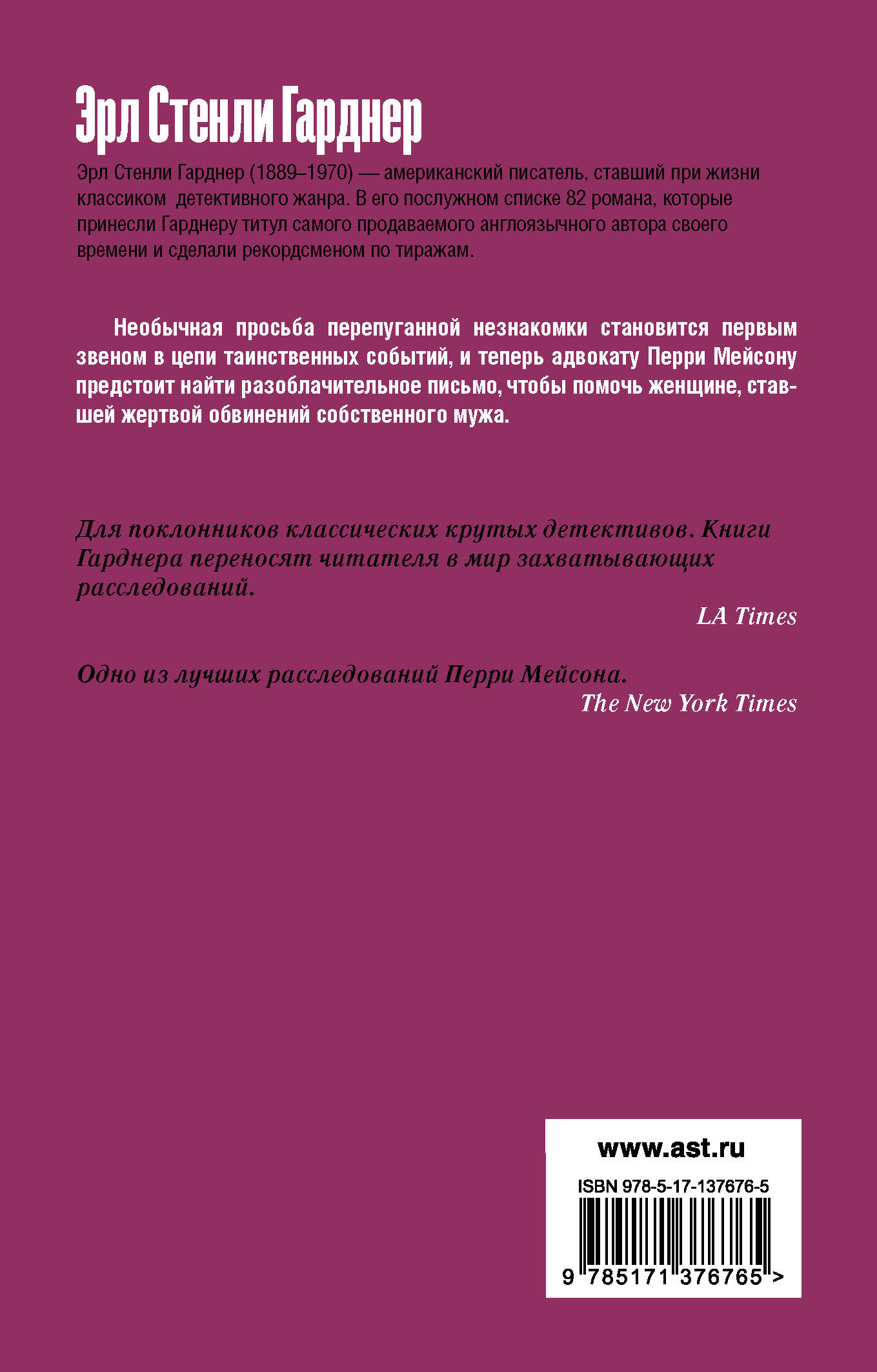 - Эрл Стэнли Гарднер - один из самых известных классиков детективного жанра. За свою полувековую карьеру он написал свыше сотни романов. - Перри Мейсон - самый популярный персонаж автора, он появляется почти в восьми десятках романов, разошедшихся по свету тиражом свыше 300 000 000 экземпляров. - Книги цикла о Перри многократно экранизировались, последняя телевизионная адаптация выходила на HBO Max в начале двадцатых годов и доступна на сервисе «Амедиатека». - Перри Мейсон - адвокат, который параллельно с защитой своих клиентов в суде проводит собственное расследование преступлений, в которых их обвиняют. На этот раз Перри предстоит помочь девушке, которую обвиняют в убийстве мужа. Но вот незадача - труп сбежал вскоре после предполагаемого убийства! - Книги цикла отличаются высоким динамизмом, реалистичным и продуманным сюжетом и запоминающимися персонажами.| Издательство | Издательство "АСТ" |