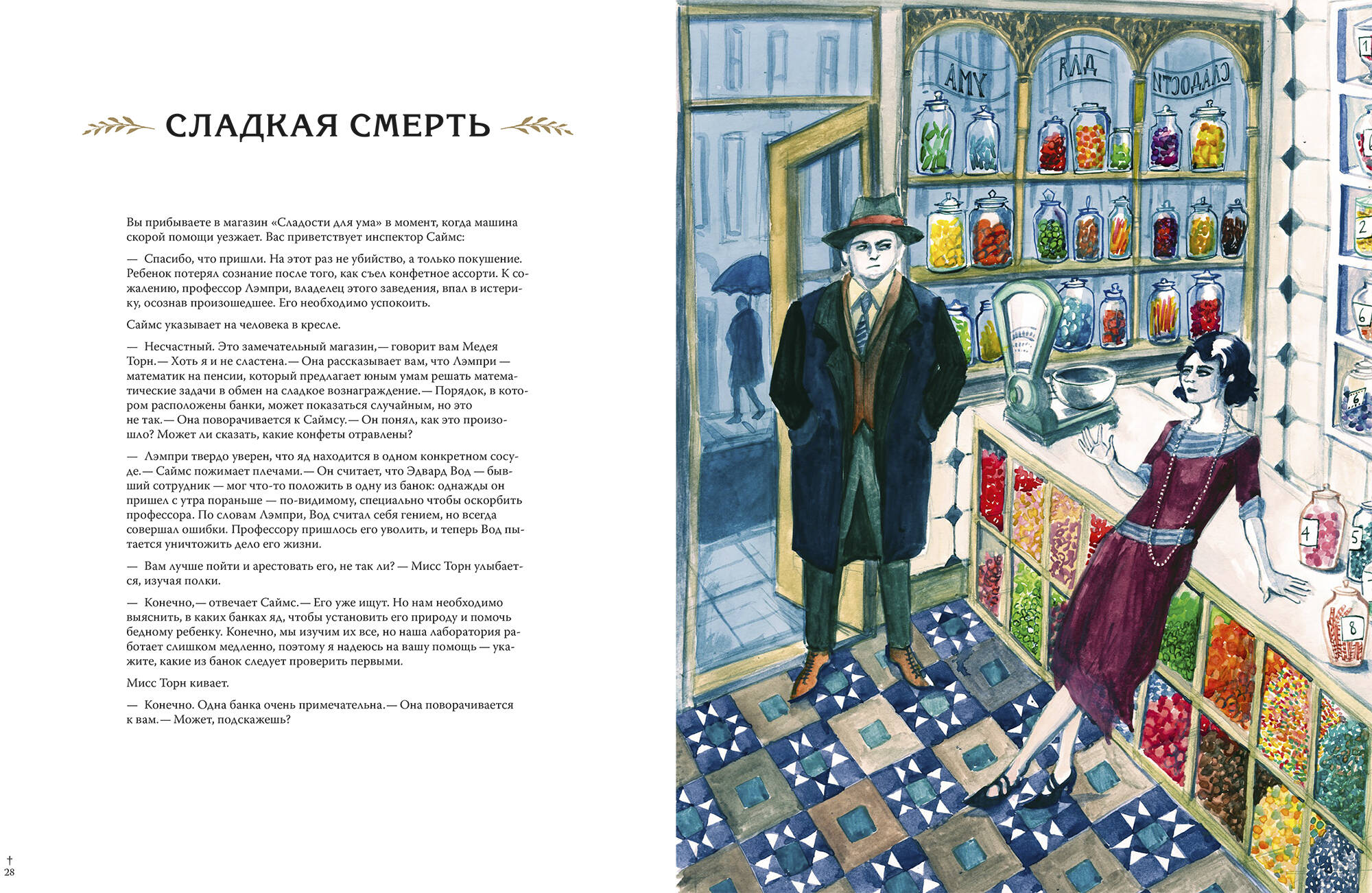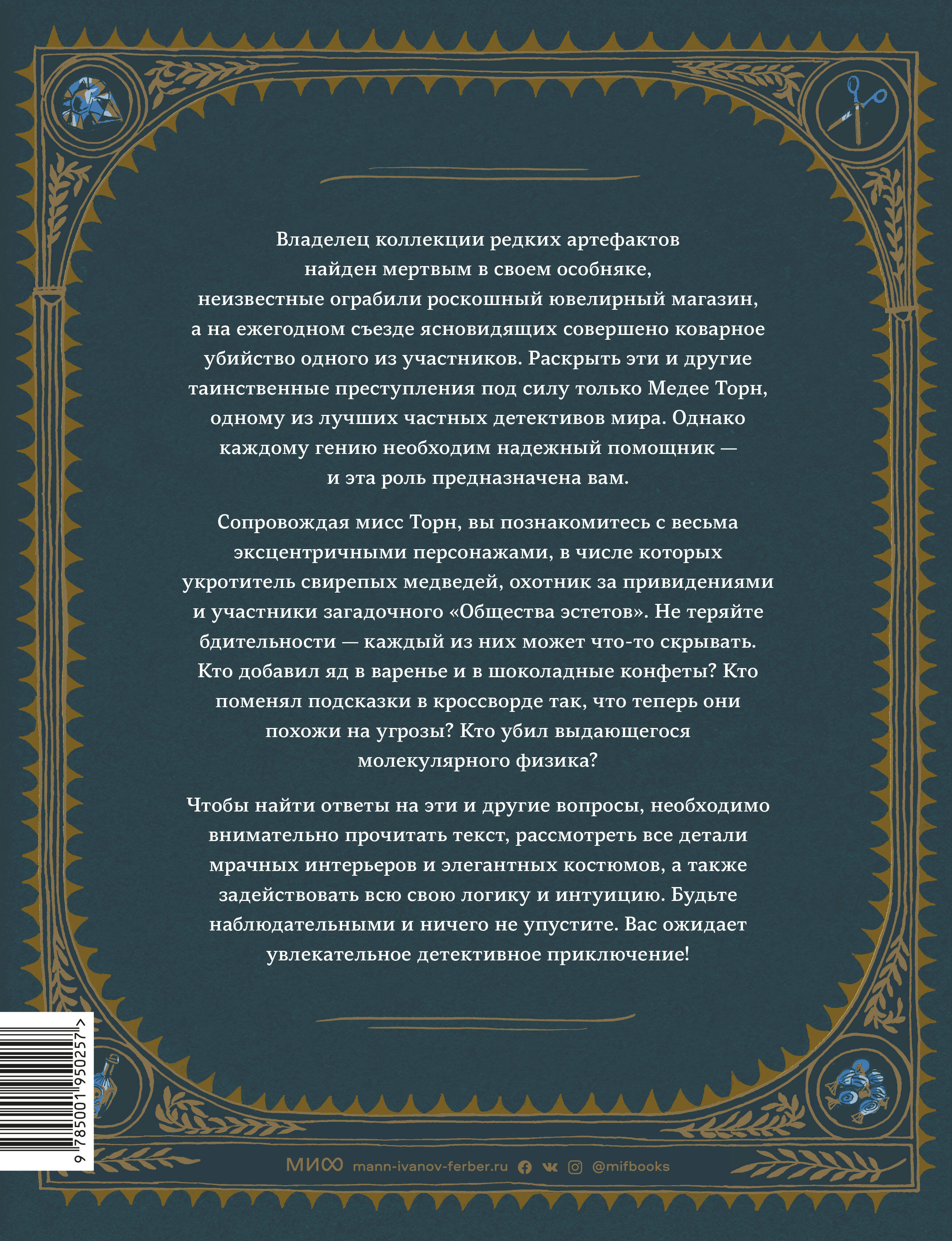 Эта великолепно иллюстрированная книга перенесет вас в атмосферу диких 1920-х. Вы познакомитесь с эксцентричным детективом Медеей Торн и станете ее помощником в расследовании двадцати весьма необычных преступлений. Вам предстоит столкнуться с загадочными убийствами, кражами, отравлениями, загадками прошлого. Кто убил владельца коллекции редких артефактов? Какую страшную тайну хранит заброшенный сад кустарниковых скульптур? Что скрывают участники загадочного "Общества эстетов?" Кто виновен в смерти знаменитого ресторанного критика? Разгадки спрятаны в тексте и иллюстрациях, но найти их непросто. Будьте внимательны и ничего не упустите. Детективное приключение ждет вас! Как читать эту книгу: В книге собраны 20 детективных головоломок. Сначала познакомьтесь с историей, а потом, опираясь на текст и иллюстрации, раскройте преступление. Для кого эта книга: Для любителей головоломок, детективов и загадочных историй.| Издательство | МАНН, ИВАНОВ И ФЕРБЕР ООО |