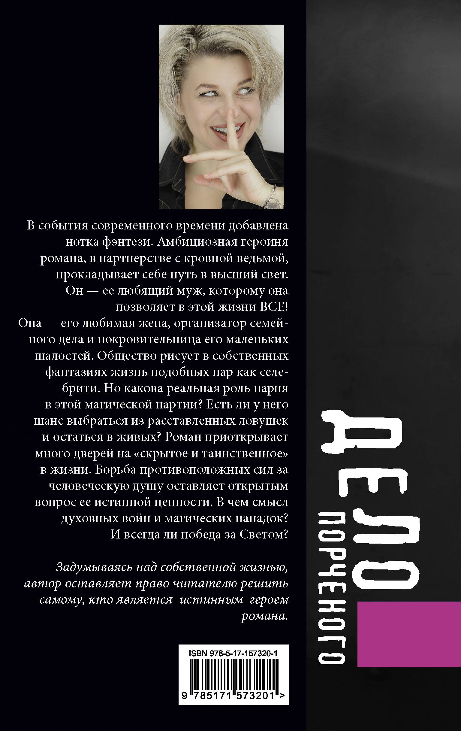 В события современного времени добавлена нотка фэнтези. Амбициозная героиня романа, в партнерстве с кровной ведьмой, прокладывает себе путь в высший свет. Он - ее любящий муж, которому она позволяет в этой жизни все. Она - его любимая жена, организатор семей- ного дела и покровительница его маленьких шалостей. Общество рисует в собственных фантазиях жизнь по- добных пар как селебрити. Но какова реальная роль парня в этой магической партии? Есть ли у него шанс выбраться из расставлен- ных ловушек и остаться в живых? Роман приоткрывает много дверей на «скрытое и та- инственное» в жизни. Борьба противоположных сил за человеческую душу оставляет открытым вопрос ее истинной ценности. В чем смысл духовных войн и магических нападок? И всегда ли победа за Светом? Задумываясь над собственной жизнью, автор остав- ляет право читателю решить самому, кто является истинным героем романа.