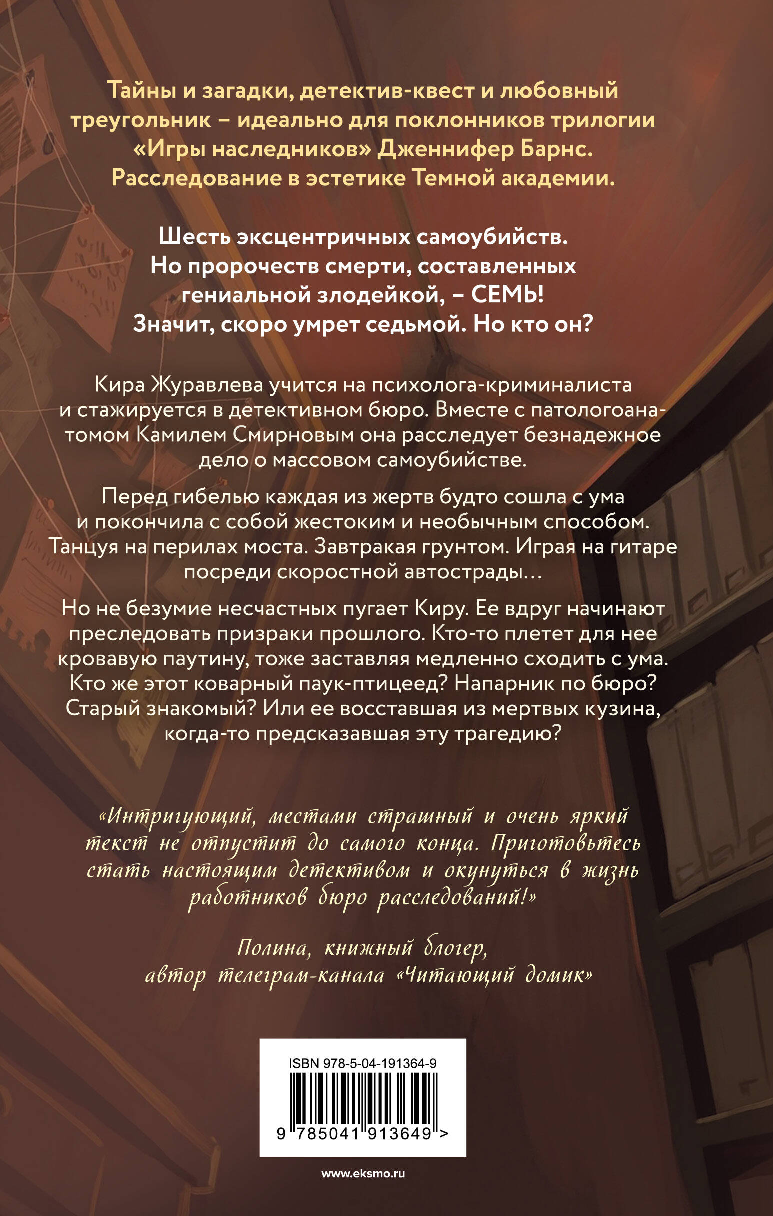 Сумасшествие - первый шаг к убийству. Особенно… если оно у тебя в крови. Тайны и загадки, детектив-квест и любовный треугольник - идеально для поклонников трилогии «Игры наследников» Дженнифер Барнс. Расследование в эстетике Темной академии. Шесть эксцентричных самоубийств. Но пророчеств смерти, составленных гениальной злодейкой, - СЕМЬ! Значит, скоро умрет седьмой. Но кто он? Кира Журавлева учится на психолога-криминалиста и стажируется в детективном бюро. Вместе с патологоанатомом Камилем Смирновым она расследует безнадежное дело о массовом самоубийстве. Перед гибелью каждая из жертв будто сошла с ума и покончила с собой жестоким и необычным способом. Танцуя на перилах моста. Завтракая грунтом. Играя на гитаре посреди скоростной автострады… Но не безумие несчастных пугает Киру. Ее вдруг начинают преследовать призраки прошлого. Кто-то плетет для нее кровавую паутину, тоже заставляя медленно сходить с ума. Кто же этот коварный паук-птицеед? Напарник по бюро? Старый знакомый? Или ее восставшая из мертвых кузина, когда-то предсказавшая эту трагедию? ------------------------------ «Интригующий, местами страшный и очень яркий текст не отпустит до самого конца. Приготовьтесь стать настоящим детективом и окунуться в жизнь работников бюро расследований!» - Полина, книжный блогер, автор телеграм-канала «Читающий домик»| Издательство | ООО "Издательство "Эксмо" |