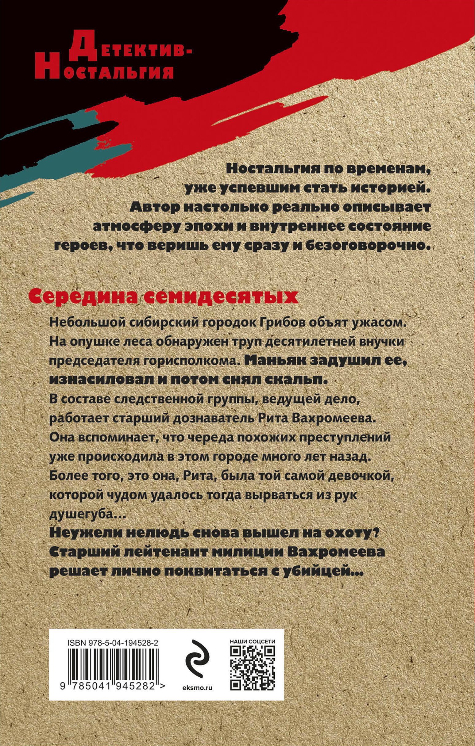 Ностальгия по временам, уже успевшим стать историей. Автор настолько реально описывает атмосферу эпохи и внутреннее состояние героев, что веришь ему сразу и безоговорочно. Середина семидесятых. Небольшой сибирский городок Грибов объят ужасом. На опушке леса обнаружен труп десятилетней внучки председателя горисполкома. Маньяк задушил ее, изнасиловал и потом снял скальп. В составе следственной группы, ведущей дело, работает старший дознаватель Рита Вахромеева. Она вспоминает, что череда похожих преступлений уже происходила в этом городе много лет назад. Более того, это она, Рита, была той самой девочкой, которой чудом удалось тогда вырваться из рук душегуба… Неужели нелюдь снова выше на охоту? Старший лейтенант милиции Вахромеева решает лично поквитаться с убийцей… Уникальная возможность на время вернуться в недавнее прошлое и в ощущении полной реальности прожить вместе с героями самый отчаянный отрезок их жизни.| Издательство | ООО "Издательство "Эксмо" |