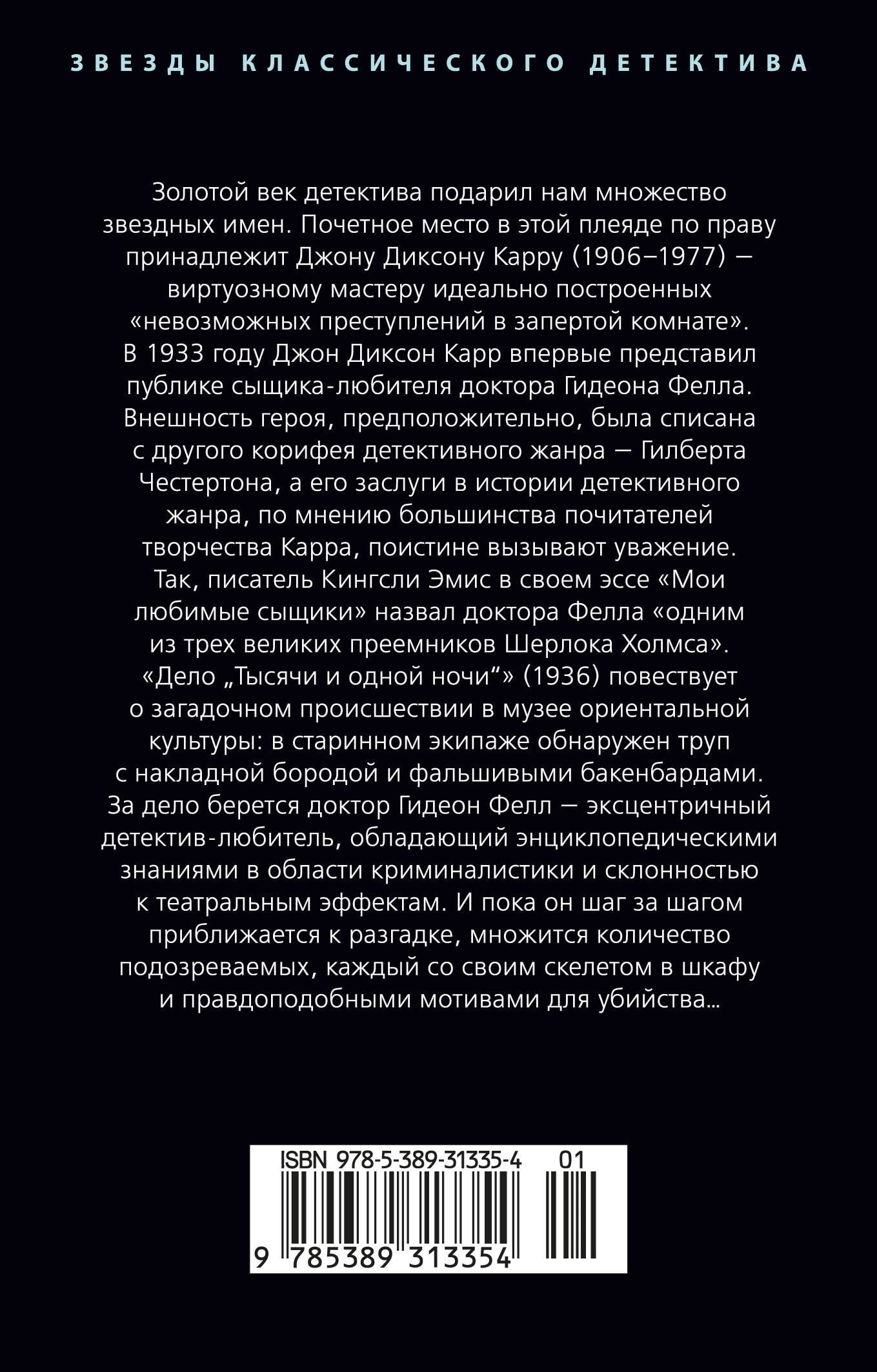 Золотой век детектива подарил нам множество звездных имен. Почетное место в этой плеяде по праву принадлежит Джону Диксону Карру (1906-1977) - виртуозному мастеру идеально построенных «невозможных преступлений в запертой комнате». В 1933 году Джон Диксон Карр впервые представил публике сыщика-любителя доктора Гидеона Фелла. Внешность героя, предположительно, была списана с другого корифея детективного жанра - Гилберта Честертона, а его заслуги в истории детективного жанра, по мнению большинства почитателей творчества Карра, поистине вызывают уважение. Так, писатель Кингсли Эмис в своем эссе «Мои любимые сыщики» назвал доктора Фелла «одним из трех великих преемников Шерлока Холмса». «Дело "Тысячи и одной ночи"» (1936) повествует о загадочном происшествии в музее ориентальной культуры: в старинном экипаже обнаружен труп с накладной бородой и фальшивыми бакенбардами. За дело берется доктор Гидеон Фелл - эксцентричный детектив-любитель, обладающий энциклопедическими знаниями в области криминалистики и склонностью к театральным эффектам. И пока он шаг за шагом приближается к разгадке, множится количество подозреваемых, каждый со своим скелетом в шкафу и правдоподобными мотивами для убийства… Прекрасный подарок для всех любителей хорошего детектива.