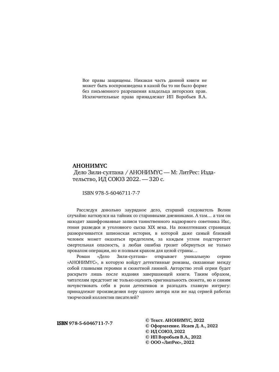 Расследуя довольно заурядное дело, старший следователь Волин случайно наткнулся на тайник со старинными дневниками. А там… а там он находит зашифрованные записи таинственного надворного советника Икс, гения разведки и уголовного сыска XIX века. На пожелтевших страницах разворачивается шпионская история, в которой даже самый близкий человек может оказаться предателем, за каждым углом подстерегает смертельная опасность, а любая ошибка грозит обернуться не только провалом операции, но и полным крахом для целой страны… Роман «Дело Зили-султана» открывает уникальную серию «АНОНИМYС», в которую войдут детективные романы, связанные между собой главными героями и сюжетной линией. Авторство этой серии будет раскрыто лишь после издания завершающей книги. Таким образом, читателям предстоит не только оценить оригинальность сюжета, но и самим почувствовать себя в роли детективов и разгадать главную интригу: принадлежат произведения перу одного автора или же над серией работал творческий коллектив писателей?