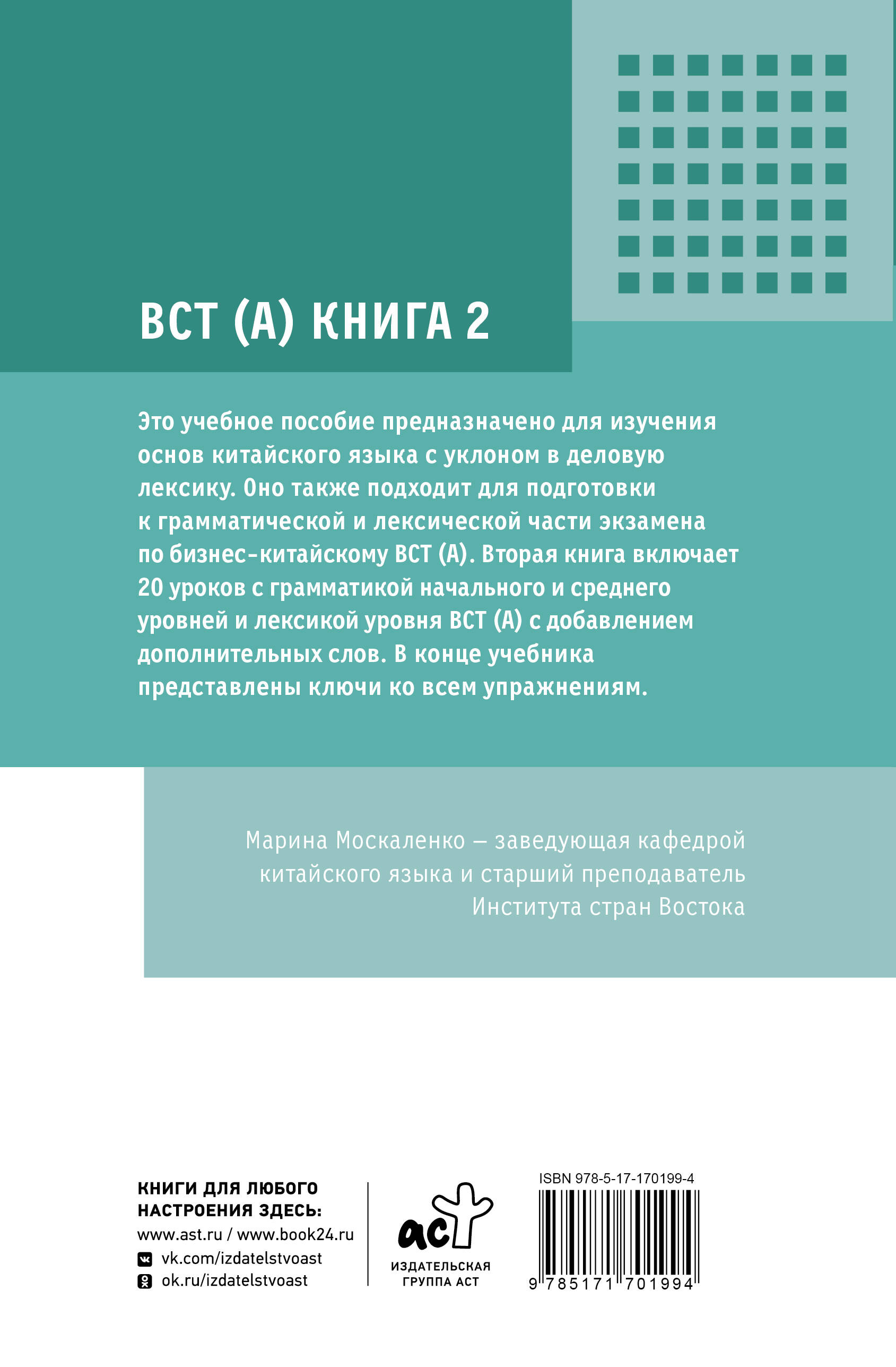 Марина Москаленко - заведующая кафедрой китайского языка и старший преподаватель Института стран Востока. Это учебное пособие предназначено для изучения основ китайского языка с уклоном в деловую лексику. Оно также подходит для подготовки к грамматической и лексической части экзамена по бизнес-китайскому BCT (A). Вторая книга включает 20 уроков с грамматикой начального и среднего уровней и лексикой уровня BCT (A) с добавлением дополнительных слов. В конце учебника представлены ключи ко всем упражнениям. Книга адресована всем, кто хочет овладеть базовыми деловыми фразами на китайском языке, и подойдет как обучающимся с нуля, так и тем, кто уже изучает язык самостоятельно или на курсах.| Издательство | Издательство "АСТ" |