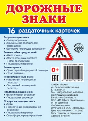 16 раздаточных карточек размером 63х87 мм для познавательного и речевого развития. На обороте каждой карточки - название дорожных знаков на русском и английском языках.3 Состав комплекта: Запрещающие знаки: «Въезд запрещен», «Движение на велосипедах запрещено», «Движение пешеходов запрещено». Знаки особых предписаний: «Жилая зона», «Место остановки автобуса и (или) троллейбуса», «Пешеходный переход». Знаки сервиса: «Пункт первой медицинской помощи», «Пункт питания». Информационные знаки: «Надземный пешеходный переход», «Подземный пешеходный переход». Предписывающие знаки: «Велосипедная дорожка», «Пешеходная дорожка». Предупреждающие знаки: «Дети», «Пересечение с велосипедной дорожкой», «Пешеходный переход», «Светофорное регулирование».| Издательство | М.: ТЦ СФЕРА |