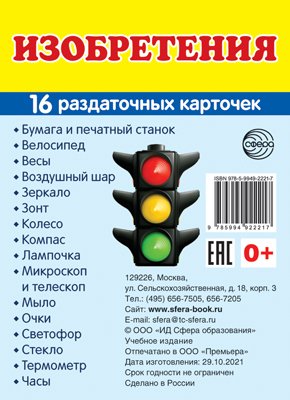 16 раздаточных карточек размером 63х87 мм для познавательного и речевого развития. На обороте каждой карточки - название изобретений на русском и английском языках. Список картинок: 1.Бумага и печатный станок 2.Велосипед 3.Весы 4.Воздушный шар 5.Зеркало 6.Зонт 7.Колесо 8.Компас 9.Лампочка 10.Микроскоп и телескоп 11.Мыло 12.Очки 13.Светофор 14.Стекло 15.Термометр 16.Часы| Издательство | М.: ТЦ СФЕРА |