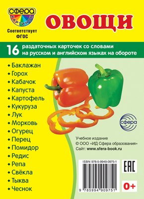 16 раздаточных карточек размером 63х87 мм для познавательного и речевого развития. На обороте каждой карточки - название на русском и английском языках. 1. Баклажан 2. Горох 3. Кабачок 4. Капуста 5. Картофель 6. Кукуруза 7. Лук 8. Морковь 9. Огурец 10. Перец 11. Помидор 12. Редис 13. Репа 14. Свёкла 15. Тыква 16. Чеснок| Издательство | М.: ТЦ СФЕРА |