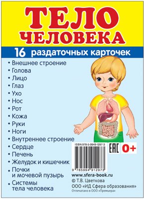 16 раздаточных карточек размером 63х87 мм для познавательного и речевого развития. На обороте каждой карточки - название органов тела человека на русском и английском языках. 1. Внешнее строение 2. Голова 3. Лицо 4. Глаз 5. Ухо 6. Нос 7. Рот 8. Кожа 9. Руки 10. Ноги 11. Внутреннее строение 12. Сердце 13. Печень 14. Желудок и кишечник 15. Почки и мочевой пузырь 16. Системы тела человека| Издательство | М.: ТЦ СФЕРА |