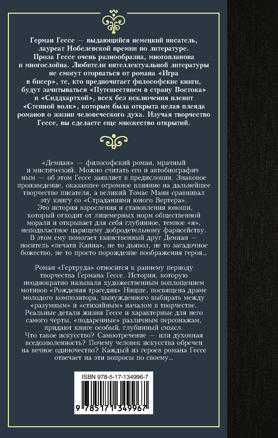 "Демиан" - философский роман, мрачный и мистический. Можно считать его и автобиографичным - об этом Гессе заявляет в предисловии. Знаковое произведение, оказавшее огромное влияние на дальнейшее творчество писателя, а великий Томас Манн сравнивал эту книгу со "Страданиями юного Вертера". Это история взросления и становления юноши, который отходит от лицемерных норм общественной морали и открывает для себя глубинное, темное "я", неподвластное царящему вокруг добродетельному фарисейству. В этом ему помогает таинственный друг Демиан - носитель "печати Каина", не то дьявол, не то загадочное божество, не то просто порождение воображения героя… Роман "Гертруда" относится к раннему периоду творчества Германа Гессе. История, которую неоднократно называли художественным воплощением мотивов "Рождения трагедии" Ницше, посвящена драме молодого композитора, вынужденного выбирать между "разумным" и "стихийным" началом в творчестве. Реальные детали жизни Гессе и характерные для него самого черты, "подаренные" различным персонажам, придают книге особый, глубинный смысл. Что такое искусство? Самоотречение - или духовная вседозволенность? Почему человек искусства обречен на вечное одиночество? Каждый из героев романа Гессе отвечает на эти вопросы по-своему…| Издательство | ИЗДАТЕЛЬСТВО "АСТ" |