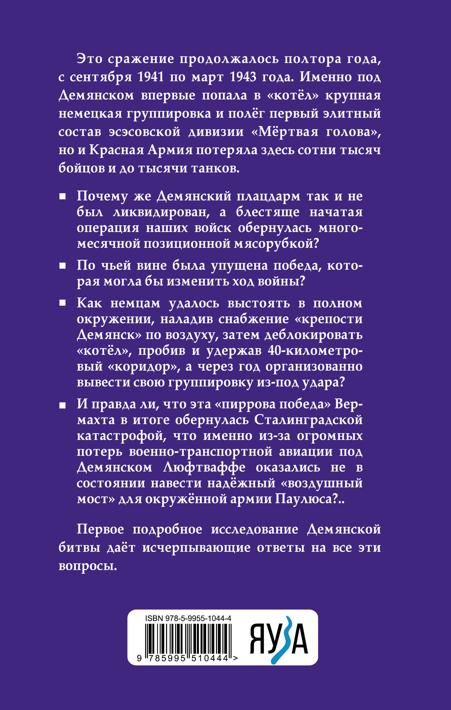 Это сражение продолжалось полтора года, с сентября 1941 по март 1943 года. Именно под Демянском впервые попала в «котел» крупная немецкая группировка и полег первый элитный состав эсэсовской дивизии «Мертвая голова», но и Красная Армия потеряла здесь сотни тысяч бойцов и до тысячи танков. Почему же Демянский плацдарм так и не был ликвидирован, а блестяще начатая операция наших войск обернулась многомесячной позиционной мясорубкой? По чьей вине была упущена победа, которая могла бы изменить ход войны? Как немцам удалось выстоять в полном окружении, наладив снабжение «крепости Демянск» по воздуху, затем деблокировать «котел», пробив и удержав 40-километровый «коридор», а через год организованно вывести свою группировку из-под удара? И правда ли, что эта «пиррова победа» Вермахта в итоге обернулась Сталинградской катастрофой, что именно из-за огромных потерь военно-транспортной авиации под Демянском Люфтваффе оказались не в состоянии навести надежный «воздушный мост» для окруженной армии Паулюса?.. Первое подробное исследование Демянской битвы дает исчерпывающие ответы на все эти вопросы.| Издательство | Яуза-пресс ООО |