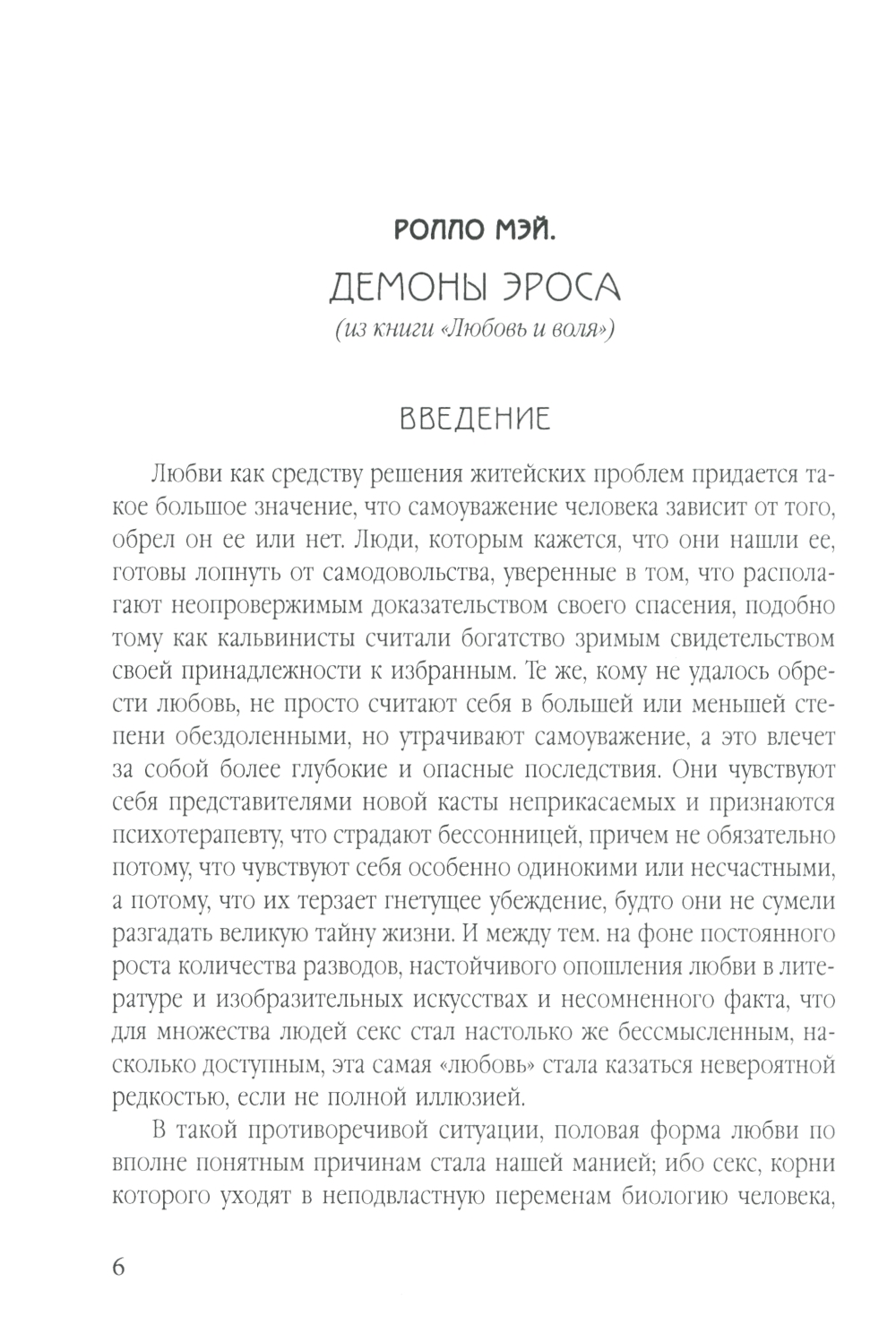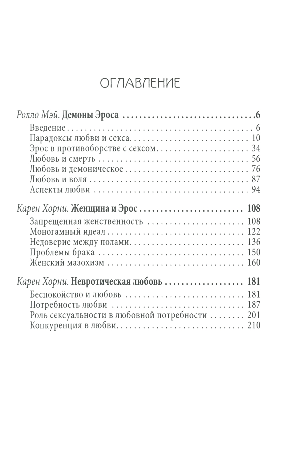 «"Эрот - даймон" - сказано в "Пире" Платона. Вот так просто и прямо Платон посвящает нас и своих пирующих друзей в глубинные аспекты любви. Демон - это отнюдь не живое существо; под ним следует понимать фундаментальную, архетипическую функцию человеческих переживаний - экзистенциальную реальность современного человека. Демоническое может быть как созидательным так и разрушительным - когда один элемент узурпирует власть над всей личностью, мы имеем дело с "одержимостью демоном", что является традиционным определением психоза», - пишет Ролло Мэй (1909 - 1994), американский психолог и психотерапевт, теоретик экзистенциальной психологии. Карен Хорни ((1885 - 1952) - американский психоаналитик и психолог, одна из ключевых фигур неофрейдизма - тоже говорит об опасностях «демона Эроса» для психоэмоционального состояния человека. Считая, вслед за Фрейдом, что любая патология это лишь «увеличительное стекло» для выявления характерных особенностей человеческой психики, Хорни показывает темные и светлые стороны любви на примере невротических личностей, а также обращает особое внимание на проблемы женской сексуальности.| Издательство | Родина |
