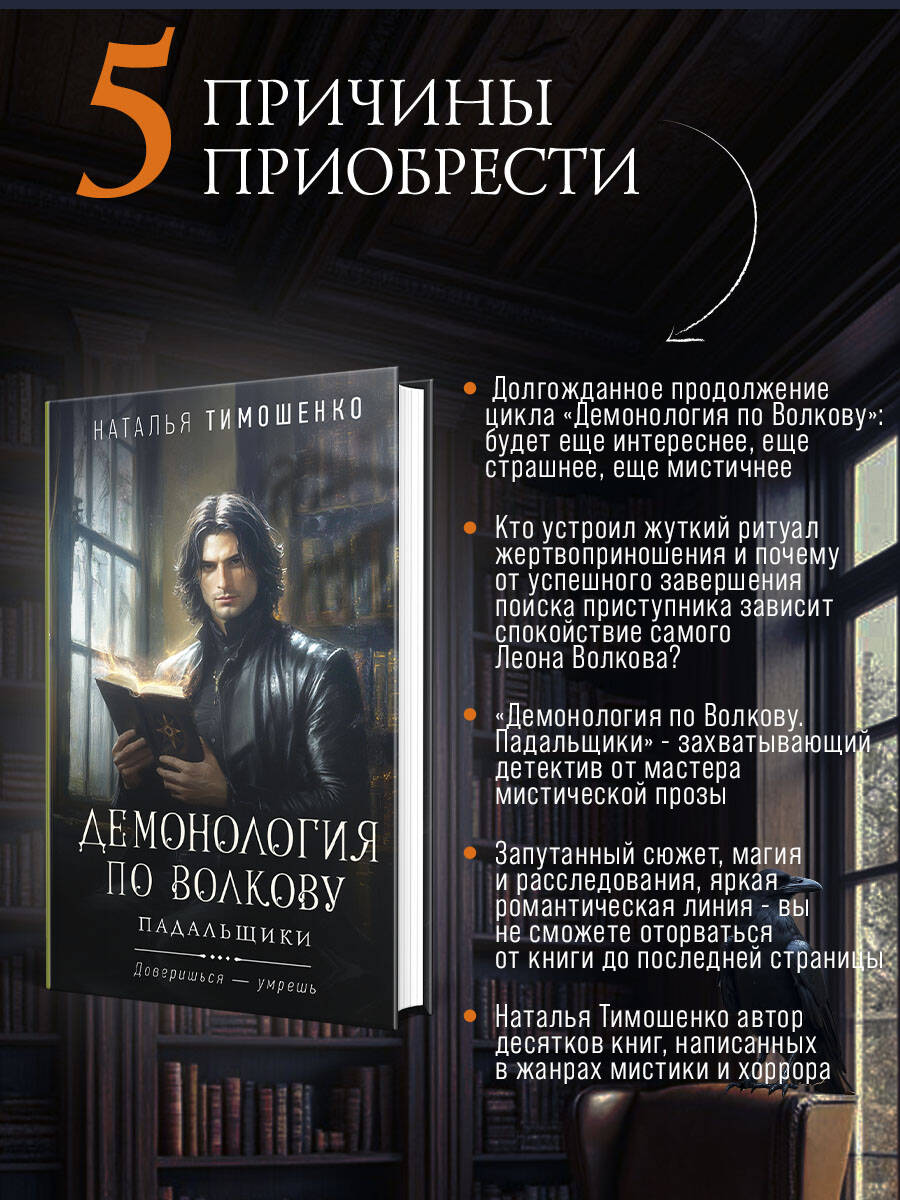 Вторая книга цикла «Демонология по Волкову» мастера мистического романа Натальи Тимошенко. Алиса уже месяц работает на темного колдуна Леона Волкова. Но их последняя встреча с бездушным привлекла внимание полиции. И теперь, чтобы не запятнать репутацию, Леону и его команде предстоит расследовать новое пугающее дело.| Издательство | ООО "Издательство "Эксмо" |