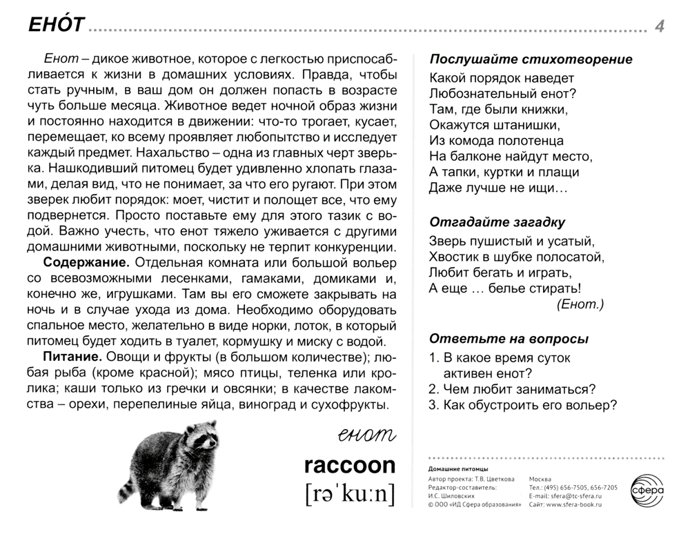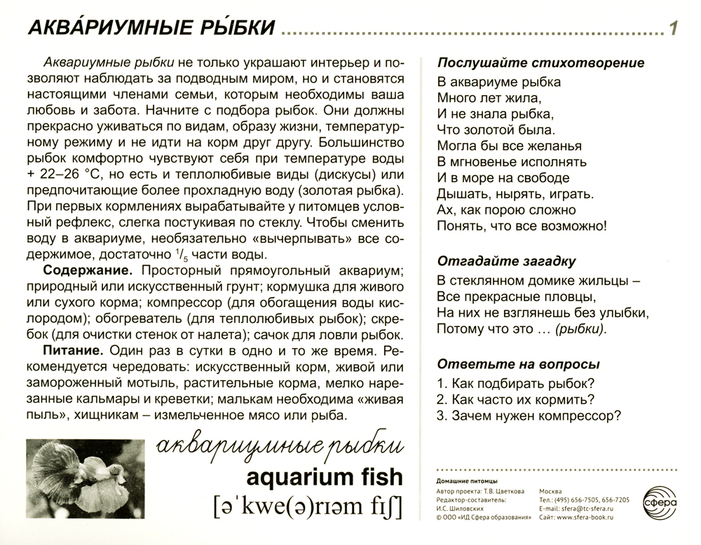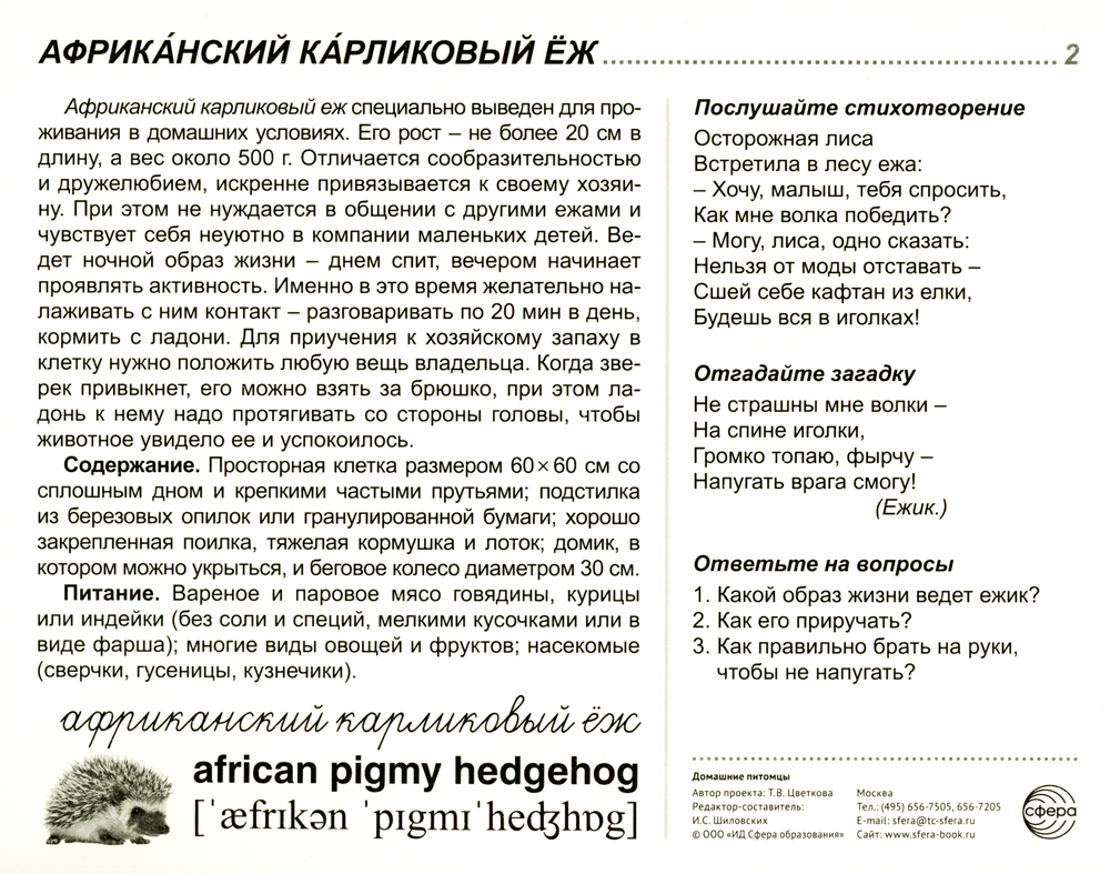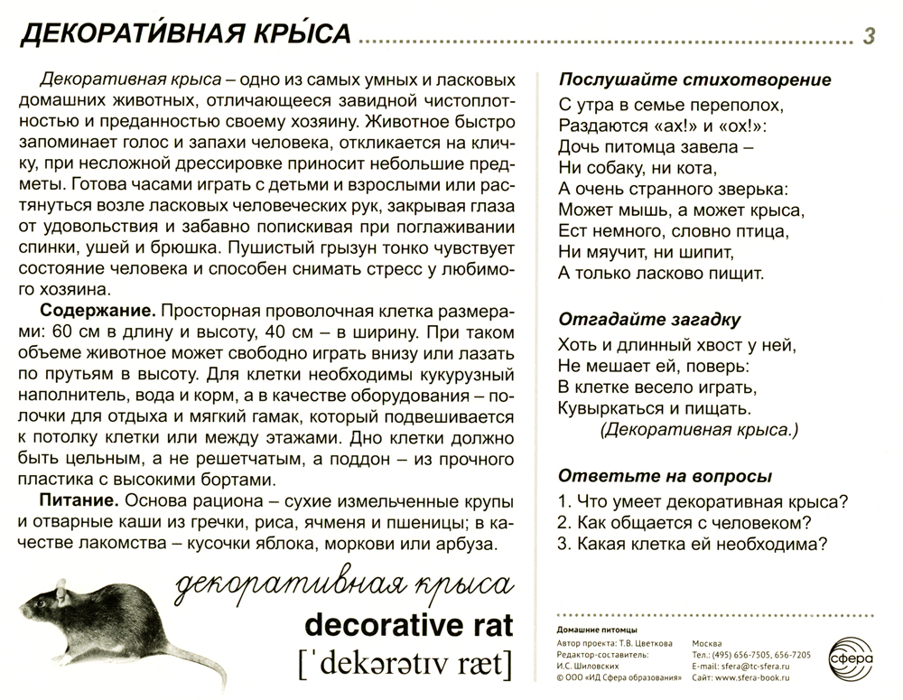 Издательство «ТЦ Сфера» представляет комплект серии «Сфера картинок» под названием «Домашние питомцы». Он состоит из 16 цветных демонстрационных карточек (картинок) и адресован детям и их родителям, желающим не только познакомиться с особенностями того или иного животного, но и при желании взять его в семью на воспитание. На лицевой стороне каждой карточки дается цветное изображение домашнего питомца, на обратной - подробное описание, из которого дети узнают немало важных фактов о правильном воспитании животного, уходе за ним, содержании и кормлении. Для лучшего закрепления материала представлены оригинальные стихотворения и рифмованные загадки по теме, а также вопросы, на которые ребенок ответит после изучения материала или беседы со взрослым. Комплект подходит для индивидуальной и групповой работы.