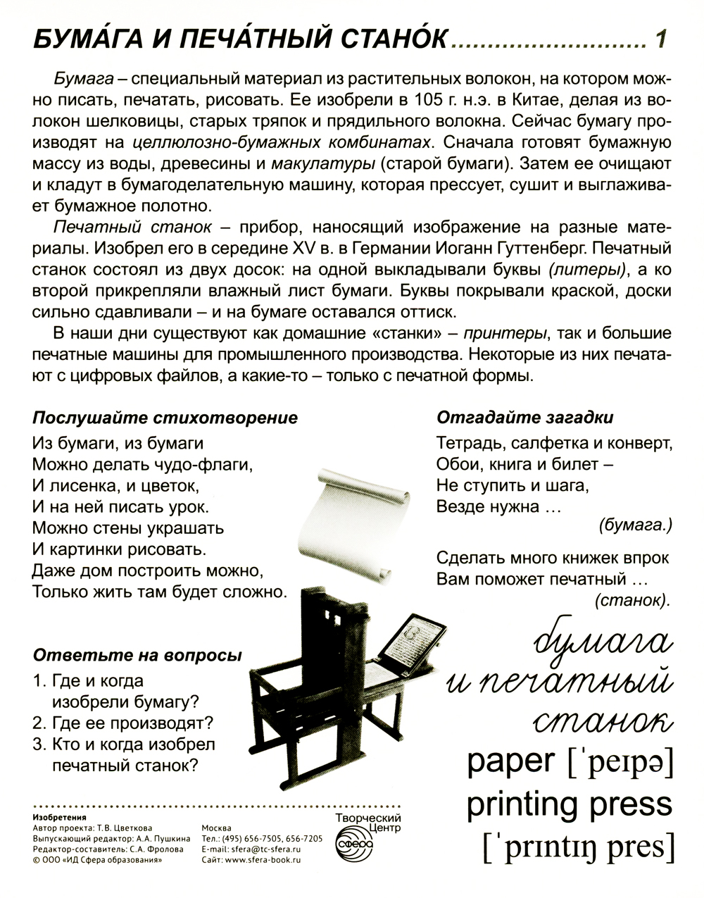 Издательство «ТЦ Сфера» представляет комплект серии «Сфера картинок» под названием «Изобретения». Он состоит из 16 цветных демонстрационных карточек (картинок) и адресован детям и их родителям, желающим познакомиться с самыми важными, а порой и необычными изобретениями, которые в наше время стали жизненно важными и необходимыми в повседневной деятельности. На лицевой стороне каждой карточки дается цветное изображение какого-либо изобретения, на обратной - подробное описание, из которого дети узнают много интересного и поучительного. Для лучшего закрепления материала представлены оригинальные стихотворения и рифмованные загадки по теме, а также вопросы, на которые ребенок ответит после изучения материала или беседы со взрослым. Название каждой статьи имеет перевод на английский язык и транскрипцию.| Издательство | Творческий центр Сфера |