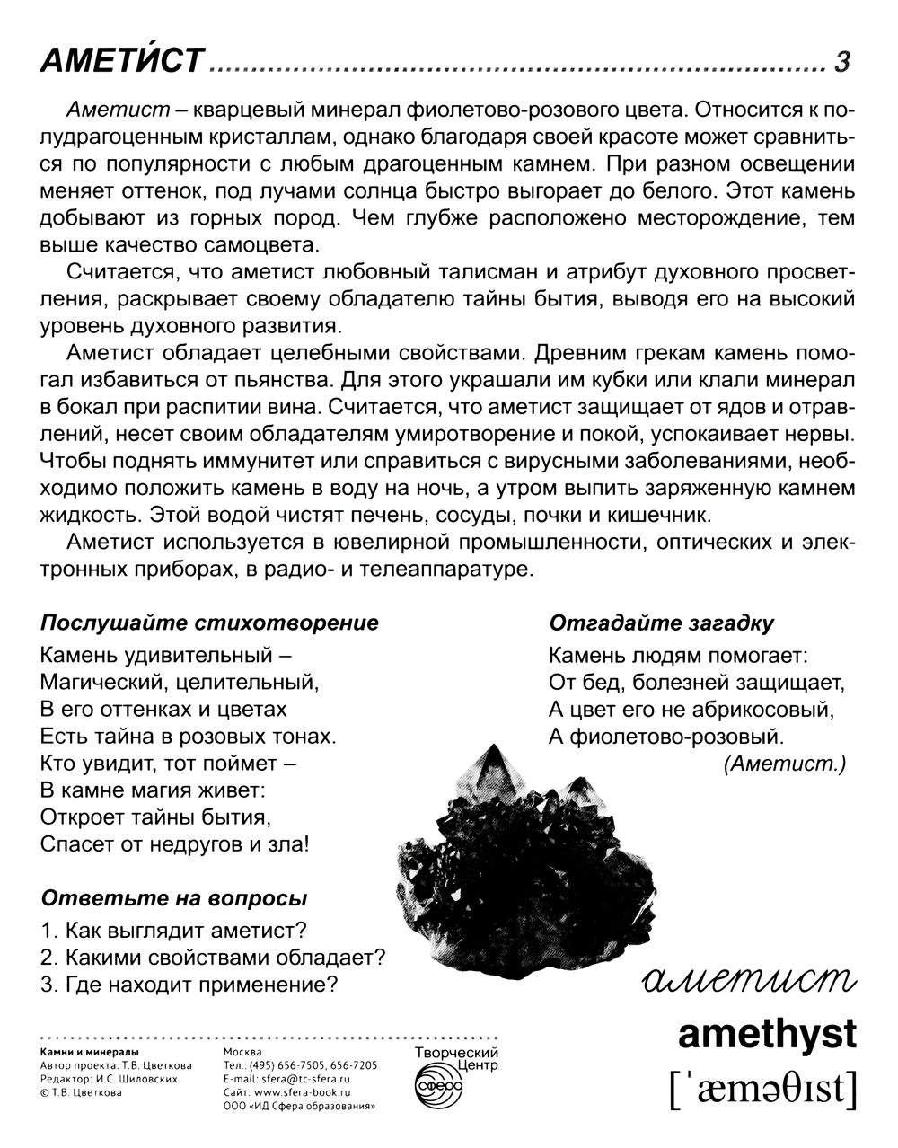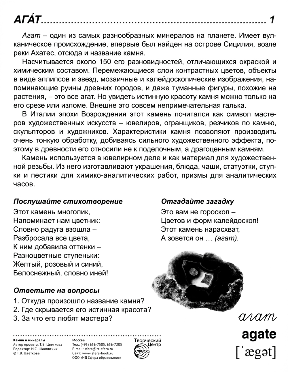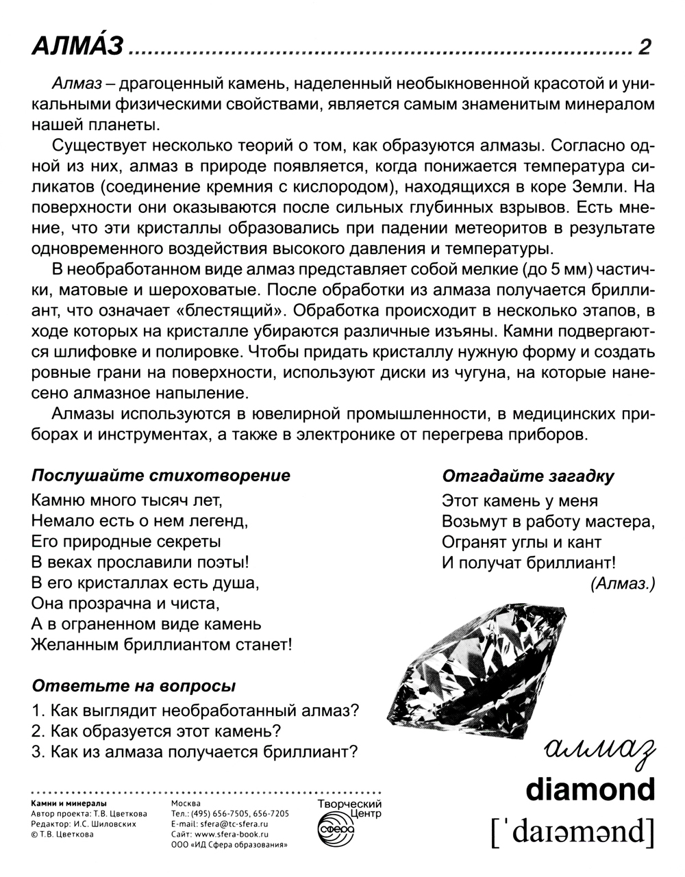 Издательство «ТЦ Сфера» представляет комплект серии «Сфера картинок» под названием «Камни и минералы». Он состоит из 16 цветных демонстрационных карточек (картинок) и адресован детям и их родителям, желающим познакомиться с самыми известными драгоценными и полудрагоценными камнями нашей планеты, узнать их предназначение, свойства и роль в жизнедеятельности человека. На лицевой стороне каждой карточки дается цветное изображение камня в необработанном и обработанном видах, на обратной - подробное описание, из которого дети узнают много интересного и даже поучительного! Для лучшего закрепления материала представлены оригинальные стихотворения и рифмованные загадки по теме, а также вопросы, на которые ребенок ответит после изучения материала или беседы со взрослым. Название каждой статьи имеет перевод на английский язык и транскрипцию.| Издательство | Творческий центр Сфера |