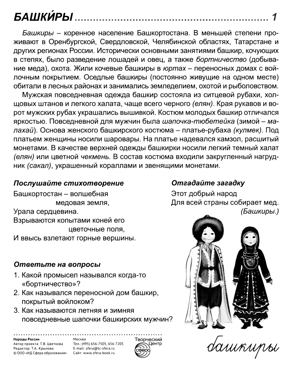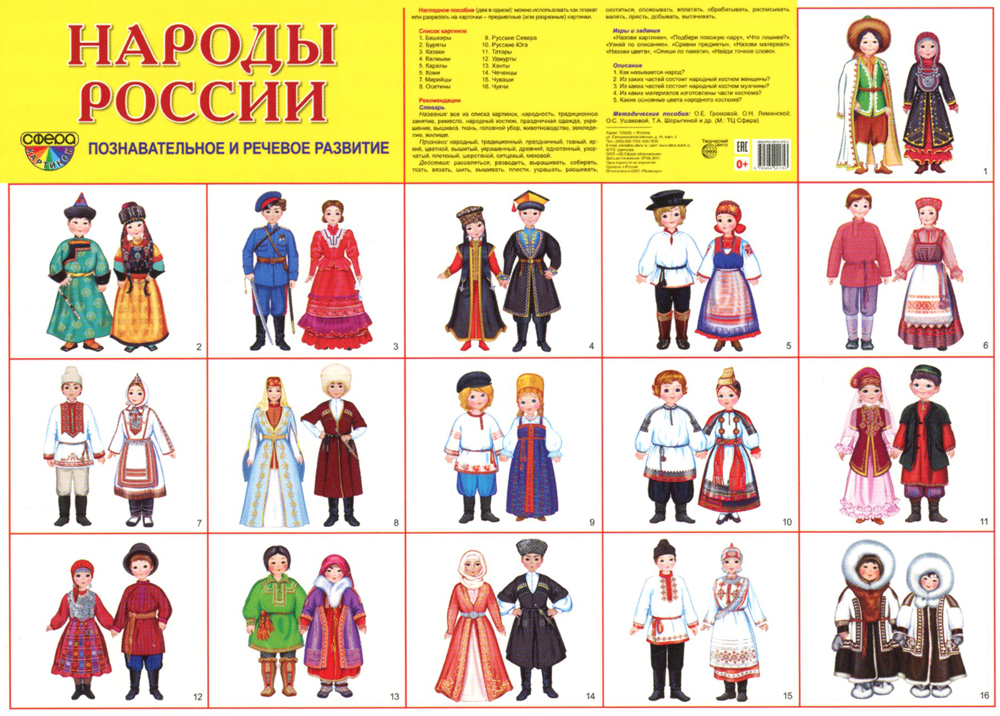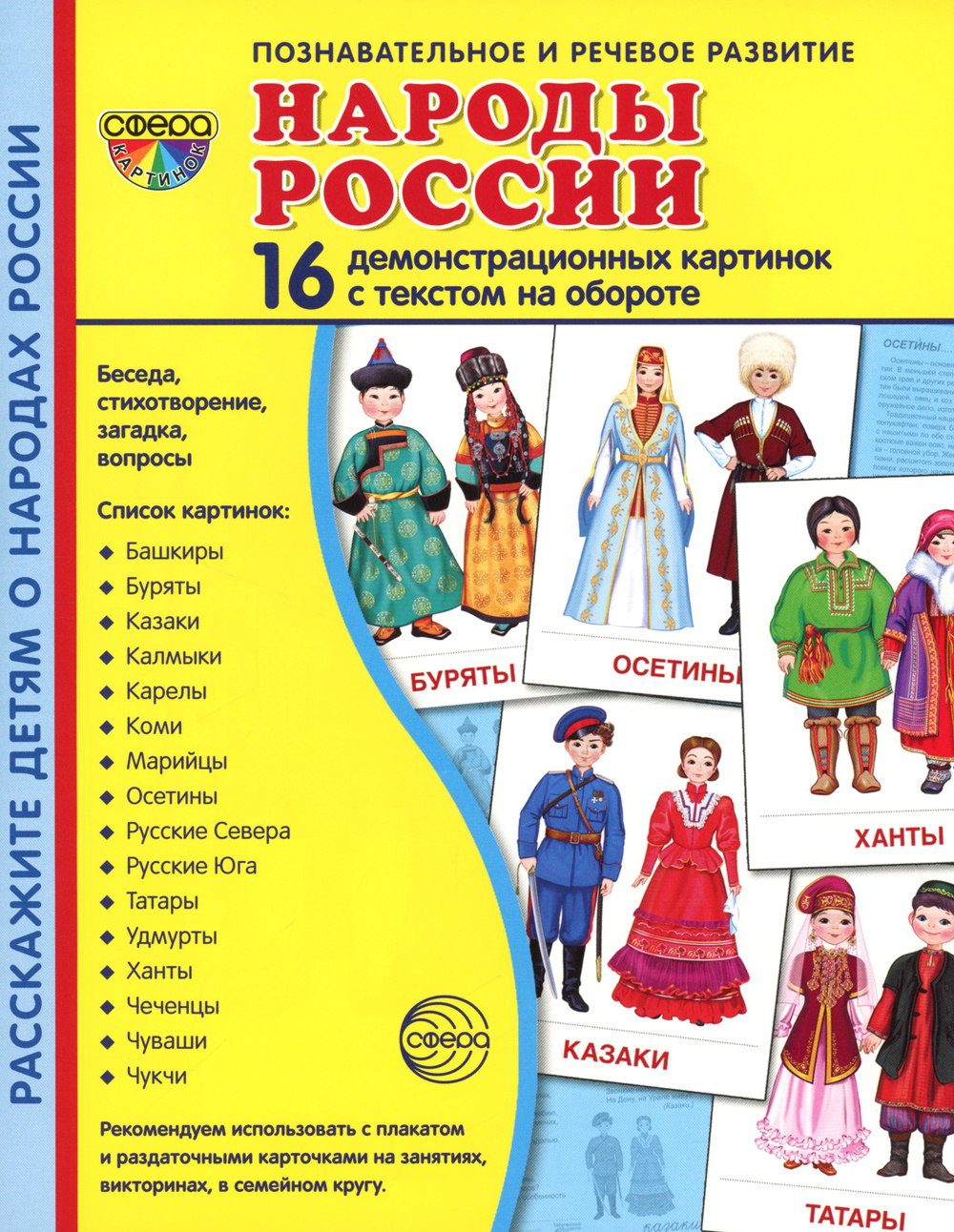 16 демонстрационных картинок размером 173х220 мм для познавательного и речевого развития. На обороте каждой предметной картинки - описание, стихотворение, загадка, вопросы для ребёнка, название на русском и английском языках. 1. Башкиры; 2. Буряты; 3. Казаки; 4. Калмыки; 5. Карелы; 6. Коми; 7. Марийцы; 8. Осетины; 9. Русские Севера; 10. Русские Юга; 11. Татары; 12. Удмурты; 13. Ханты; 14. Чеченцы; 15. Чуваши; 16. Чукчи.| Издательство | Творческий центр Сфера |