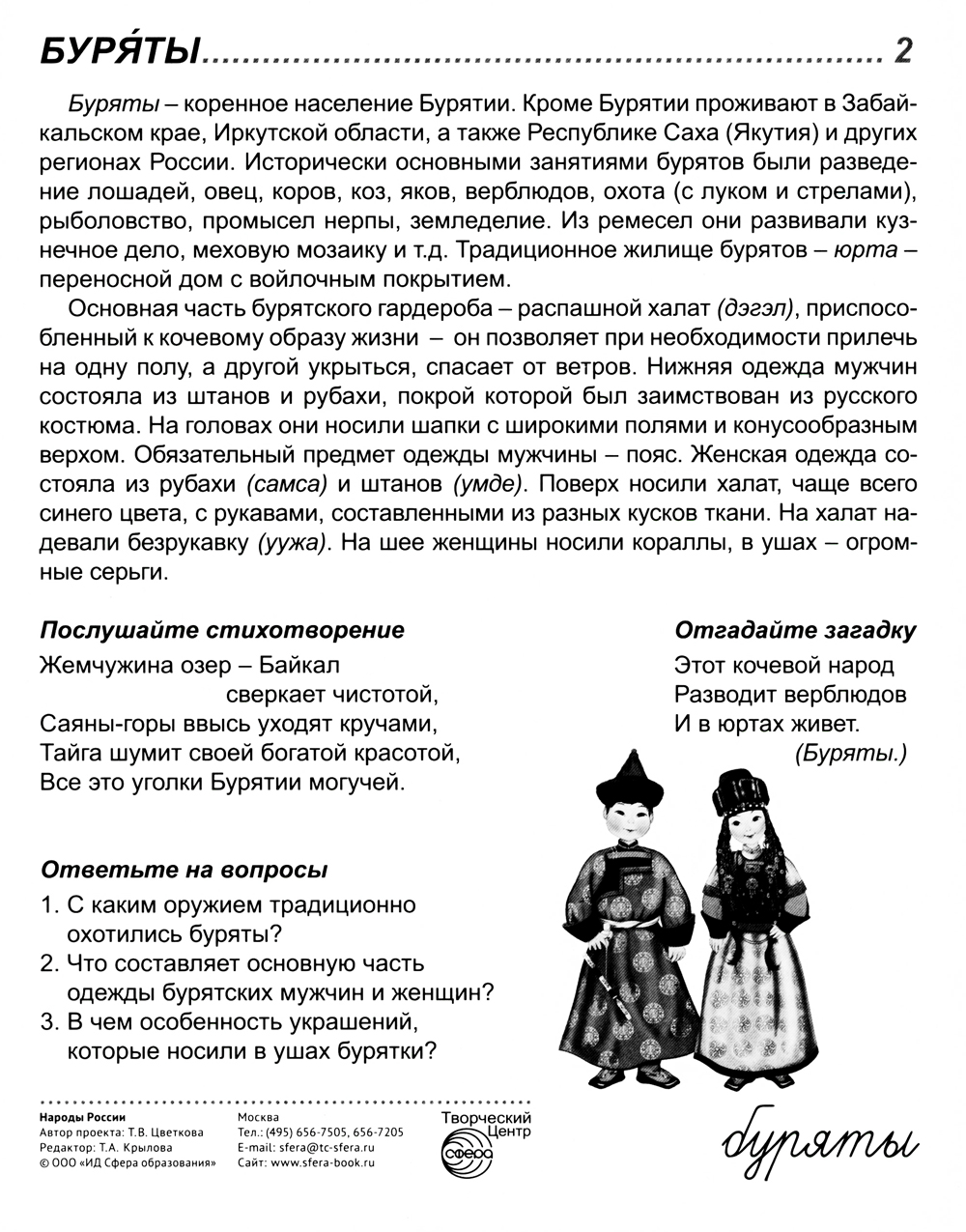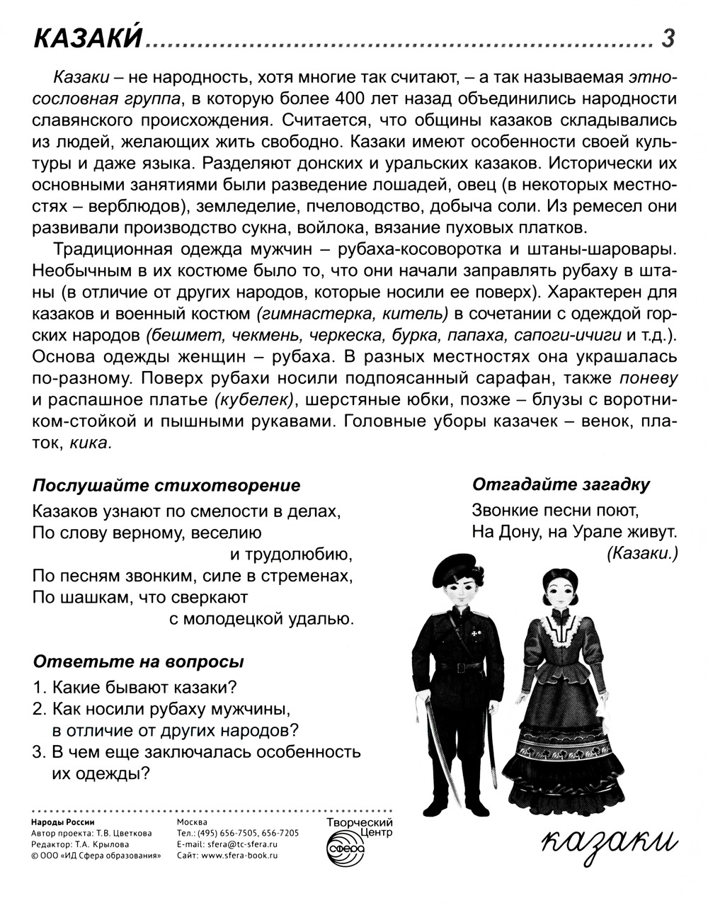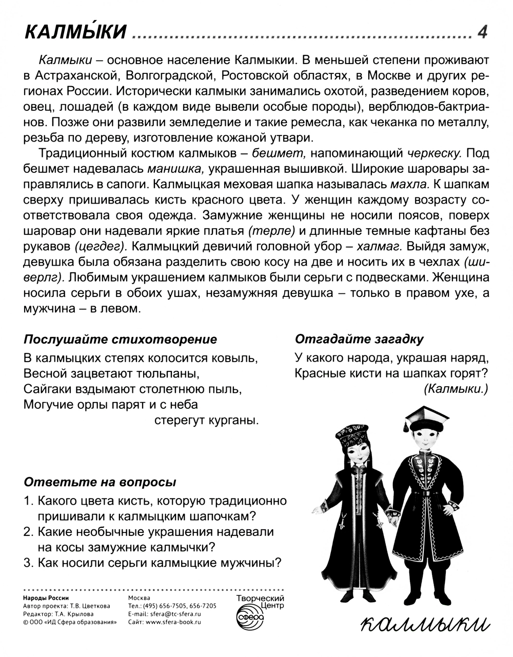 16 демонстрационных картинок размером 173х220 мм для познавательного и речевого развития. На обороте каждой предметной картинки - описание, стихотворение, загадка, вопросы для ребёнка, название на русском и английском языках. 1. Башкиры; 2. Буряты; 3. Казаки; 4. Калмыки; 5. Карелы; 6. Коми; 7. Марийцы; 8. Осетины; 9. Русские Севера; 10. Русские Юга; 11. Татары; 12. Удмурты; 13. Ханты; 14. Чеченцы; 15. Чуваши; 16. Чукчи.| Издательство | Творческий центр Сфера |