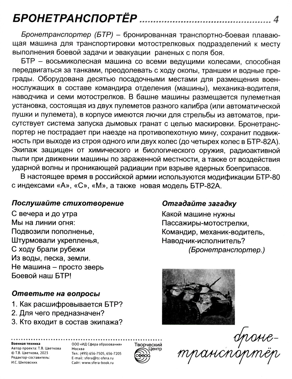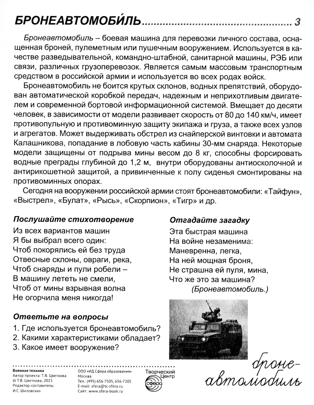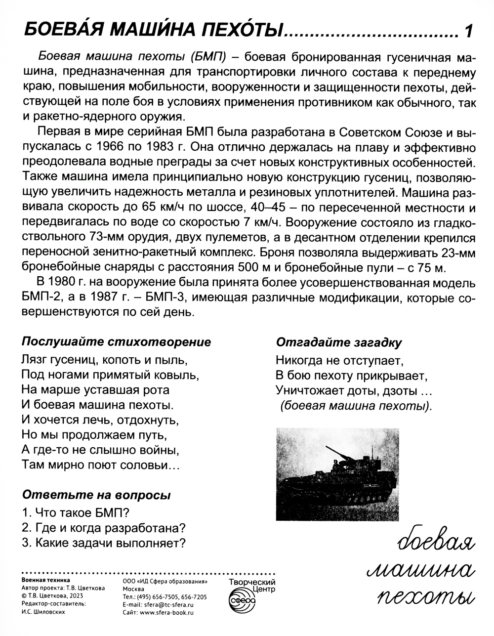 Издательство «ТЦ Сфера» представляет комплект серии «Сфера картинок» под названием «Военная техника». Он состоит из 16 цветных демонстрационных карточек (картинок) и адресован детям и их родителям, желающим познакомиться с современной военной техникой, использовавшейся военнослужащими разных родов войск. На лицевой стороне каждой карточки дается цветное изображение, на обратной - подробное описание, из которого дети узнают немало интересного о различной военной технике. Для лучшего закрепления материала представлены оригинальные стихотворения и загадки по теме, а также задания, которые ребенок может выполнить самостоятельно или с помощью взрослого. Комплект подходит для индивидуальной и групповой работы, может использоваться на тематических викторинах.| Издательство | Творческий центр Сфера |