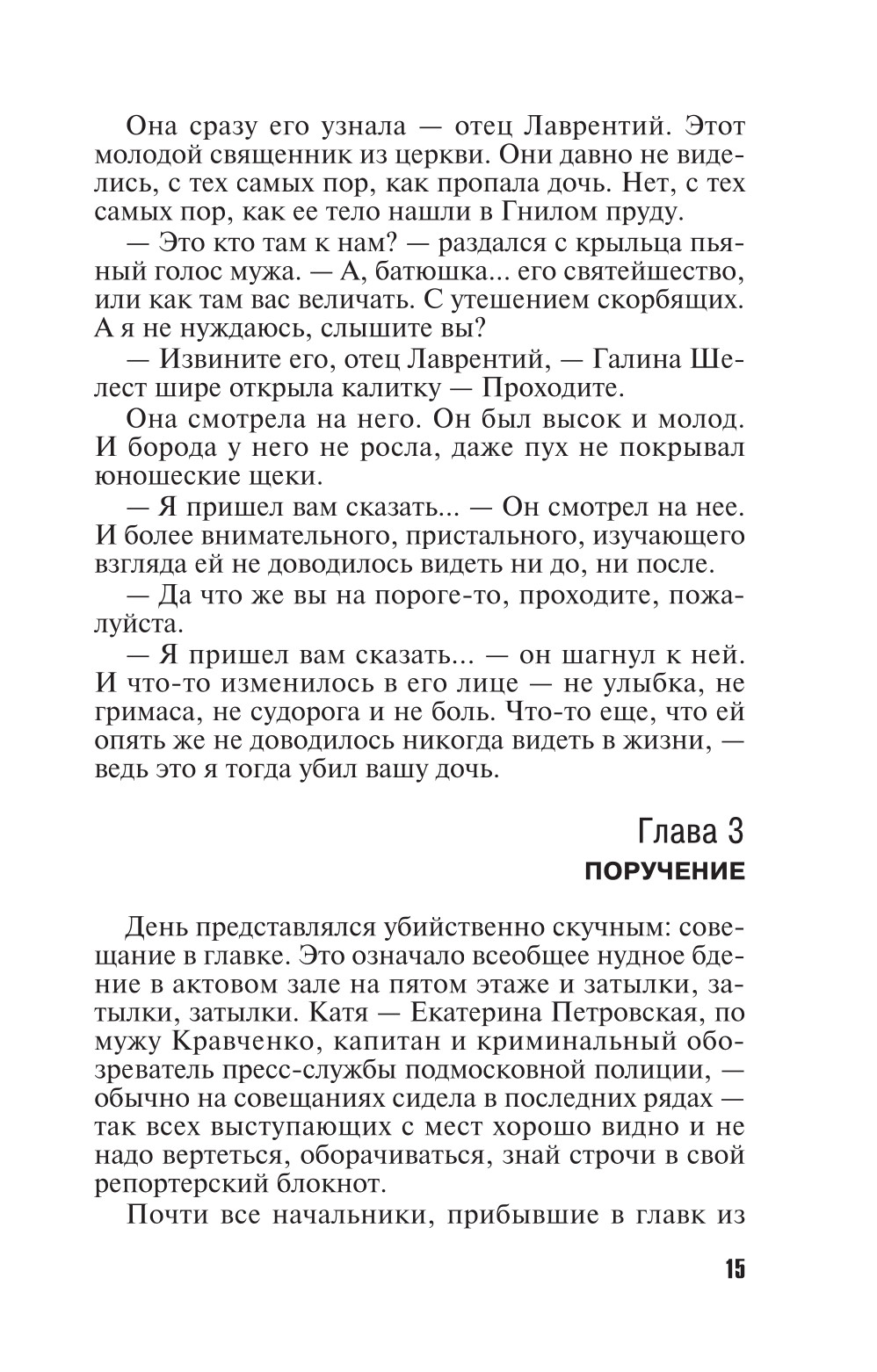 Подмосковный город Новый Иордан потрясло убийство Марии Шелест. Ее тело обнаружили в Гнилом пруду. Местный розыск сработал оперативно - по горячим следам и свидетельским показаниям сразу был задержан Руслан Султанов, преследовавший девушку и угрожавший ей. Материалы дела уже готовились передать в суд, но тут... священник местной церкви, отец Лаврентий, признался в убийстве. Но от дальнейших бесед и объяснений он отказался наотрез. Это скандал! Полковник Гущин посылает капитана полиции Екатерину Петровскую на переговоры со священником. Едва приехав в город, она узнает, что почти одновременно с находкой в Гнилом пруду, недалеко от того места, в Ордынском лесу нашли два сильно обгоревших трупа... Катя и представить себе не могла, с каким делом она столкнулась с легкой... нет, нелегкой руки полковника Гущина. И какие странные и пугающие события впереди!| Издательство | Эксмо |