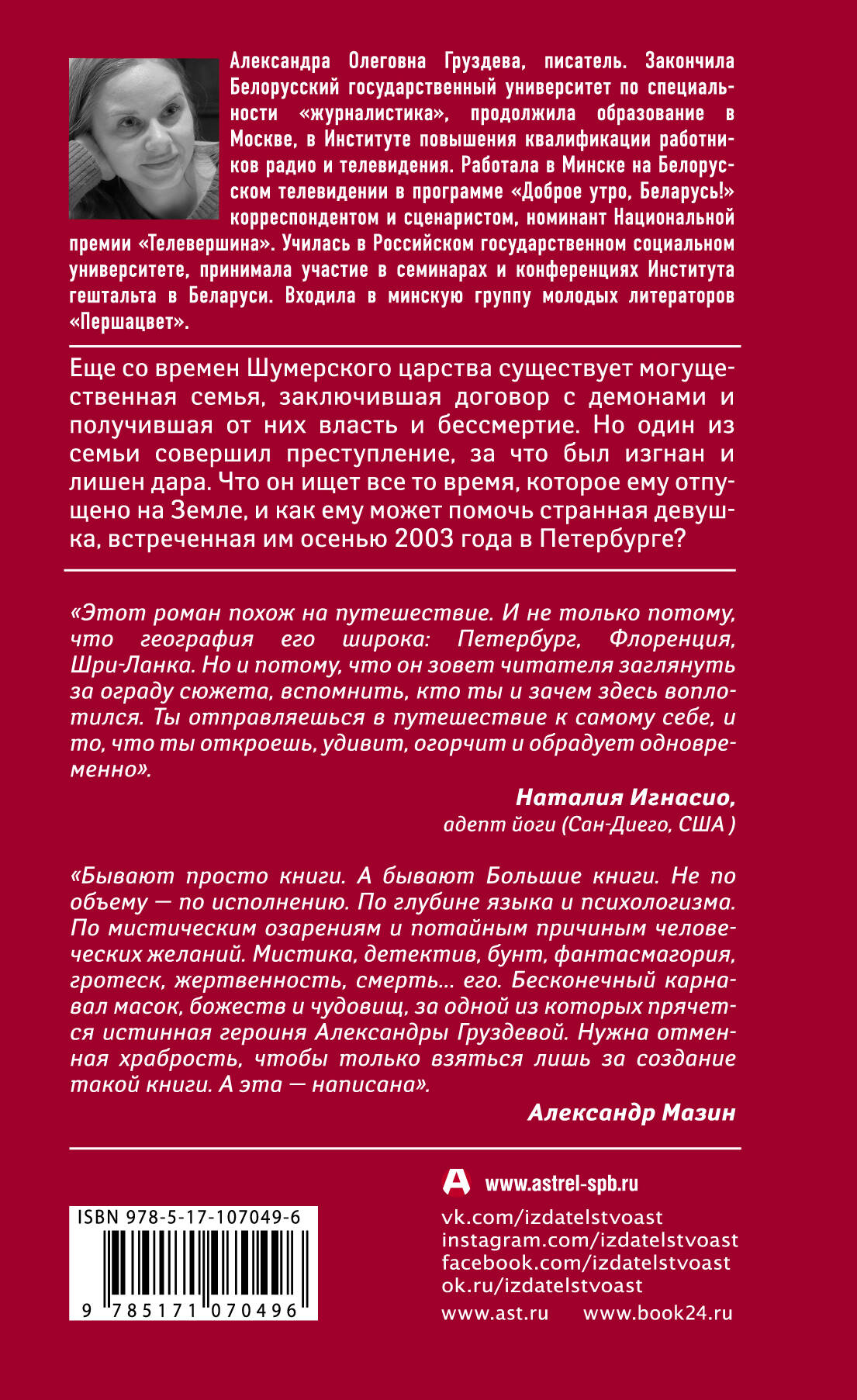 Еще со времен Шумерского царства существует могущественная семья, заключившая договор с демонами и получившая от них власть и бессмертие. Но один из семьи совершил преступление, за что был изгнан и лишен дара. Что он ищет все то время, которое ему отпущено на Земле, и как ему может помочь странная девушка, встреченная им осенью 2003 года в Петербурге?| Издательство | ИЗДАТЕЛЬСТВО "АСТ" |