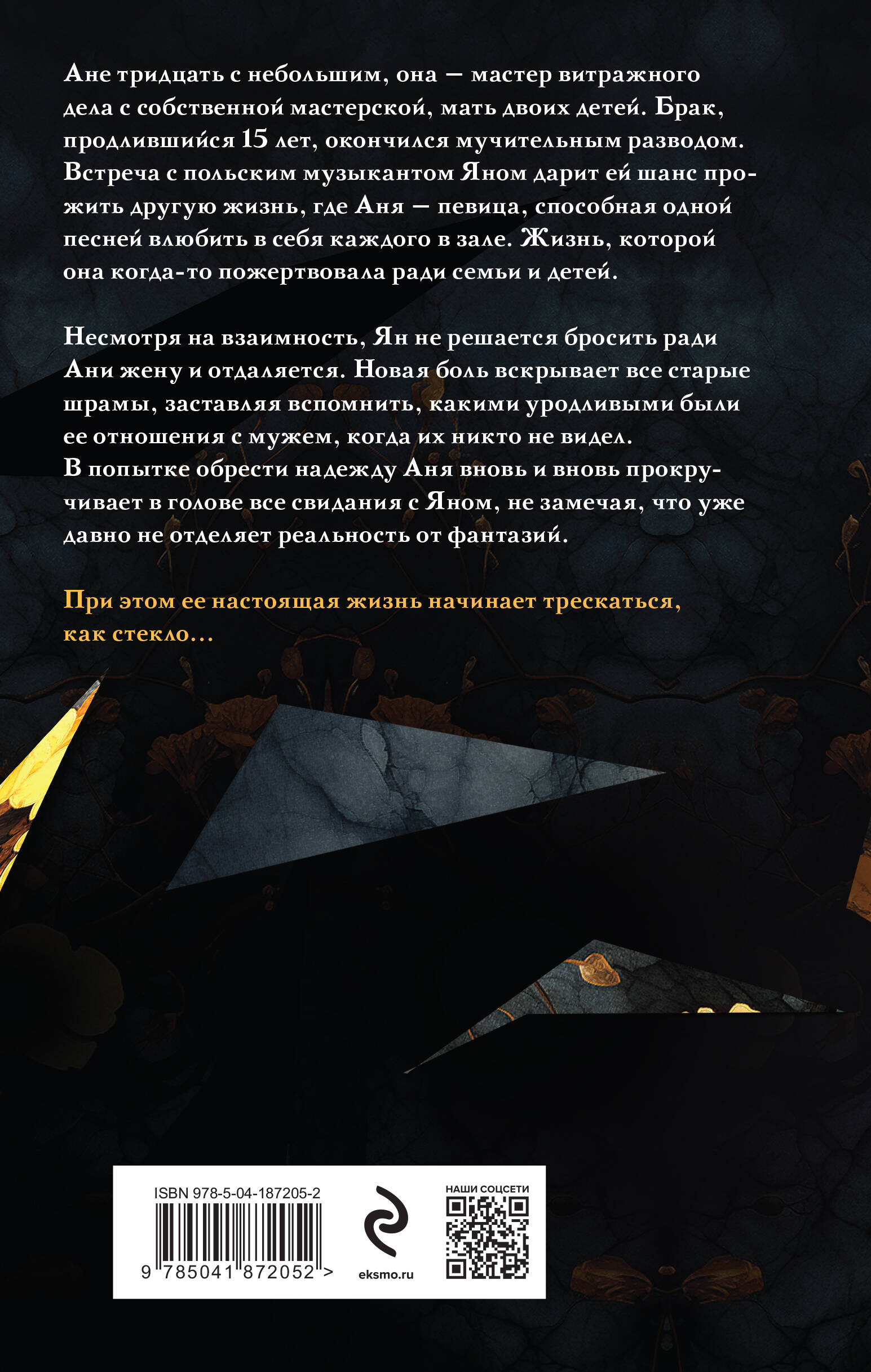 Длинный список «Большой книги» 2024. Ане тридцать с небольшим, она - мастер витражного дела с собственной мастерской, мать двоих детей. Брак, продлившийся 15 лет, окончился мучительным разводом. Встреча с польским музыкантом Яном дарит ей шанс прожить другую жизнь, где Аня - певица, способная одной песней влюбить в себя каждого в зале. Жизнь, которой она когда-то пожертвовала ради семьи и детей. Несмотря на взаимность, Ян не решается бросить ради Ани жену и отдаляется. Новая боль вскрывает все старые шрамы, заставляя вспомнить, какими уродливыми были ее отношения с мужем, когда их никто не видел. В попытке обрести надежду, Аня вновь и вновь прокручивает в голове все свидания с Яном, не замечая, что уже давно не отделяет реальность от фантазий. При этом ее настоящая жизнь начинает трескаться, как стекло…| Издательство | ООО "Издательство "Эксмо" |