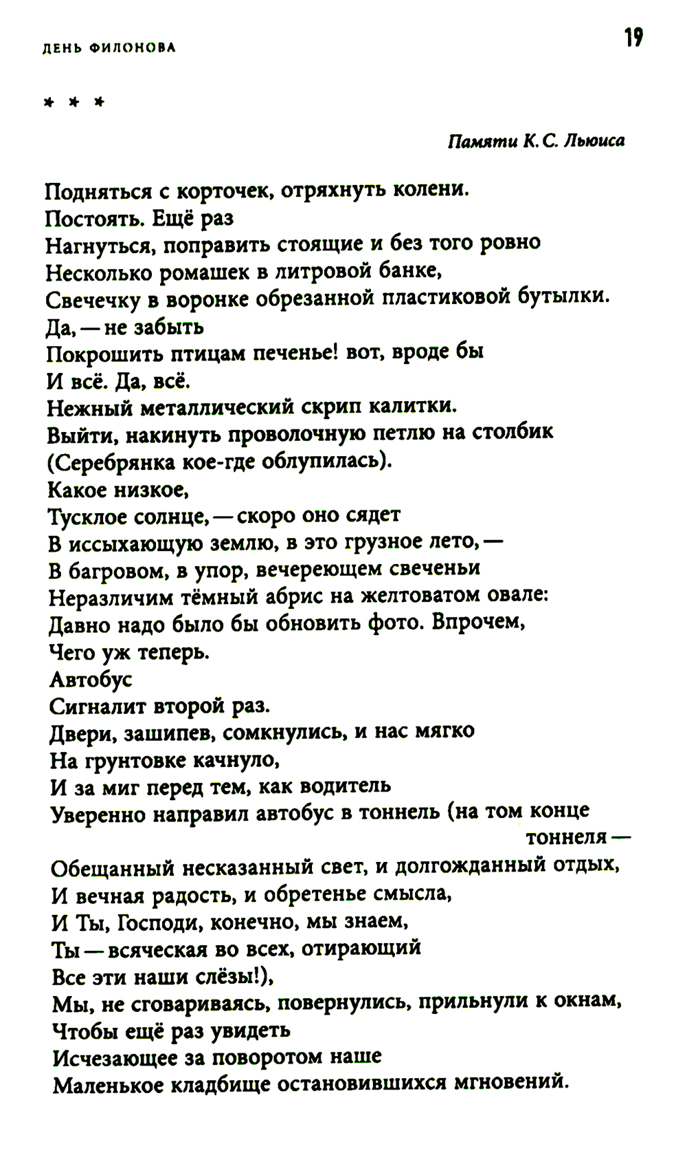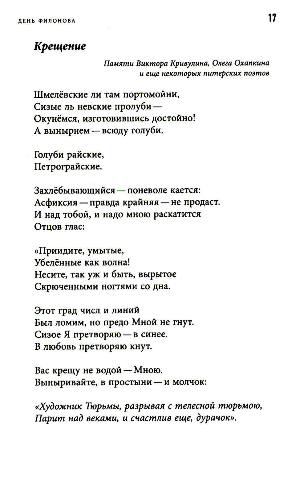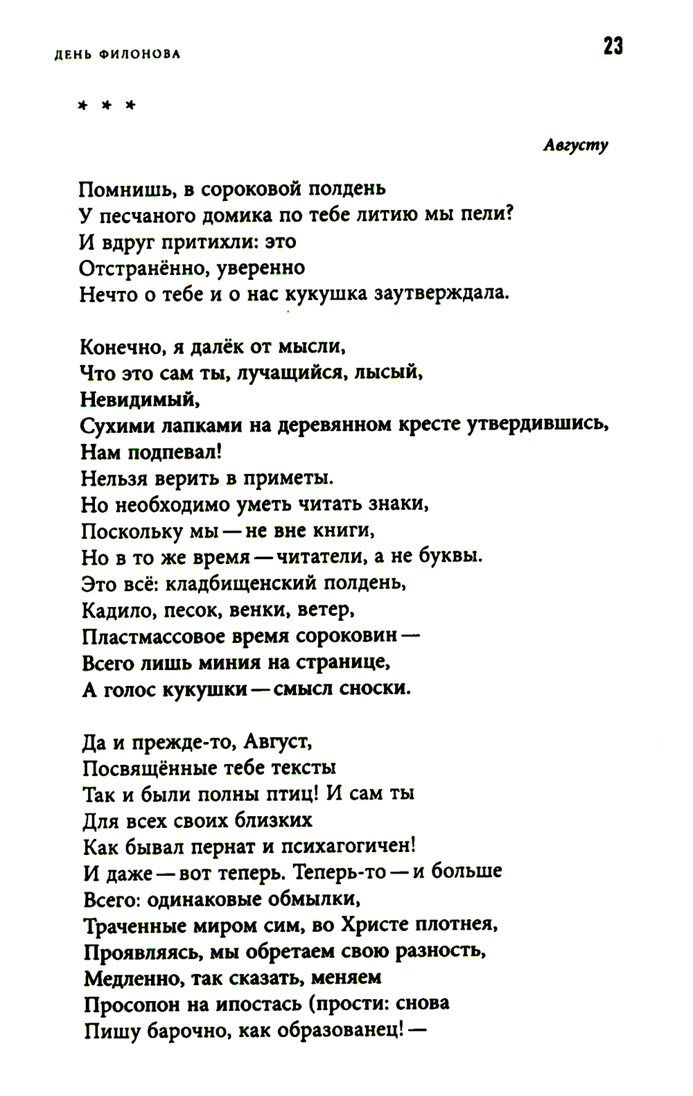 "День Филонова" Сергея Круглова включает в себя посвящения явлениям литературы и искусства, поэтам, художникам, музыкантам - предтечам и соратникам, - объединенные в своеобразный оммаж мировой культуре, чьи основания и само существование сегодня поставлены под вопрос. Лежащий на поверхности штамп, нередко применяемый к этому жанру, - "плач по уходящей натуре", однако Круглов видит эту натуру живой и способной животворить, и его новый сборник полон индивидуальных, особенных, незабываемых лиц - как смотрящие на зрителя лица на картинах Павла Филонова. Сергей Круглов (р. 1966) - поэт, журналист, эссеист, православный священник, служит в Минусинске Красноярского края. Автор двух десятков книг стихов ("Снятие Змия со Креста"", "Птичий двор", "Народные песни", "Царица Суббота" и других), прозы и христианской публицистики ("Про о. Филофила", "Стенгазета", "Движение к небу"). Лауреат Премии Андрея Белого 2008 года за книги стихов "Зеркальце" (2007) и "Переписчик" (2008), премии "Московский счёт" (2009) и "Anthologia" (2016).