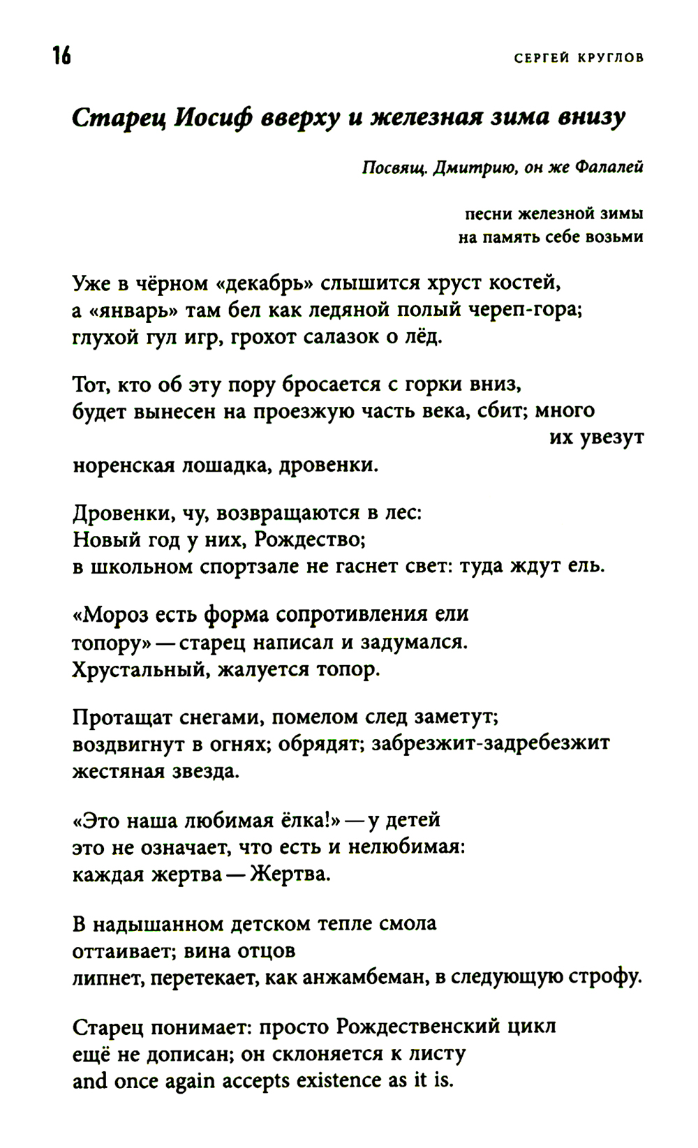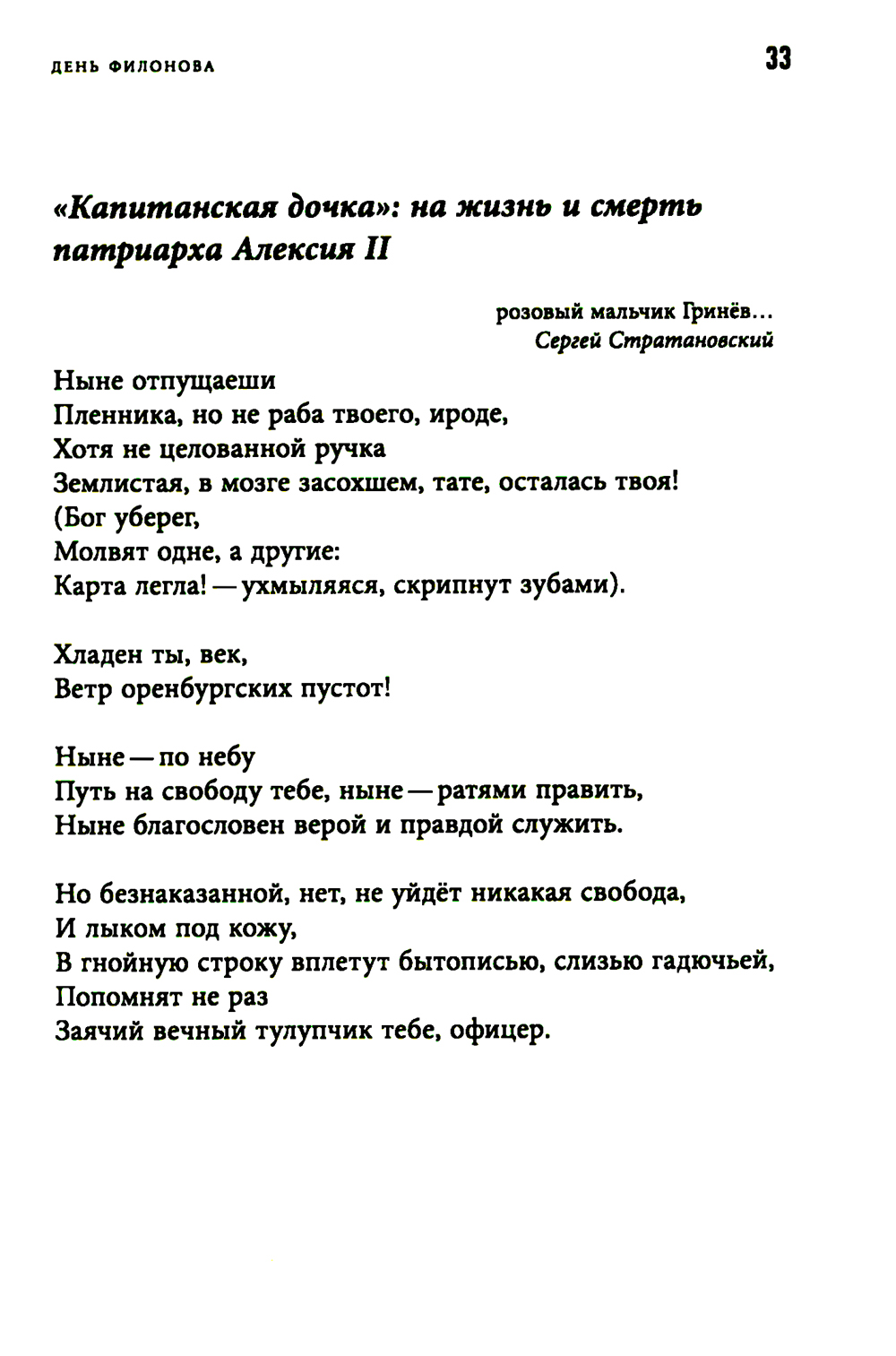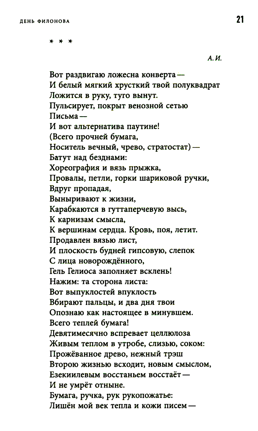 "День Филонова" Сергея Круглова включает в себя посвящения явлениям литературы и искусства, поэтам, художникам, музыкантам - предтечам и соратникам, - объединенные в своеобразный оммаж мировой культуре, чьи основания и само существование сегодня поставлены под вопрос. Лежащий на поверхности штамп, нередко применяемый к этому жанру, - "плач по уходящей натуре", однако Круглов видит эту натуру живой и способной животворить, и его новый сборник полон индивидуальных, особенных, незабываемых лиц - как смотрящие на зрителя лица на картинах Павла Филонова. Сергей Круглов (р. 1966) - поэт, журналист, эссеист, православный священник, служит в Минусинске Красноярского края. Автор двух десятков книг стихов ("Снятие Змия со Креста"", "Птичий двор", "Народные песни", "Царица Суббота" и других), прозы и христианской публицистики ("Про о. Филофила", "Стенгазета", "Движение к небу"). Лауреат Премии Андрея Белого 2008 года за книги стихов "Зеркальце" (2007) и "Переписчик" (2008), премии "Московский счёт" (2009) и "Anthologia" (2016).