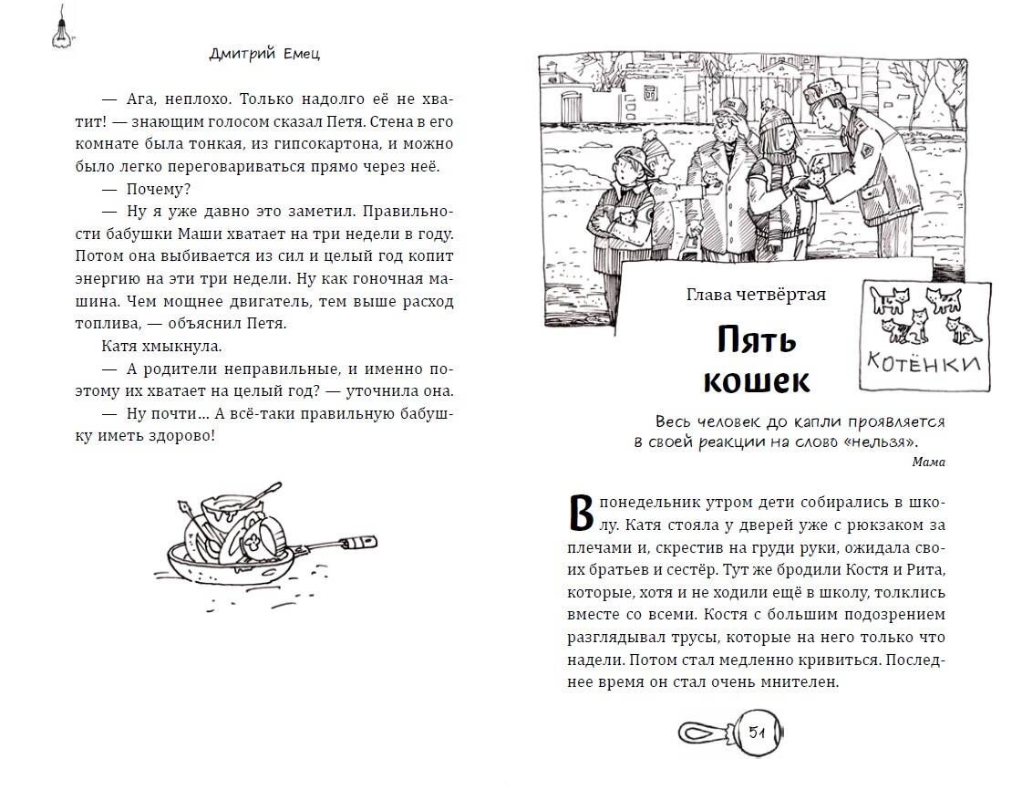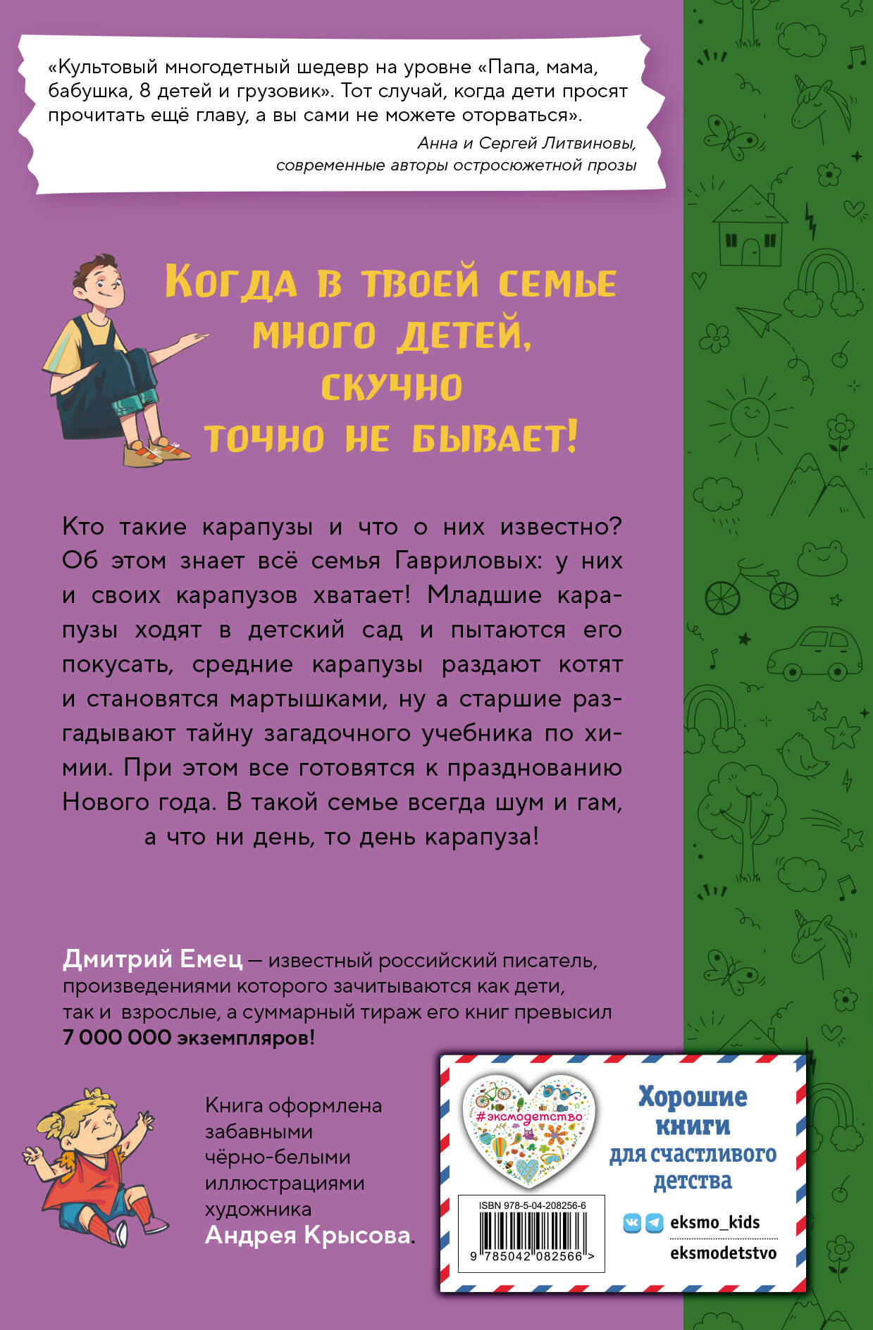 Возвращение замечательной семейной серии от известного автора Дмитрия Емца в новом оформлении! Когда в твоей семье много детей, скучно точно не бывает! Кто такие карапузы и что о них известно? Об этом знает всё семья Гавриловых, у них и своих карапузов хватает! Младшие карапузы ходят в детский сад и пытаются его покусать, средние карапузы раздают котят и становятся мартышками, ну а старшие разгадывают тайну загадочного учебника по химии. При этом все готовятся к празднованию Нового года. В такой семье всегда шум и гам, а что ни день, то день карапуза! Книга проиллюстрирована забавными чёрно-белыми рисунками художника Андрея Крысова, а яркие и стильные обложки будут отлично смотреться на любой полке! Крупный шрифт, белая бумага внутри! Подойдёт для самостоятельного чтения, внеклассного чтения, а также для чтения со взрослыми. ЦА: дети от 9 лет и взрослые.| Издательство | ООО "Издательство "Эксмо" |