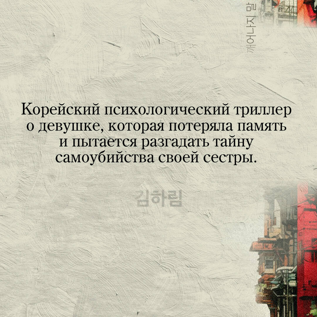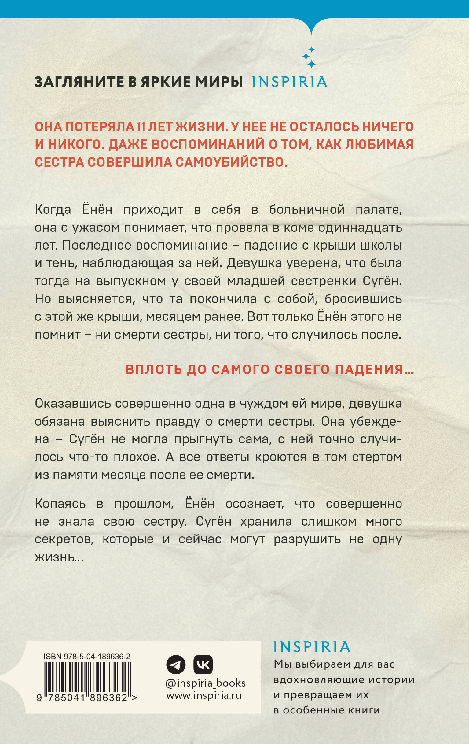 НАСТОЯЩИЙ КОРЕЙСКИЙ ТРИЛЛЕР О ТАЙНАХ ПОДСОЗНАНИЯ И БЕЗГРАНИЧНОЙ СЕСТРИНСКОЙ ЛЮБВИ. Она не помнит 11 лет жизни. У нее не осталось ничего и никого. Даже воспоминаний о том, как любимая сестра совершила самоубийство. Когда Ёнён приходит в себя в больничной палате, она с ужасом понимает, что провела в коме одиннадцать лет. Последнее воспоминание - падение с крыши школы и тень, наблюдающая за ней. Девушка уверена, что была тогда на выпускном у своей младшей сестренки Сугён. Но выясняется, что та покончила собой, бросившись с этой же крыши, месяцем ранее. Вот только Ёнён этого не помнит - ни смерть сестры, ни того, что случилось после. Вплоть до самого своего падения… Оказавшись совершенно одна в чуждом ей мире, девушка обязана выяснить правду о смерти сестры. Она убеждена - Сугён не могла прыгнуть сама, с ней точно случилось что-то плохое. А все ответы кроются в том стертом из памяти месяце после ее смерти. Копаясь в прошлом, Ёнён осознает, что совершенно не знала свою сестру. Сугён хранила слишком много секретов, которые и сейчас могут разрушить не одну жизнь...| Издательство | ООО "Издательство "Эксмо" |