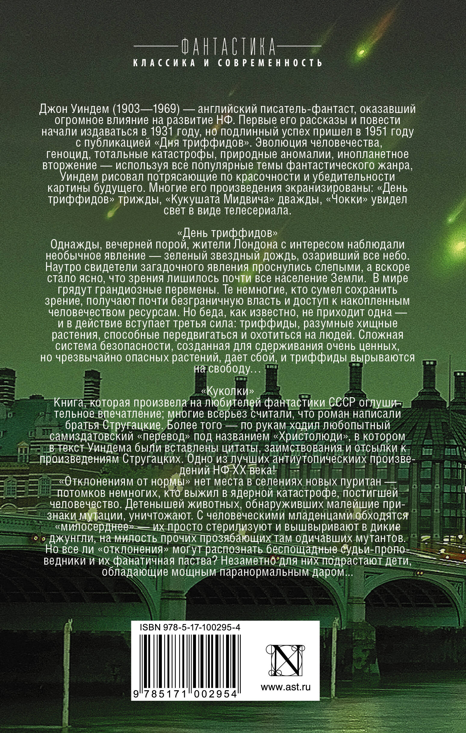 "День триффодов" Однажды, вечерней порой, жители Лондона с интересом наблюдали необычное явление - зеленый звездный дождь, озаривший все небо. Наутро свидетели загадочного явления проснулись слепыми, а вскоре стало ясно, что зрения лишилось почти все население Земли. В мире грядут большие перемены. Те немногие, кто сумел сохранить зрение, получают почти безграничную власть и доступ к накопленным человечеством ресурсам. Но беда, как известно, не приходит одна - и в действие вступает третья сила: триффиды, разумные хищные растения, способные передвигаться и охотиться на людей. Сложная система безопасности, созданная для сдерживания очень ценных, но чрезвычайно опасных растений, дает сбой, и триффиды вырываются на свободу… "Куколки" Книга, которая произвела на любителей фантастики СССР оглушительное впечатление; многие всерьез считали, что роман написали братья Стругацкие. Более того - по рукам ходил любопытный самиздатовский "перевод" под названием "Христолюди", в котором в текст Уиндема были вставлены цитаты, заимствования и отсылки к произведениям Стругацких. Одно из лучших антиутопическиих произведений НФ XX века! "Отклонениям от нормы" нет места в селениях новых пуритан - потомков немногих, кто выжил в ядерной катастрофе, постигшей человечество. Детенышей животных, обнаруживших малейшие признаки мутации, уничтожают. С человеческими младенцами обходятся "милосерднее" - их просто стерилизуют и вышвыривают в дикие джунгли, на милость прочих прозябающих там одичавших мутантов. Но все ли "отклонения" могут распознать беспощадные судьи-проповедники и их фанатичная паства? Незаметно для них подрастают дети, обладающие мощным паранормальным даром...| Издательство | ИЗДАТЕЛЬСТВО "АСТ" |